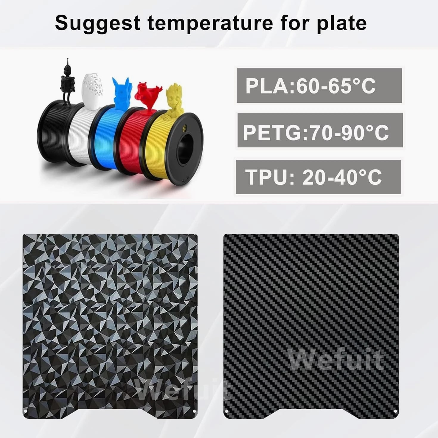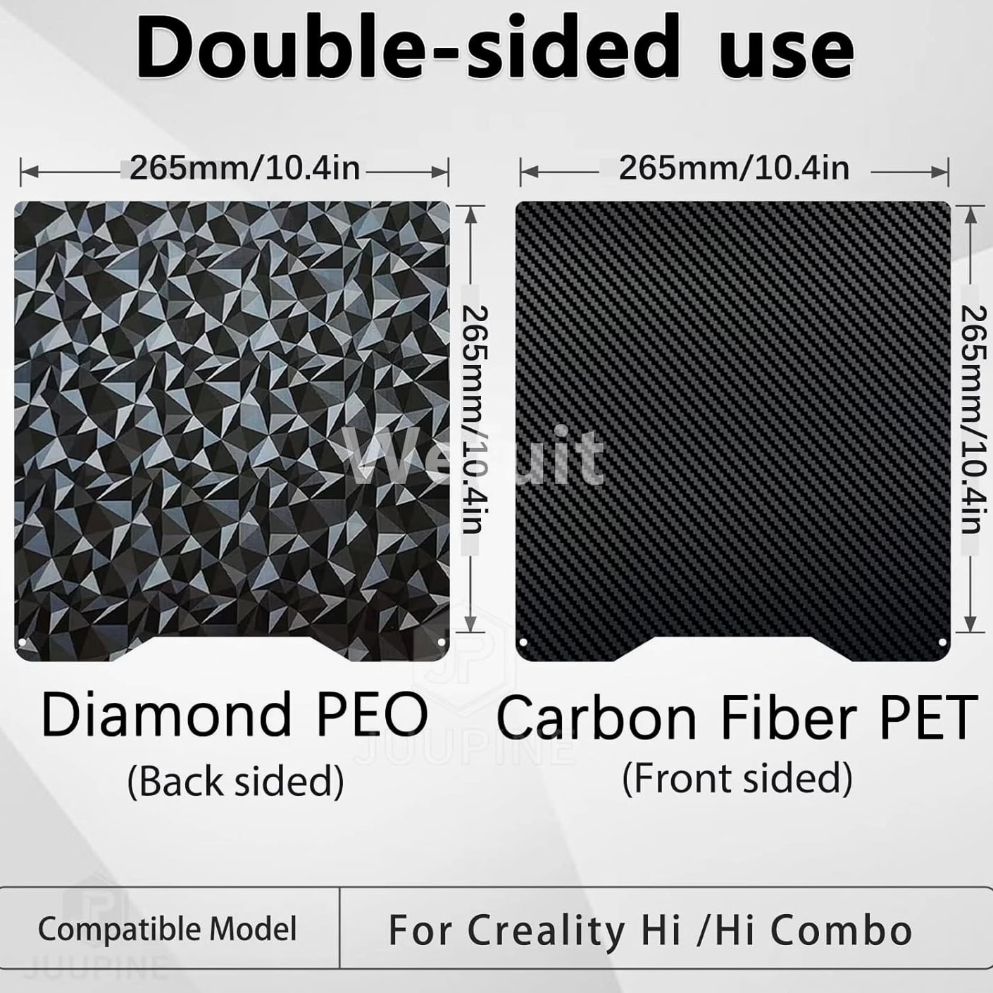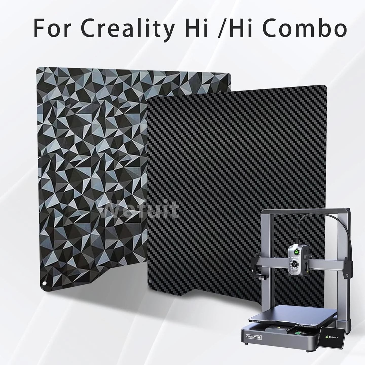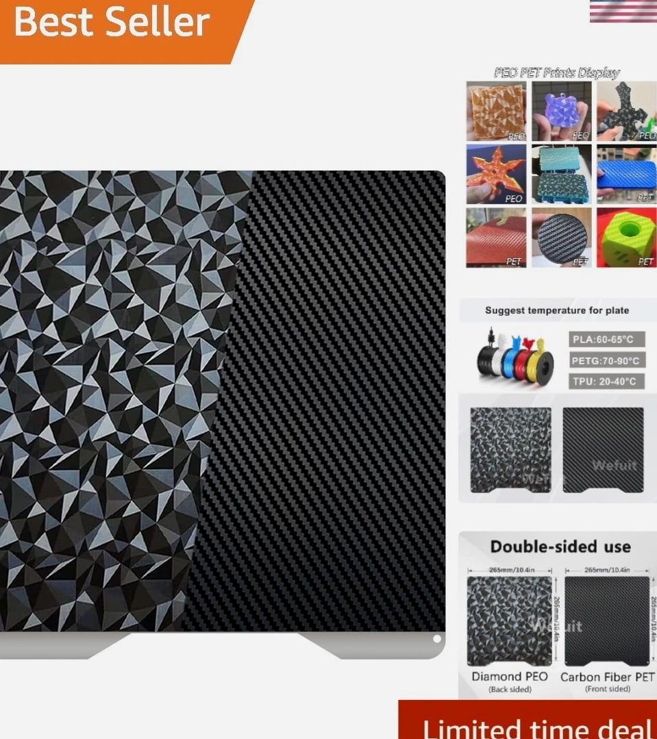 3D Printer Build Plate PET PEO Double Sided Textured Steel Sheet for Creality Hi Upgrade your 3D printing experience with our PET+PEO Double Sided Textured Build Plate, specially designed for Creality Hi/Hi Combo printers. Crafted from high-quality elastic steel, this versatile plate features two distinct textures on each side, offering practical solutions for different printing needs. One side is covered with PET material showcasing a unique carbon fiber texture, perfect for achieving a smooth, professional finish. The other side boasts a diamond pattern surface, ideal for creating stunning diamond-patterned prints. Switch effortlessly between textures to enhance your creativity without needing multiple build plates. Constructed from stainless steel, this build plate is heat-resistant, highly elastic, rust-proof, and durable, ensuring long-lasting performance. The upgraded surface film provides better adhesion, increased flatness, and resistance to bubbling, making it suitable for repeated use with filament temperatures up to 150°C—compatible with PLA, TPU, PETG, and other filaments (adjust printer parameters for different materials). The 265x265mm platform size makes it a perfect fit for compatible 3D printers like Creality Hi and Hi Combo, providing a reliable, efficient printing surface. Easy to maintain and install, simply peel off the protective film, clean the surface with alcohol, and carefully level the plate before use. Cooling the plate before removing your model prevents damage to the coating, and bending the spring steel allows effortless removal without tools or damage. This flexible, removable surface helps minimize print failures and simplifies post-processing. Suitable for home, hobby, and professional 3D printing environments, this build plate enhances print quality while offering great convenience. Free & Fast Shipping - We offer free shipping to most of the USA with a normal delivery time of 3-7 days.