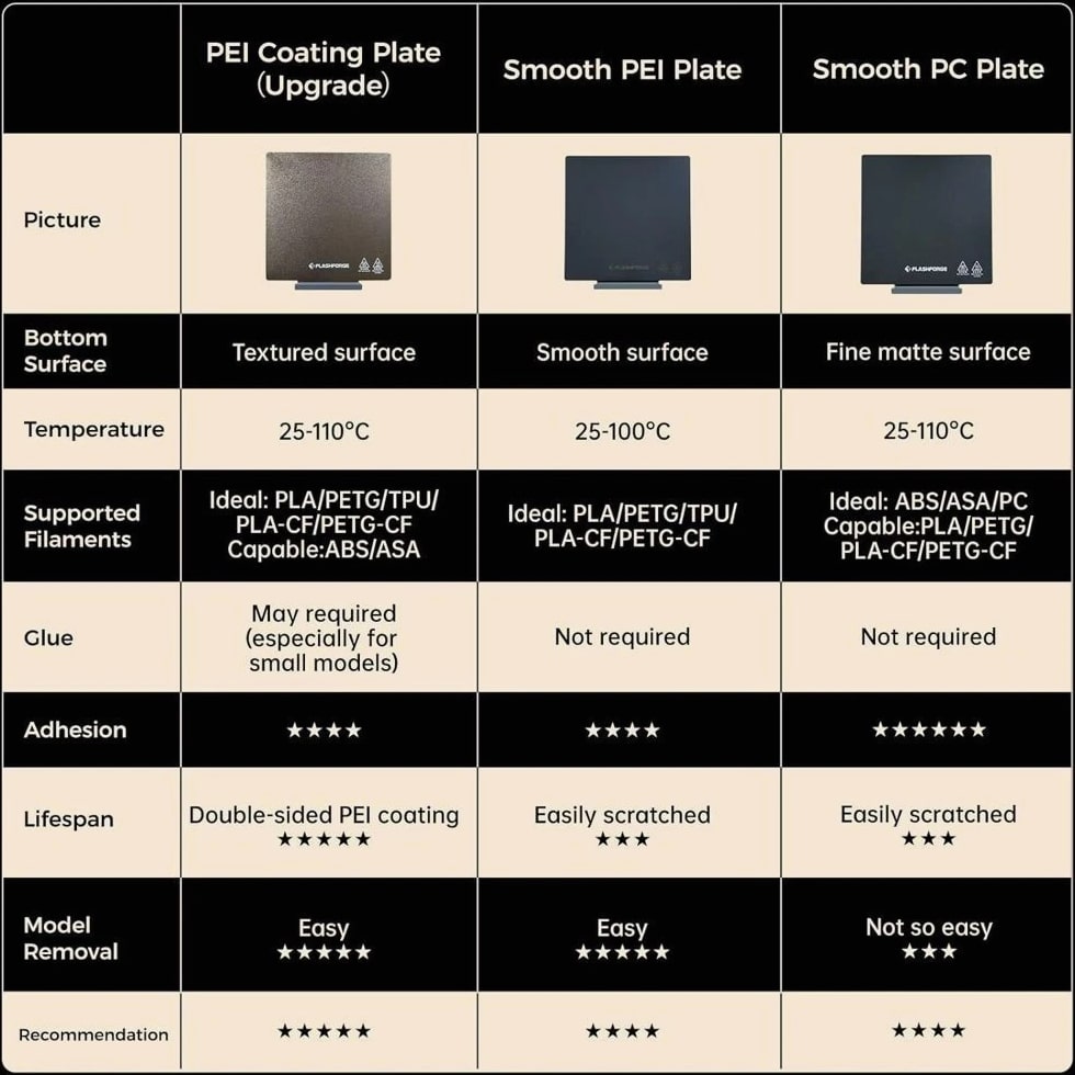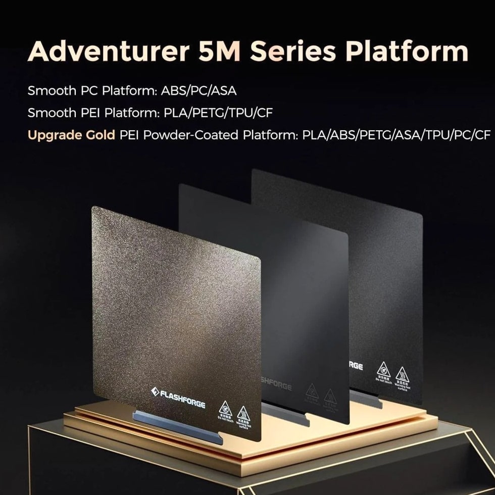 Adventurer 5M Adventurer 5M Pro Filament Adventurer 5X FLASHFORGE 3D Printer Printing Build Plate Sheet PEI for Adventurer 5M / Pro Replacement Platform Build Plate for AD5M Adventurer 5M / 5M Pro Multi-Platform Options: Original PEI Powder Coated, Optional Smooth PEI Sticker, Optional Smooth PC sticker plates. Tailor your 3D printing experience by choosing the perfect platform to meet your unique needs. PEI Powder-Coated Platform: It boasts a distinctive textured surface that imparts a unique finish to the bottom of your models. It sets itself apart, although it's worth noting that for certain filaments, the application of glue may be necessary. Smooth PEI Platform: This platform features a smooth surface that facilitates a flawless bottom finish for printed models. Offering excellent adhesion for PLA, PETG, and TPU, without the need for glue. Smooth PC Platform: With high-temperature stability, this platform is suitable for advanced printing with materials like ABS, PC, and ASA. Additionally, it exhibits exceptional strength and hardness, making it an ideal choice for printing robust and durable materials. Effortless Model Removal: Simply cool to room temperature, and the model effortlessly separates from the build plate. However, bending the platform is necessary when removing models from a PC platform. Payment: We accept payments via PayPal, Venmo, Apple Pay, Google Pay, Visa, Master Card, Discover, Alipay, Union Pay and Diners Club. Shipping: FREE Shipping (add tracking #) within the contiguous 48 states from Official CA/NJ/TX/KY warehouses. Note that it takes longer at weekends and public holidays. 1. USPS 2. FedEx 3. UPS 4. OnTrac Warranty: We offer 1-year limited coverage and 30 Days Free Returns. Genuine Products Brand New in Box with Official Warranty and Support.
