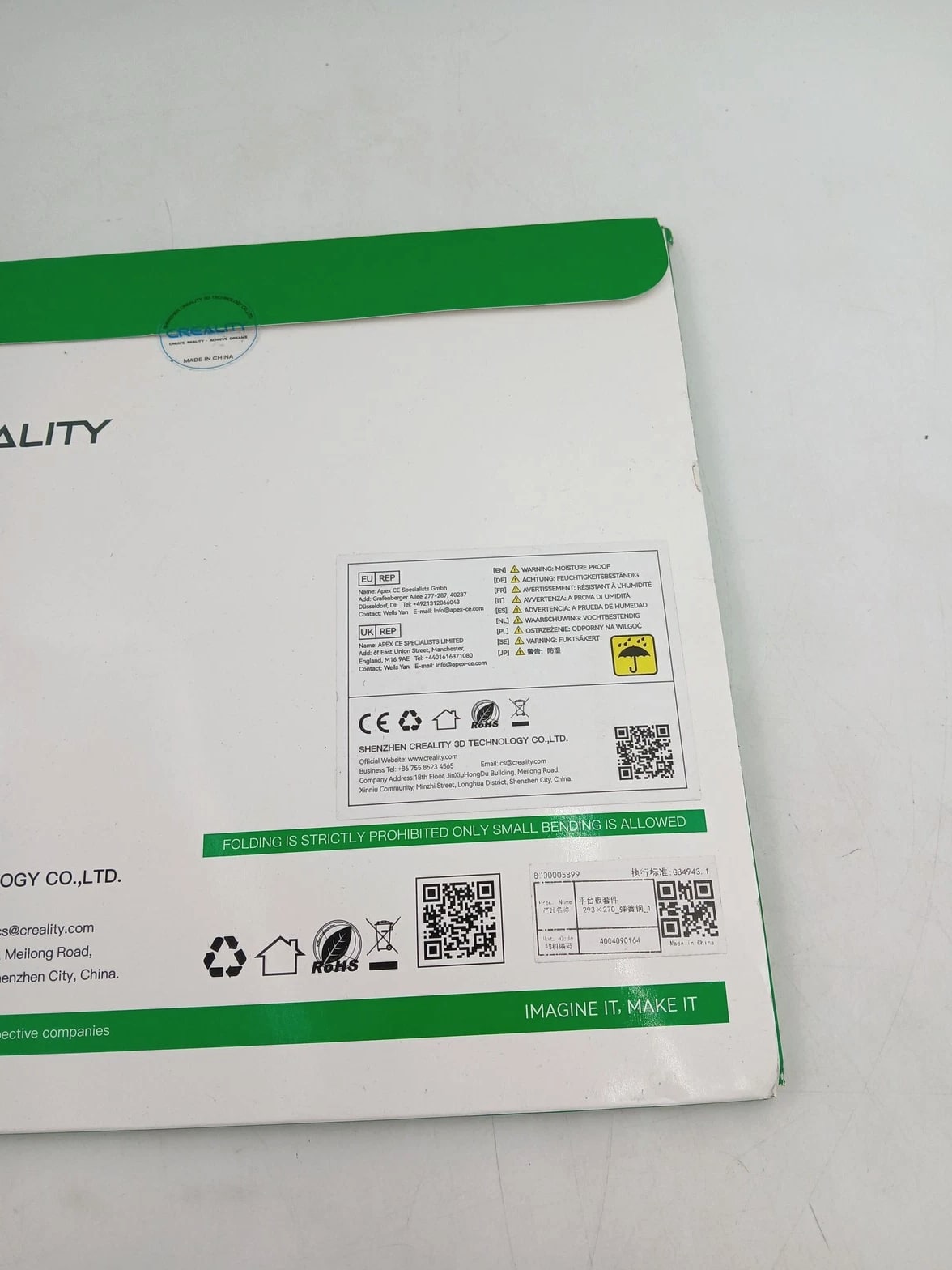 Creality K2 Build Plate Textured PEI Sheet Double Sided Flexible 3D Printer Gold Brand: Creality 3D Printer Bed Plate Gold Without Magnetic Base Color: Black heated printing surface; outer packaging is black with green accents Intended use: Replacement or upgrade heated bed / build surface for compatible Creality 3D printers Packaging text and design: Front sleeve shows the Creality logo, a rectangular outline indicating the bed area, and company name "SHENZHEN CREALITY 3D TECHNOLOGY CO., LTD." printed along the edge. Warning and slogan text on back: Green banner reads "FOLDING IS STRICTLY PROHIBITED ONLY SMALL BENDING IS ALLOWED", and lower edge carries the phrase "IMAGINE IT, MAKE IT" along with recycling and regulatory icons. Country of origin / manufacturer: Shenzhen Creality 3D Technology Co., Ltd., China. Unit quantity and type: Listing is for one Creality heated bed / print surface supplied in the original cardboard sleeve-style packaging. Keywords: Creality heated bed, black 3D printer build plate, Creality print surface upgrade, replacement heated build sheet for Creality 3D printers Top-Notch Customer Service: Your satisfaction is our foremost goal! Competitive Prices: Get the best deals around! Trusted by Many: Our customers love us, and their feedback will show it! Quality Guaranteed: We ensure every product meets high standards. Swift Delivery: Fast, reliable shipping to your doorstep. Your Feedback Matters Happy with Your Purchase? We'd love to hear your positive feedback! Quick Dispatch: Order will ship within 1 business day of receiving. Estimated Delivery: We will ship almost all items within 1 business day and take 2-5 days depending on shipping service. On rare occasion, USPS or FedEx may delay a package. Please understand this is out of our control. If you would like an express delivery option, please message us and add note to order.