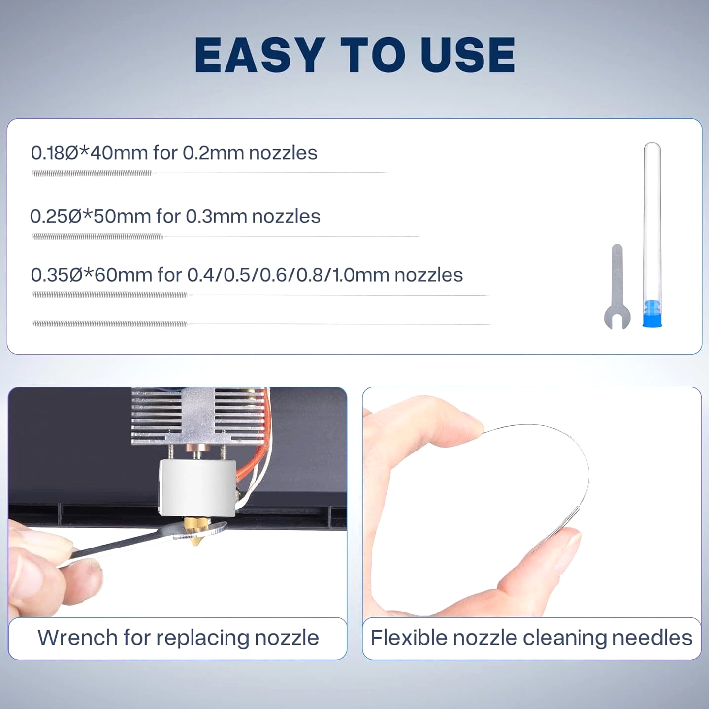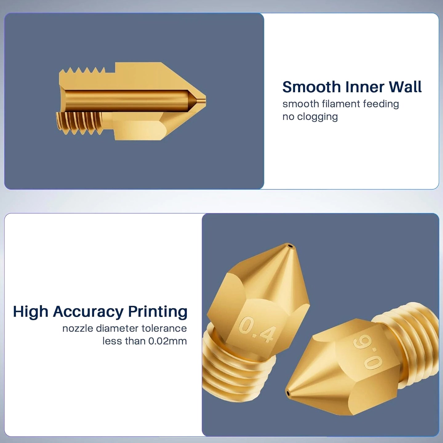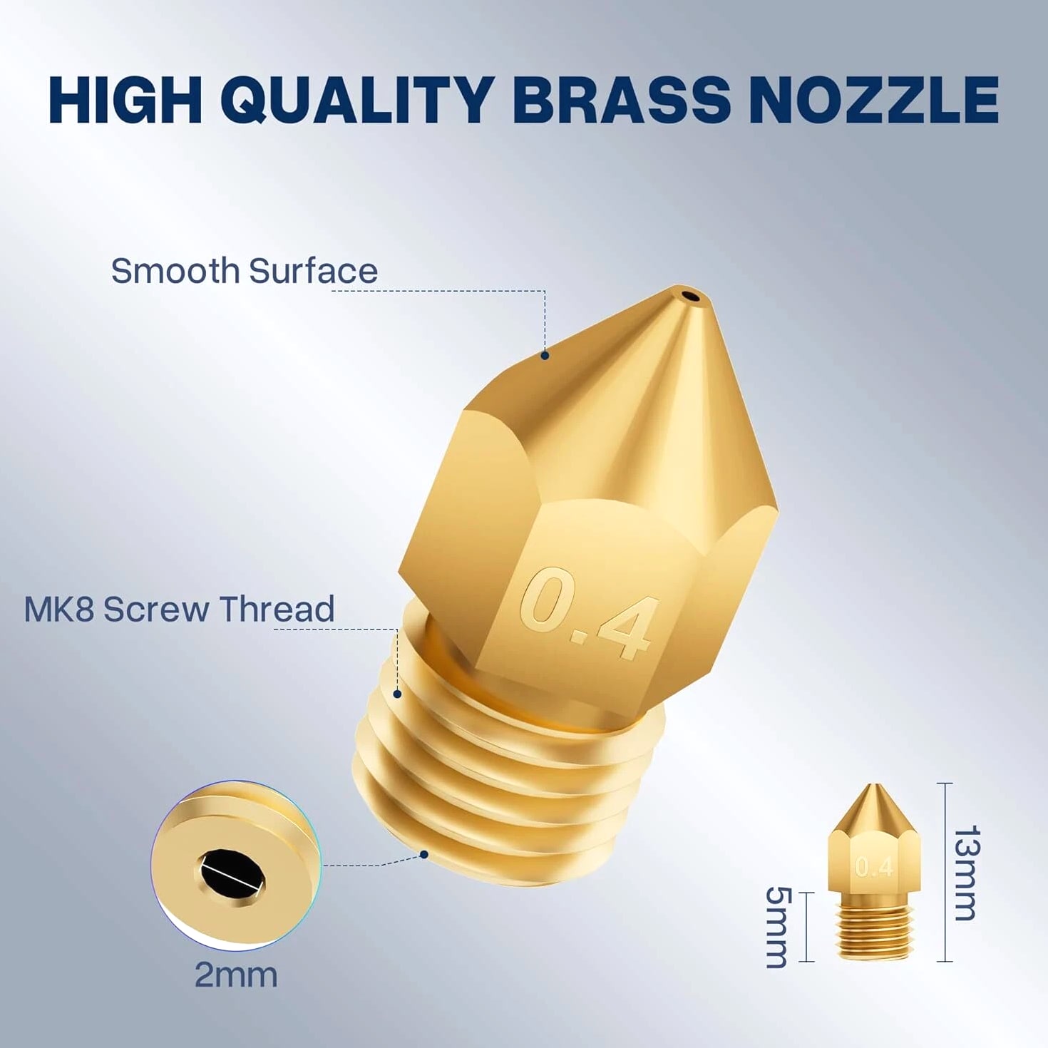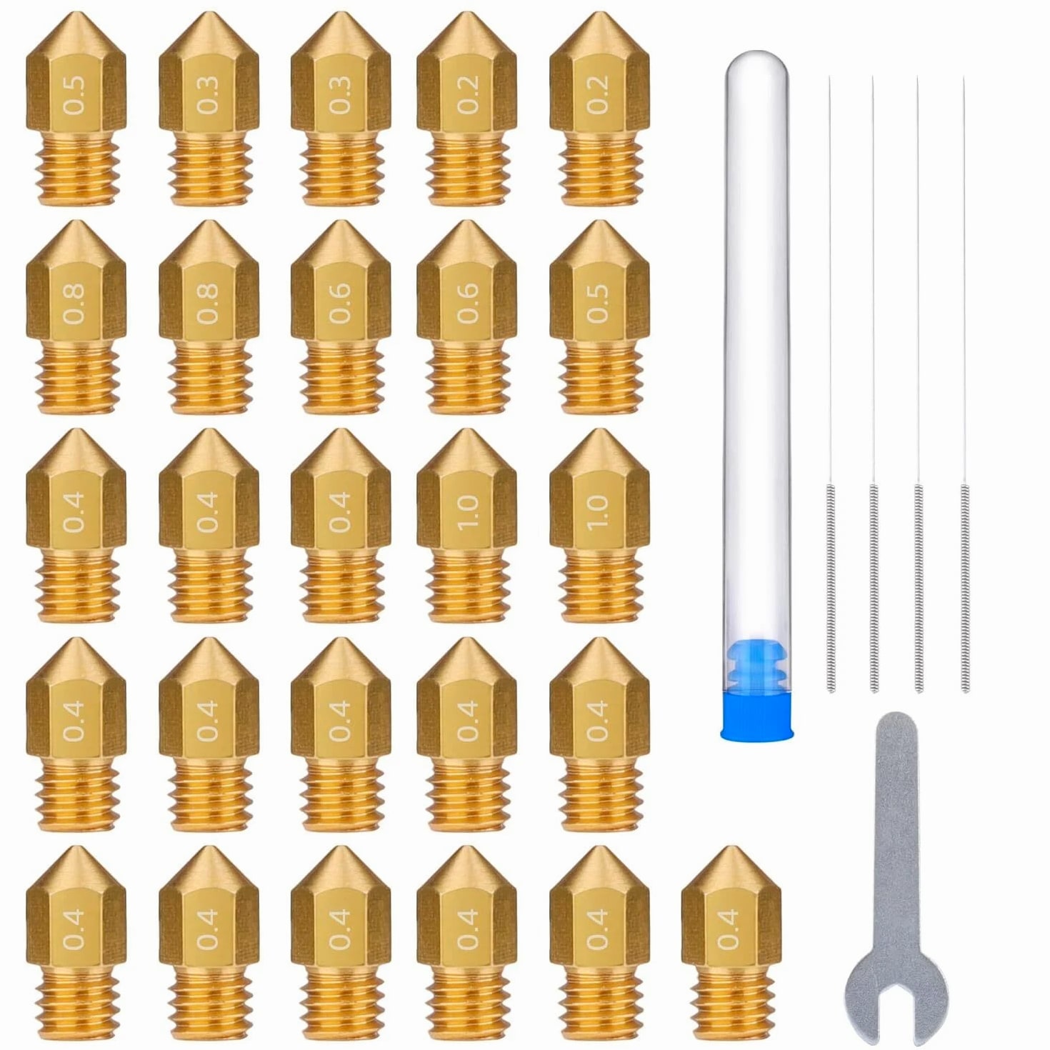 Product Description Key Features Color: Gold Material: Brass Input Diameter: 1.75 mm Package Contents: 14 pieces 0.4mm nozzles 2 pieces 0.2mm nozzles 2 pieces 0.3mm nozzles 2 pieces 0.5mm nozzles 2 pieces 0.6mm nozzles 2 pieces 0.8mm nozzles 2 pieces 1mm nozzles 1 piece nozzle wrench 4 pieces needles of different sizes for nozzle cleaning Important Notes: After replacing the nozzle, please recalibrate the distance between nozzle and build plate to ensure print quality. Keep away from children.