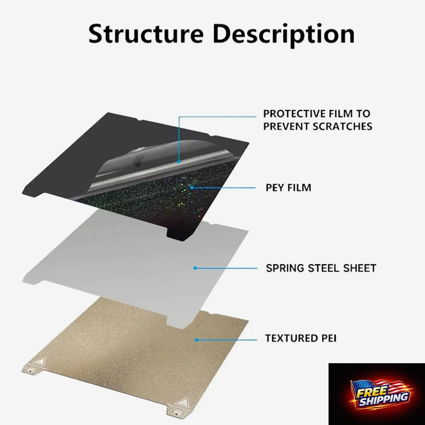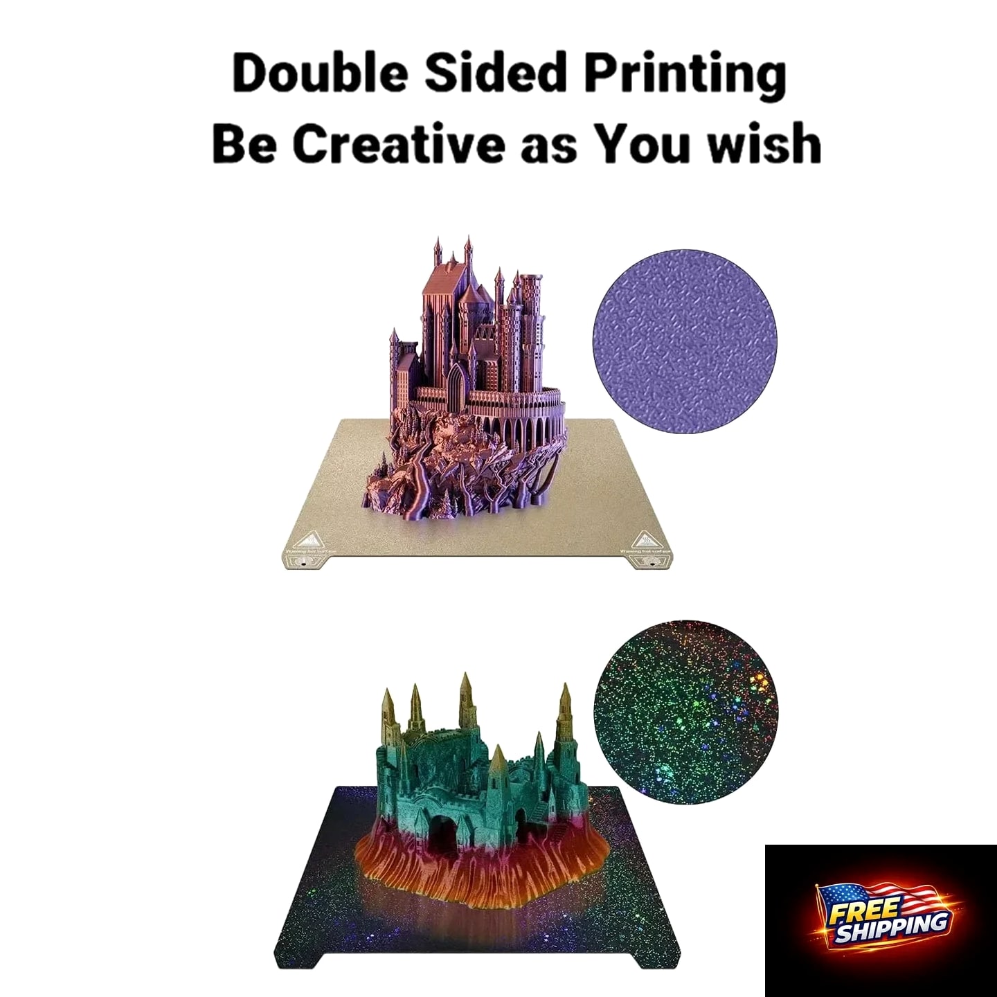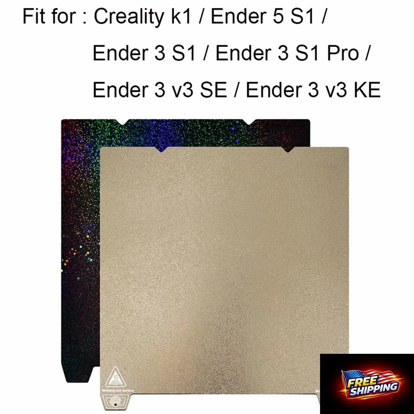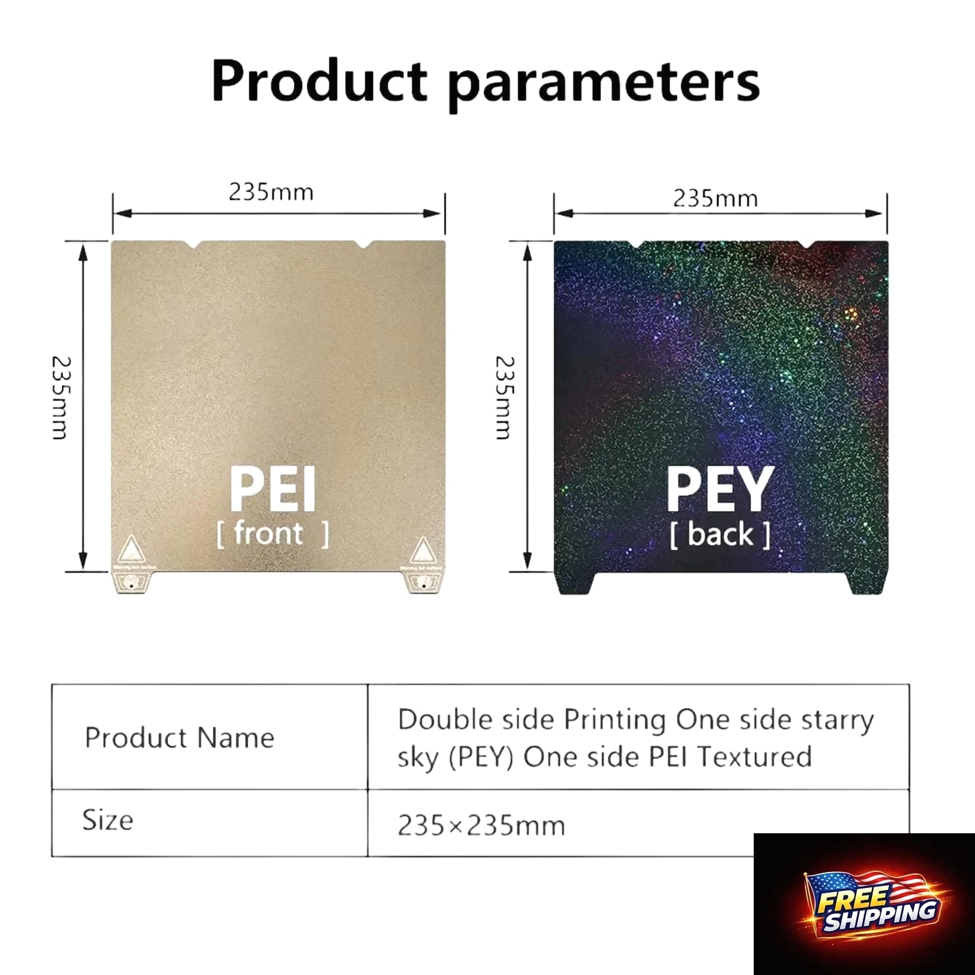 235x235mm 3D Printer Build Plate Textured PEI Spring Steel Sheet & Smooth Surface 【Professional Dual-Surface Design】One side with textured PEI for strong adhesion and matte finish effect, the other with ultra-smooth PEY surface for glossy professional-grade prints. Achieve 360° printing versatility. 【Precision Size & Wide Compatibility】235x235mm (±0.3mm tolerance) compatible with K1/Ender 3 V3 SE/Ender 5 S1/Ender 3 S1 Pro/Ender 3 S1/Ender 3 V2 Neo/Ender 3 V2/Neptune 3 Pro/Neptune 4/Neptune 4 Pro 3D Printer. 【Works with All Filaments – PLA, ABS, PETG & More】Versatile for any project: print intricate miniatures, functional prototypes, or DIY creations. Consistent first-layer adhesion reduces failed prints and material waste. 【Zero Damage Removal Technology】Unique curved edge design allows safe removal of models without scraper tools. Bendable spring steel base protects both model and build surface. 【Industrial-Grade Durability】10,000+ print cycle lifespan resistance. Advanced sandblasted coating prevents scratches and peeling. We offer a 30-Day Return Policy on items which you are not completely satisfied with. You have the option for a full refund or an exchange of the item. Shipping is complimentary to the US and dispatched within 2 business days of payment, usually sooner. UPS express shipping is utilized for rapid delivery, typically arriving within 3 days. We strive to ensure every customer is completely satisfied. If there's a problem, message us—we're happy to help. 24/7 live chat available.
