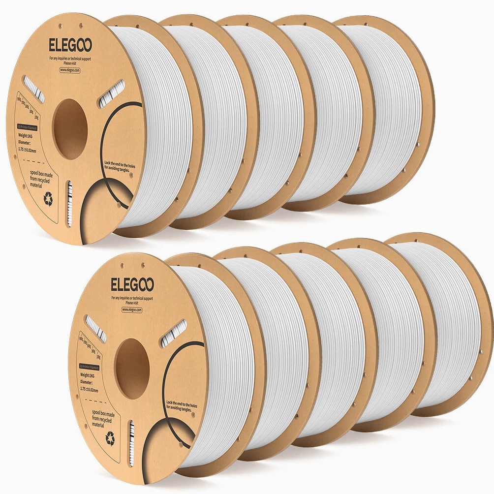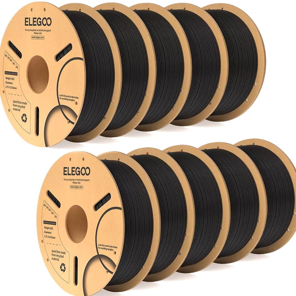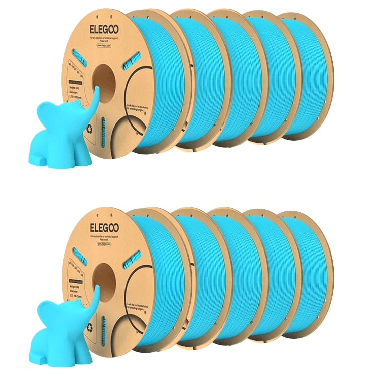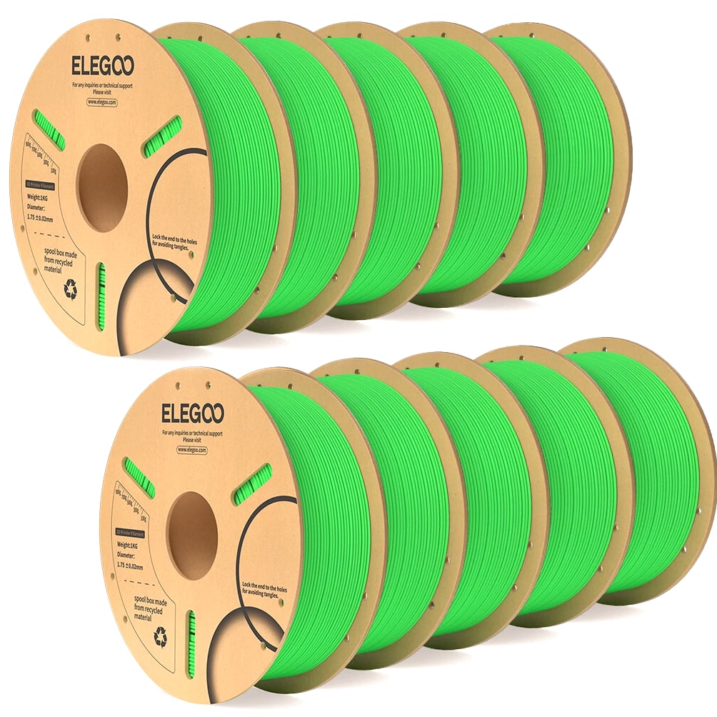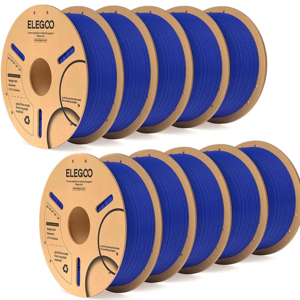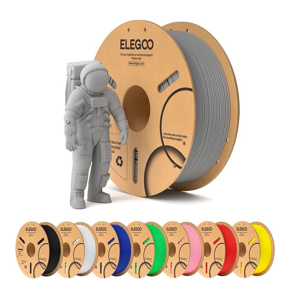 ELEGOO PLA Filament 1.75mm 3D Printer Filament Dimensional Accuracy +/- 0.02mm, Compatible with Most FDM Printers 【High-Quality PLA Filaments】Made of high-quality PLA, a commonly used thermoplastic material featuring lower melting temperature and ease of use, low warp and shrinkage, odorless during printing, and provides a glossy surface finish. 【Clog-Free & Bubble-Free】Designed and manufactured with clog-free properties, superb layer bonding and great fluidity for smooth and stable extrusion. Completely dried for 24 hours before packaging and vacuum sealed with desiccants in the bag to protect the filament from moisture, no clogging and bubbling problems. 【Dimensional Accuracy & Consistency】 Strict tolerances guarantee these PLA filaments of 1.75 mm diameter much smoother and more stable printing with the dimensional accuracy of +/- 0.02 mm; 1 kg spool (2.2lbs). 【Less-Tangle and Easy to Use】Full mechanical winding and strict manual examination to ensure that the line is neatly arranged and less tangled, and to avoid possible snap and line breaking. A larger spool inner diameter design for easy feeding. 【Wide Compatibility】Universal compatibility with most of the common 1.75mm FDM 3D printers on the market due to the high-quality standards in terms of manufacturing accuracy and a small dimensional tolerance of +/- 0.02mm. Technical Specifications Density: 1.20g/Cm³ Melt Index: 14(190°C/2.16kg)G/10min Tensile Strength(X-Y): ≥ 50mpa Elongation At Break(X-Y): 11.2% Bending Strength: 91mpa Bending Modulus: 1913mpa Charpy Impact Strength: 5.4kj/M² Thermal Deformation Temp: 53°C(0.45mpa) Fan: 100% Line Length: (1.75mm) 330-335m Rockwell Hardness: 88 Print Layer Thickness: 0.2mm Recommended Extrusion/Nozzle Temp: 190~220°C(Recommended 205°C) Recommended Heated Bed Temp: 50-65°C Printing Speed: 30-70mm/S Recommendation Platform: PEI/Glass/Fiberglass Board+PVP Glue Stick or Textured Paper