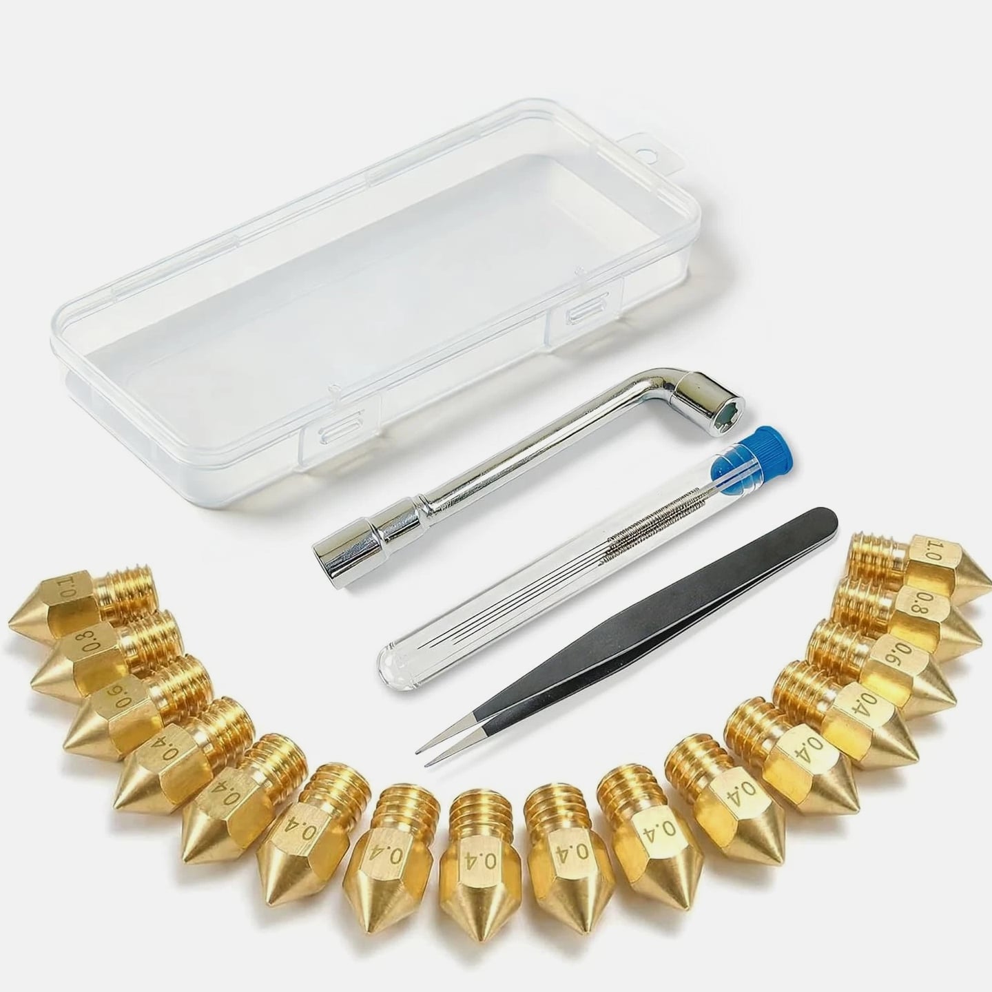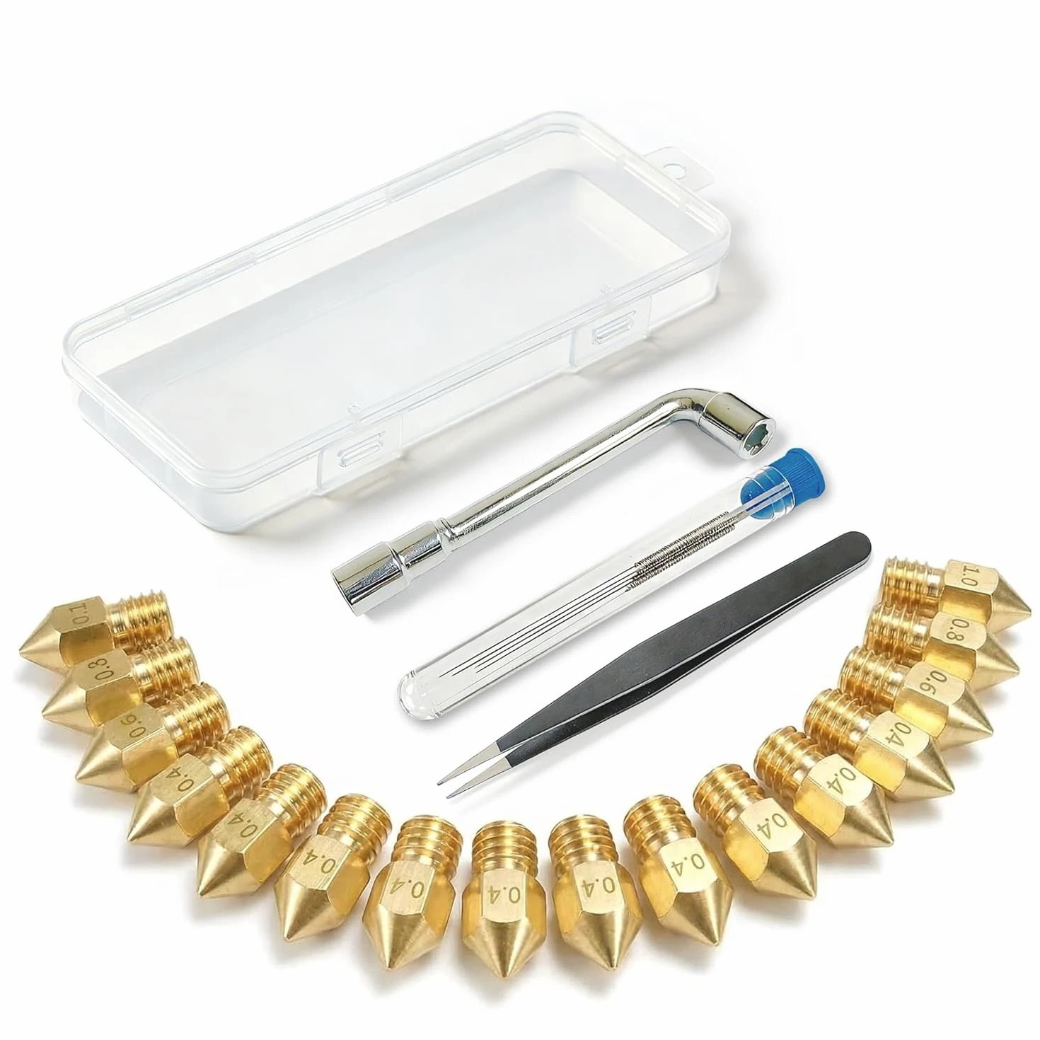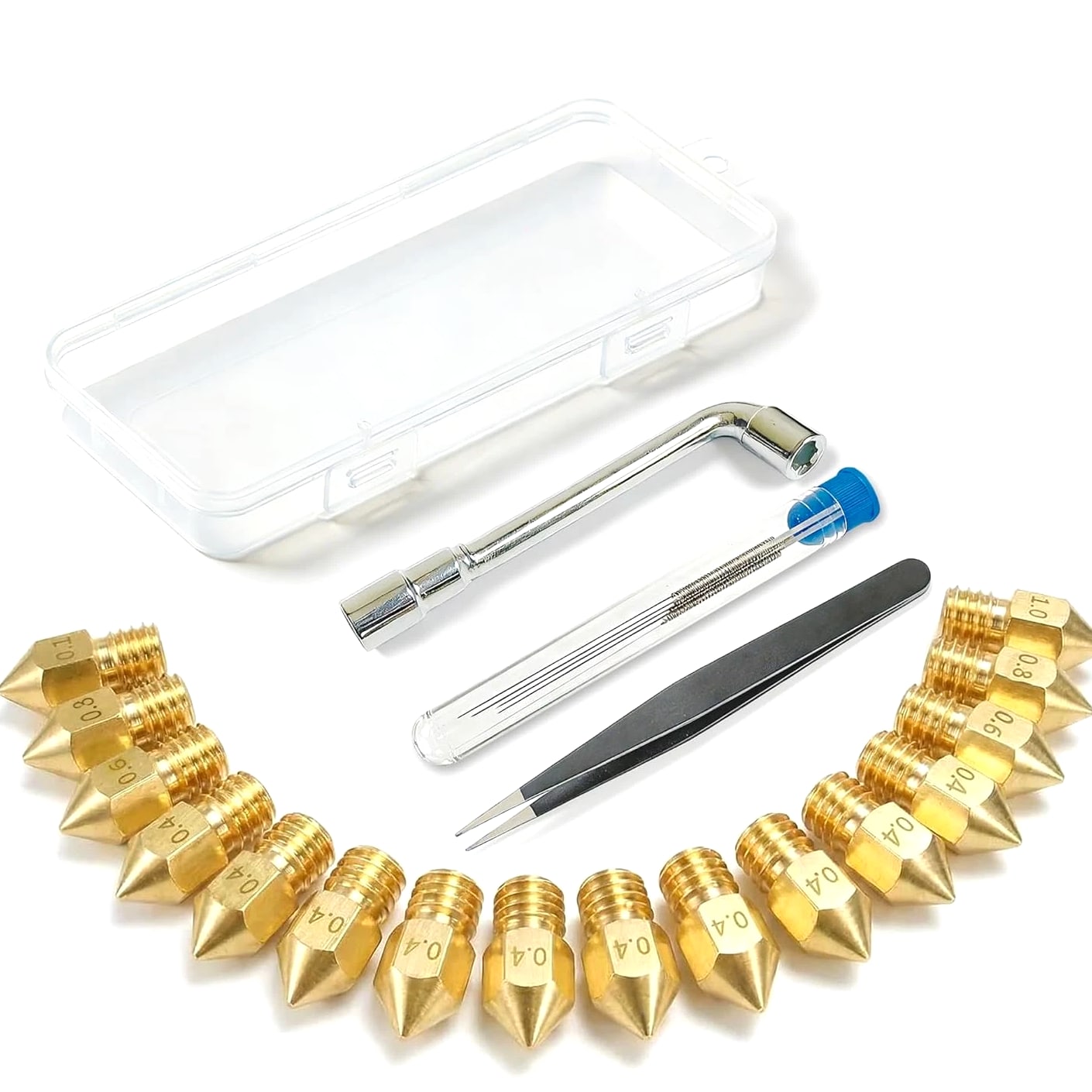 All-in-One MK8 Nozzle Kit with Tools & Case: This comprehensive set includes 16 brass nozzles: 8 frequently-used 0.4mm nozzles and 2 each of 0.2mm, 0.6mm, 0.8mm, and 1.0mm, plus an M6 hex wrench, tweezers, and 6 cleaning needles—housed in a convenient case for optimal organization and portability Compatible with Most Ender-3 & CR-10 Series: Engineered as direct replacements for standard MK8 hotends. These nozzles work with Creality Ender-3 Series (Ender 3, 3 Pro, 3 V2, 3 Max) and CR-10 Series (CR-10, 10S, 10S Pro, 10 Mini, 10 Max). Please Note: Not compatible with Ender-3 S1 Pro or models requiring high-temperature nozzles. Always verify your printer model before purchasing Match the Nozzle Size to Your Project: Quickly switch between nozzle sizes to optimize print results and speed: use 0.2mm for ultra-fine details and miniatures, 0.4mm for reliable daily printing, and 0.6mm through 1.0mm for rapid prototyping or larger projects. One versatile kit unlocks complete creative possibilities Reliable Brass Construction for Consistent Performance: Manufactured from premium brass for outstanding heat transfer, longevity, and steady filament flow. This material maintains stable printing temperatures and is compatible with standard 1.75mm filaments including PLA and ABS Easy to Install & Swap—Even for Beginners: The provided tools make nozzle swapping or cleaning straightforward and simple. Whether performing standard maintenance, unclogging, or testing different sizes for new effects, this kit saves time and gets you printing sooner Product description
