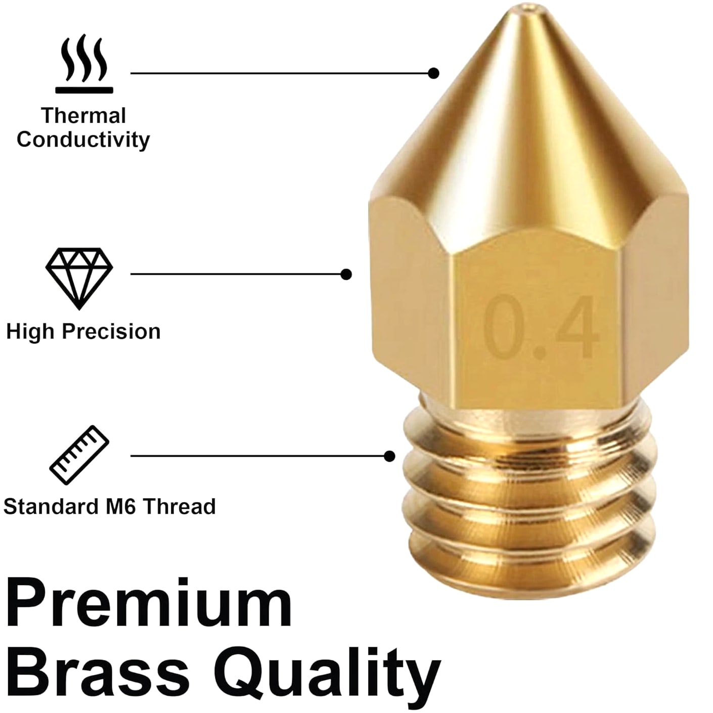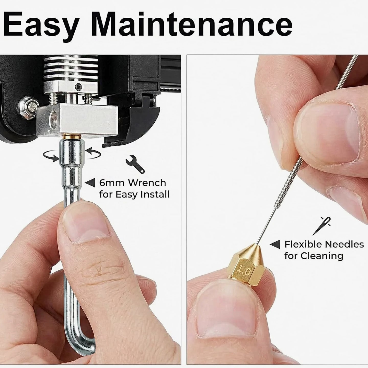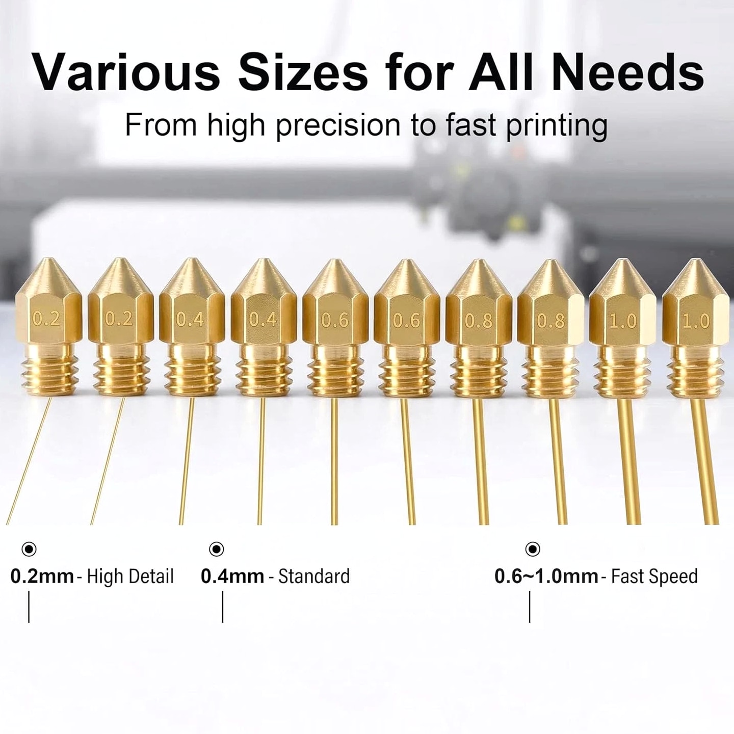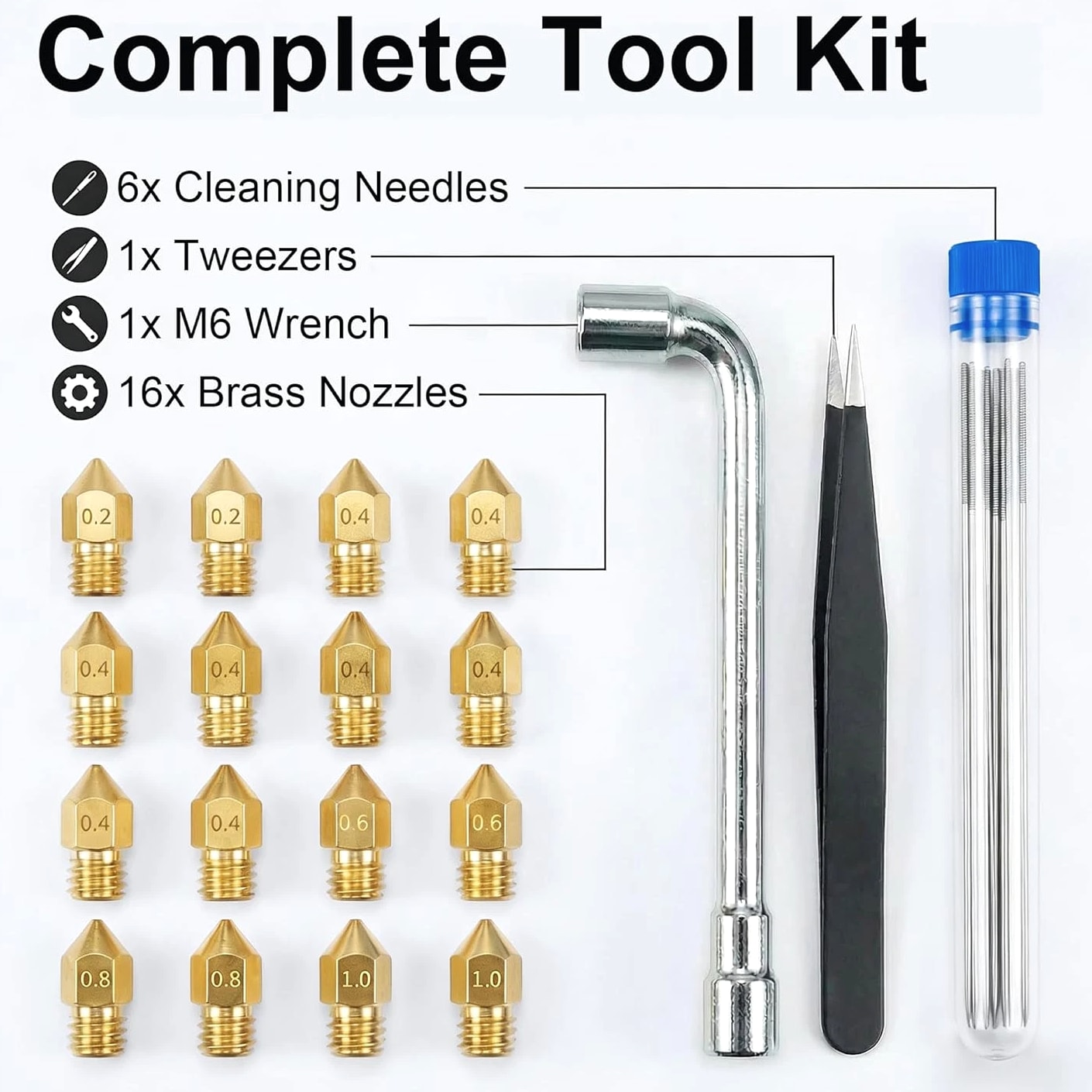 All-in-One MK8 Nozzle Kit with Tools & Case: This comprehensive set includes 16 brass nozzles: 8 frequently-used 0.4mm nozzles and 2 each of 0.2mm, 0.6mm, 0.8mm, and 1.0mm, plus an M6 hex wrench, tweezers, and 6 cleaning needles—housed in a convenient case for optimal organization and portability Compatible with Most Ender-3 & CR-10 Series: Engineered as direct replacements for standard MK8 hotends. These nozzles work with Creality Ender-3 Series (Ender 3, 3 Pro, 3 V2, 3 Max) and CR-10 Series (CR-10, 10S, 10S Pro, 10 Mini, 10 Max). Please Note: Not compatible with Ender-3 S1 Pro or models requiring high-temperature nozzles. Always verify your printer model before purchasing Match the Nozzle Size to Your Project: Quickly switch between nozzle sizes to optimize print results and speed: use 0.2mm for ultra-fine details and miniatures, 0.4mm for reliable daily printing, and 0.6mm through 1.0mm for rapid prototyping or larger projects. One versatile kit unlocks complete creative possibilities Reliable Brass Construction for Consistent Performance: Manufactured from premium brass for outstanding heat transfer, longevity, and steady filament flow. This material maintains stable printing temperatures and is compatible with standard 1.75mm filaments including PLA and ABS Easy to Install & Swap—Even for Beginners: The provided tools make nozzle swapping or cleaning straightforward and simple. Whether performing standard maintenance, unclogging, or testing different sizes for new effects, this kit saves time and gets you printing sooner Product description