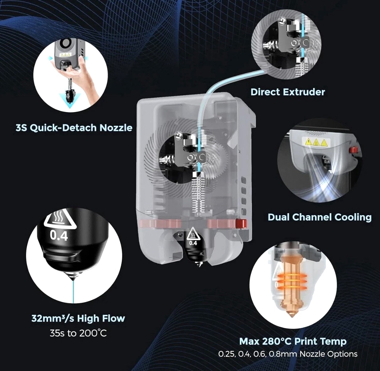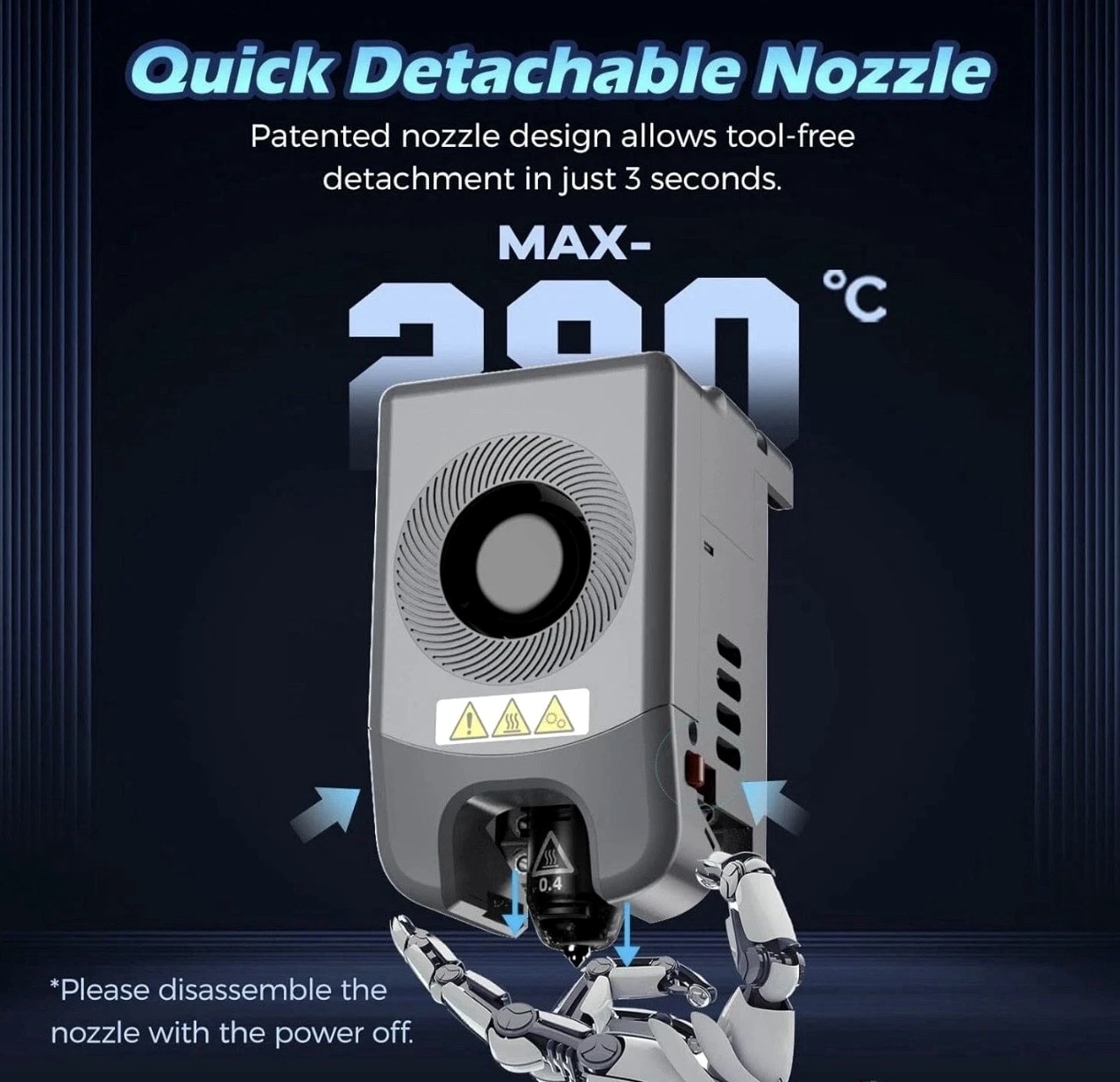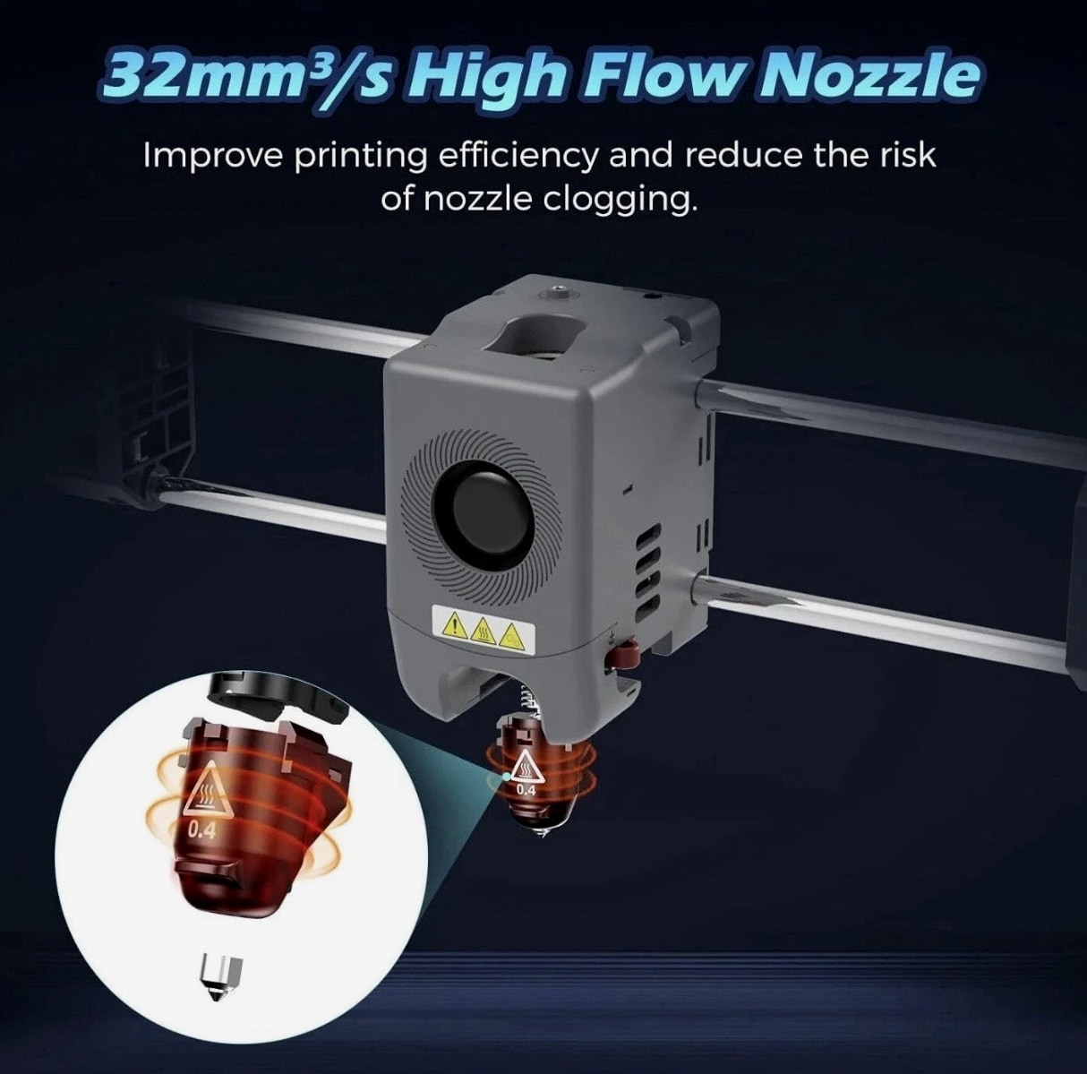The Nozzle Assembly for AD5M Series is engineered to provide smooth and precise 3D printing. This critical component enables seamless filament extrusion, guaranteeing superior print quality. Whether installing a new part or replacing a worn nozzle, this assembly delivers improved flow and dependable performance. The 20004089001 is a 0.4mm nozzle. This high-performance nozzle features fast 35-second heating with 50W heating power, delivering a high flow rate of 32mm³/s for efficient printing. It supports quick 3-second detachment for convenient maintenance. With a maximum print temperature of 280°C, it offers broad material compatibility.