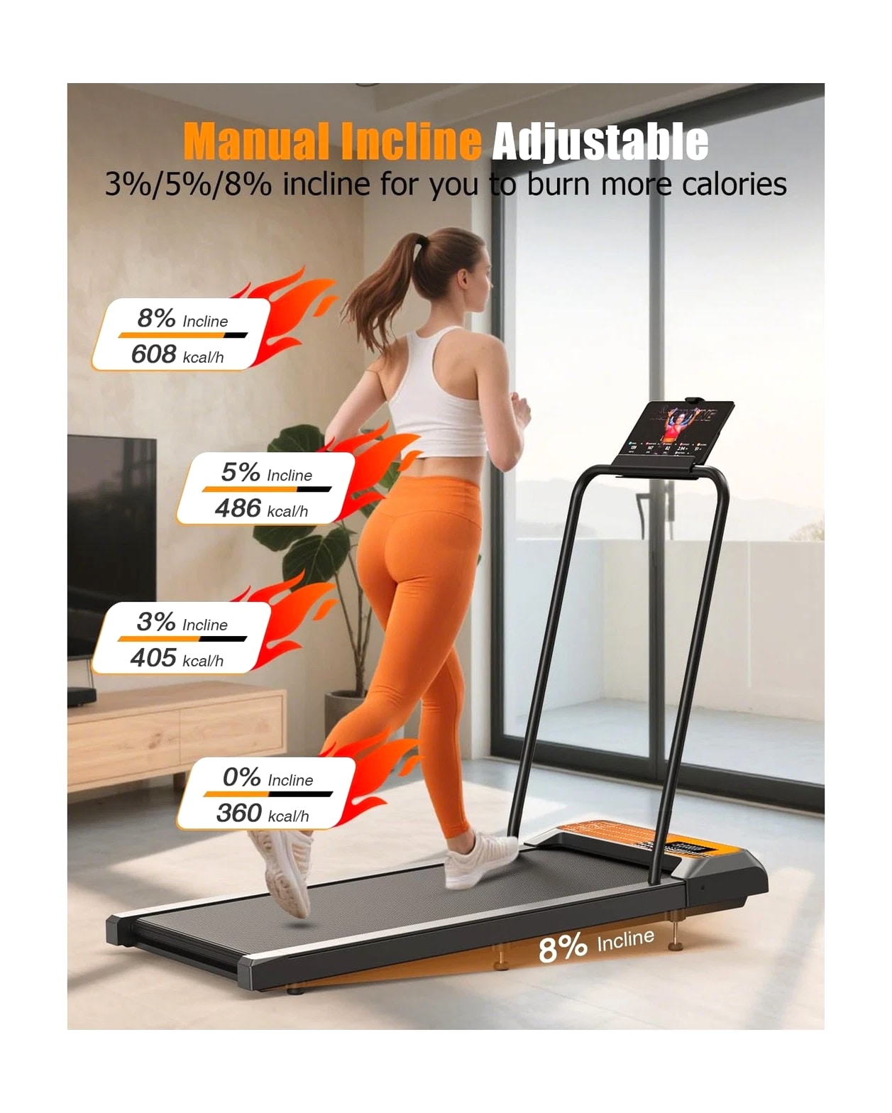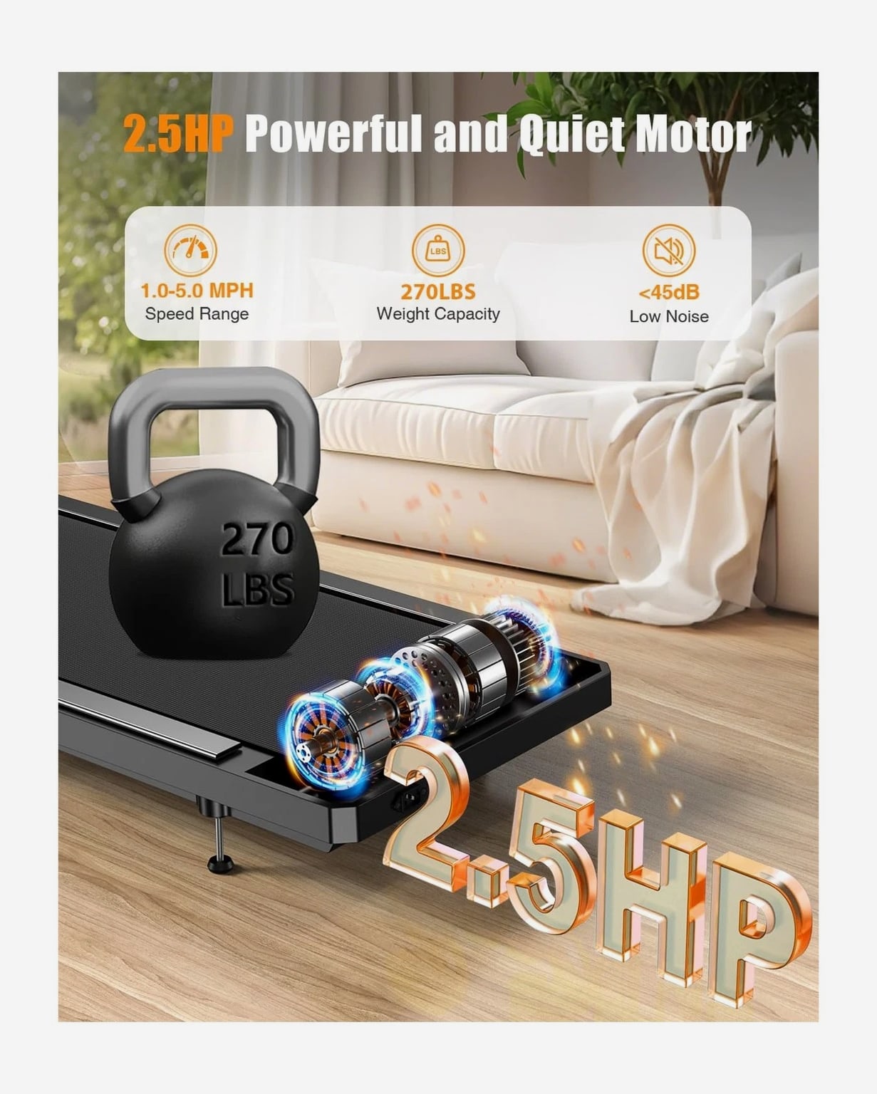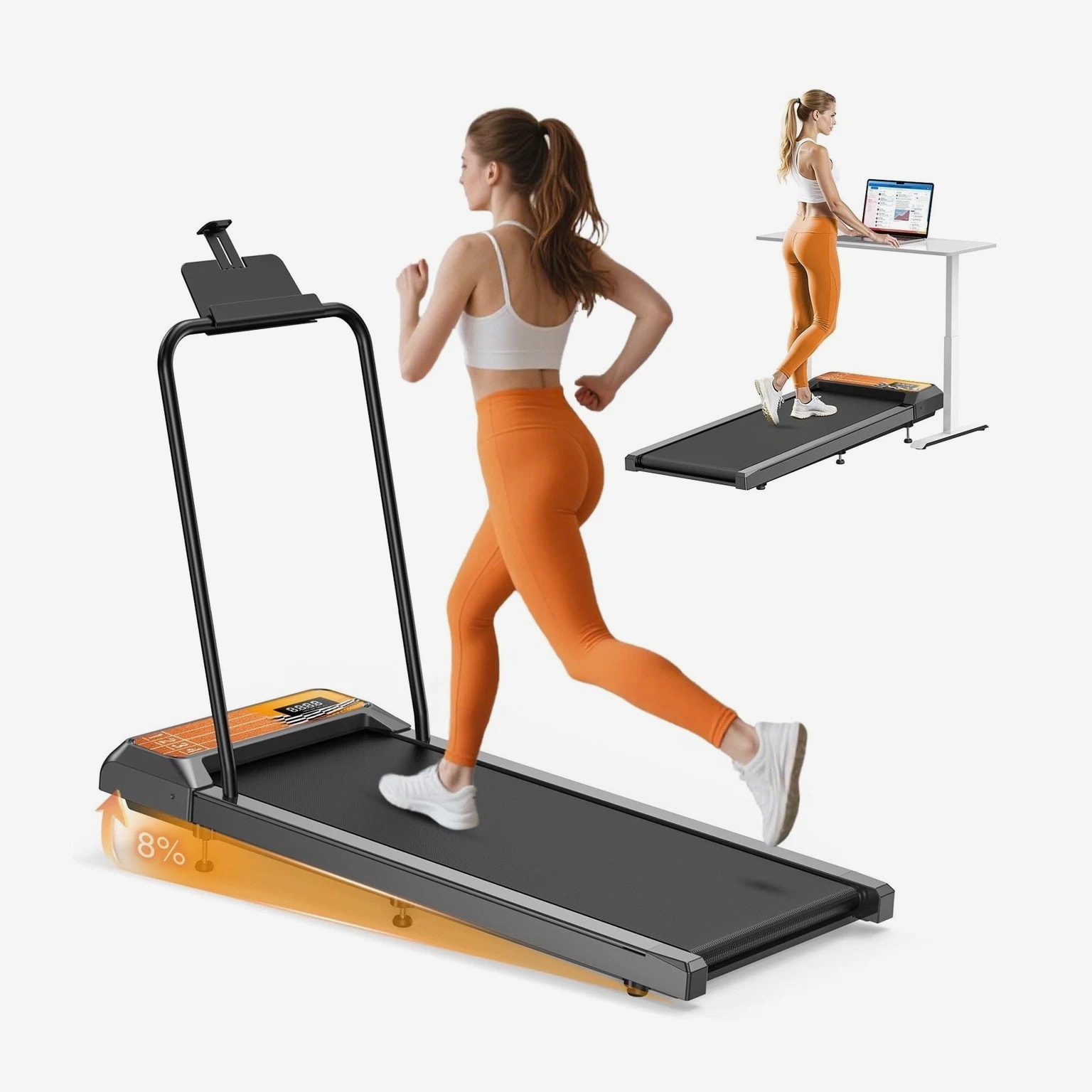 HCOIW Walking Treadmill Pad with Incline - Portable Under Desk Treadmill, Walking Mat with Handle Bar, 2.5HP Low Noise, 2 in 1 Treadmills for Home Office, Remote Control with LED Screen Description HCOIW Walking Treadmill Pad With Incline and Handle Bar – Compact, Lightweight, Quiet, and Easy to Store. This treadmill is the ideal fitness companion for the modern home. Compact and quiet, it easily stores and takes up little space. Its 8% manual incline and 1.0-5.0 mph speed allow you to comfortably walk, jog, or run without disturbing those around you. The intuitive LED display and remote control make your workout experience smooth and effortless. Whether you're working from home or just busy with your daily routine, this small walking treadmill pad will help you stay active and easily start a healthy lifestyle. Features: 8% Adjustable Incline and 2.5HP Quiet Motor: This walking treadmill pad with incline features a built-in 2.5HP quiet motor, allowing you to exercise without disturbing others. It can support a maximum weight of 270 lbs. The 8% incline adjustment simulates an uphill climb, adding a challenge to your workout while burning calories; perfect for your home workout needs. 1.0-5.0mph Speed Walking Treadmill Pad With Handle Bar: Our walking treadmill pad with incline offers a speed range of 1 to 5 miles per hour, perfect for walking, jogging, and running. With our portable walking treadmill pad with handle bar, you can meet your work-life balance needs and stay active all day. Wider Running Belt and Shock-Absorbing Design: The small treadmills for home are equipped with a spacious 15*35.4-inch running area, which has enough space to satisfy you. It is also equipped with a 5-layer non-slip running belt, silicone shock absorbers and soft rubber pads to help reduce impact and noise, making your running quieter and more stable, ensuring your knees, muscles and joints are protected while running. Remote Control and LED Display: This walking small pad with handle bar features intuitive controls for convenient operation.