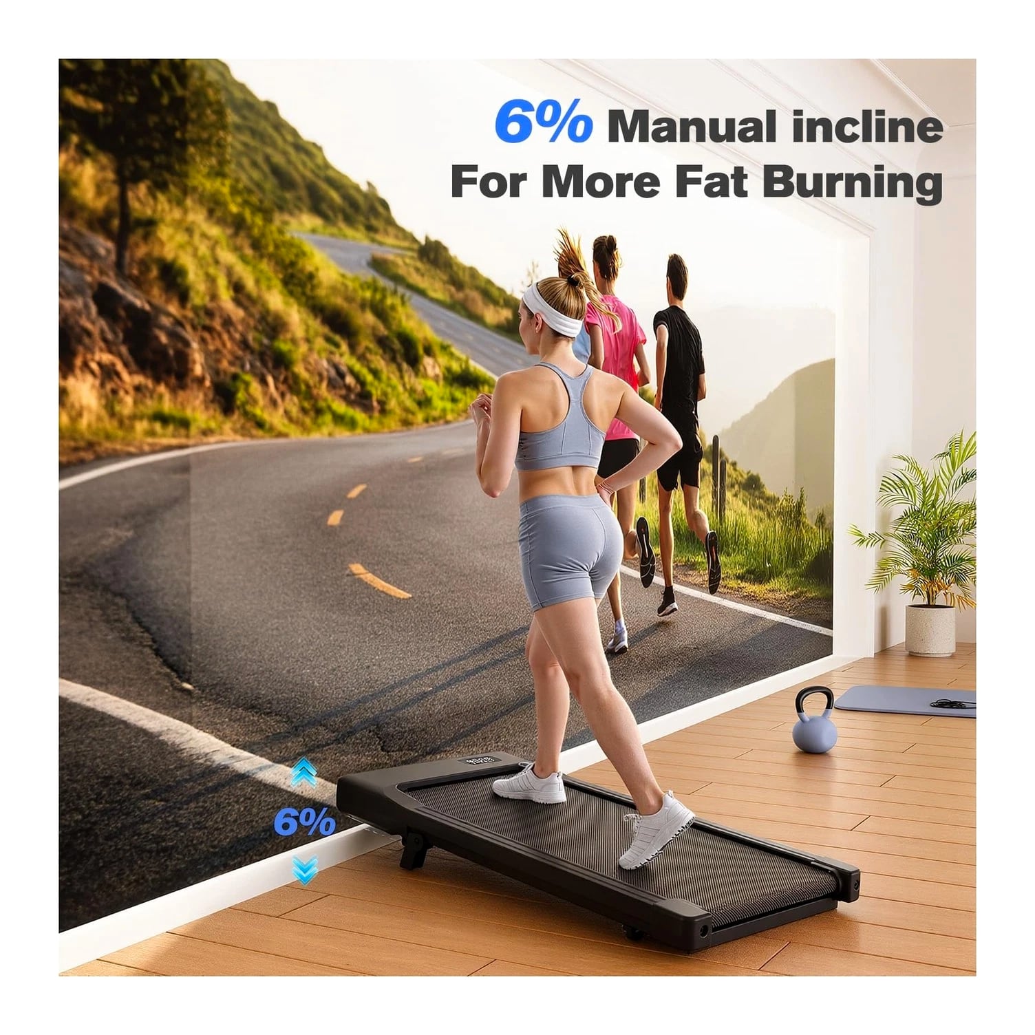 Walking Pad with 6% Incline, No-Assembly Treadmill with APP and Remote Control, LED Display, 2.5 HP Quiet Under Desk Treadmills, 300 lbs Capacity Description Features: 6% Manual Incline 3-IN-1 Walking Pad Treadmill With Adjustable Speed: This versatile under desk treadmill allows you to easily customize your workout intensity with adjustable speed settings and a 6% manual incline. Whether you're walking, jogging, or running, this adaptable design ensures a personalized fitness experience tailored to your needs, making it perfect for home or office use. LED Display & Smart PITPAT: This unique walking pad with incline requires downloading PitPat for activation. Walking pad under desk tracks fitness data accurately with a LED display and smart Pitpat APP to quickly track your calories burned, speed, time and distance. Walking treadmill with a speed range of 0.6-3.8MPH allows you to customize your workout program according to your physical needs. Ready-To-Use, Moveable Small Treadmill: This desk treadmill arrives fully assembled and ready for immediate use right out of the box. Featuring built-in transport wheels, this compact treadmill can be easily moved and stored under furniture or in tight spaces, optimizing your home workout space or office layout. Quiet & Powerful Walking Pad: Under desk walking pad is equipped with a 2.5 horsepower motor and can hold up to 300 lbs. Portable treadmill operates at less than 45DB, allowing you to use it in your office or home without worrying about disturbing others. Enjoy a quiet and comfortable exercise experience with treadmills for home. Non-Slip & Stable Running Belt: This mini treadmill is equipped with a 5-layer multi-functional running belt. Portable treadmills for home not only provide you with a comfortable and safe exercise experience, but also effectively reduce joint impact and protect your knees. 24/7 Customer Support: This small walking pad enjoys round-the-clock support and assistance.