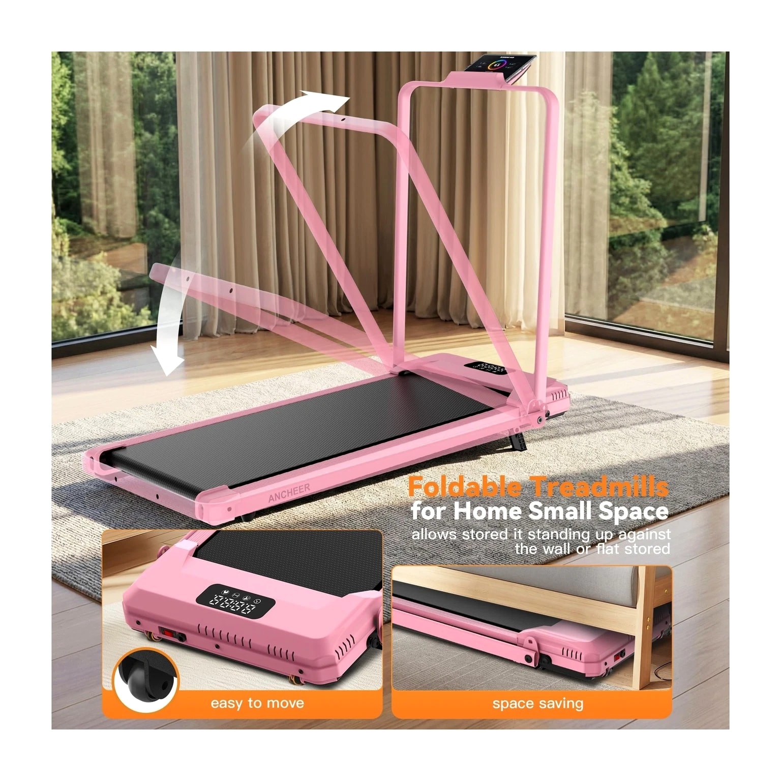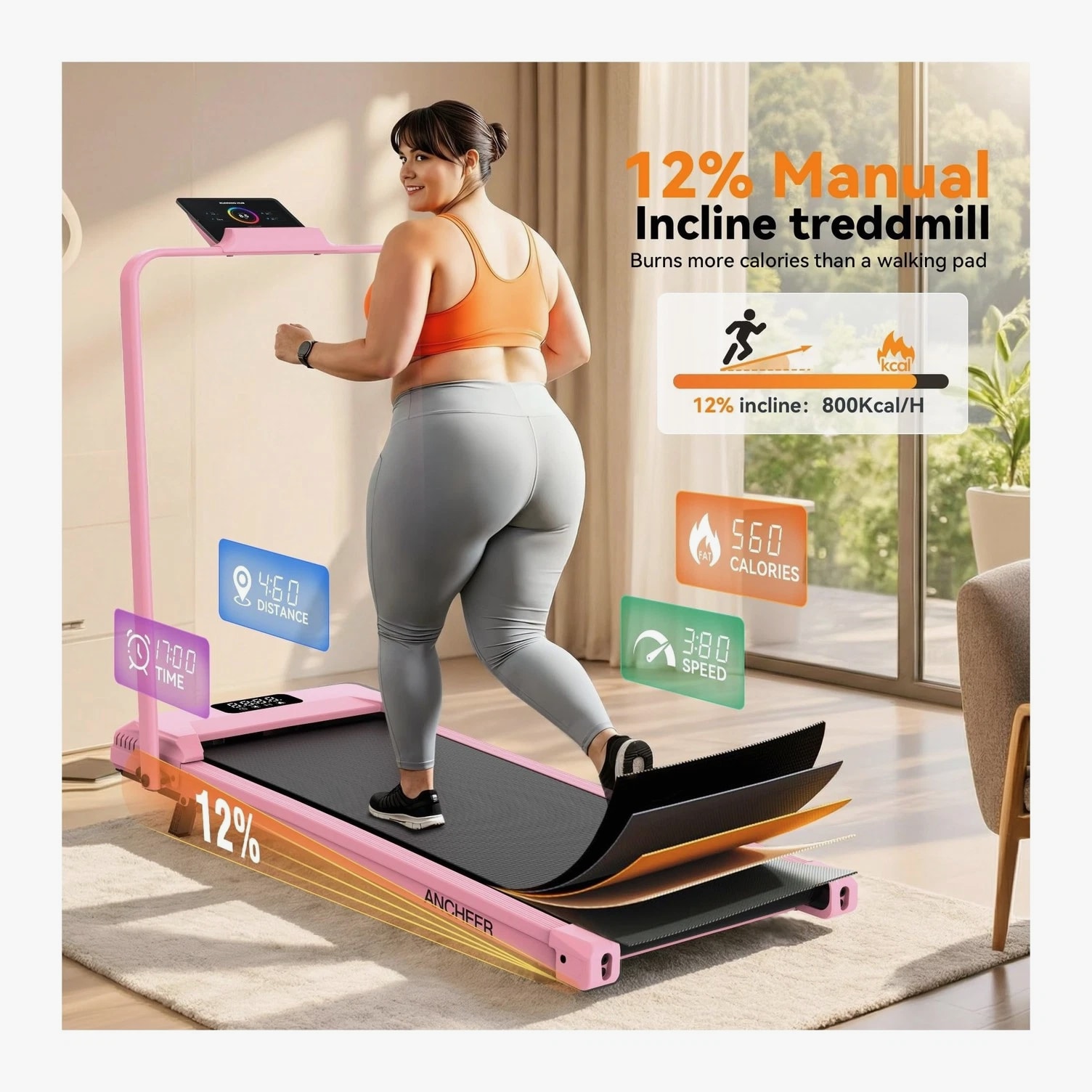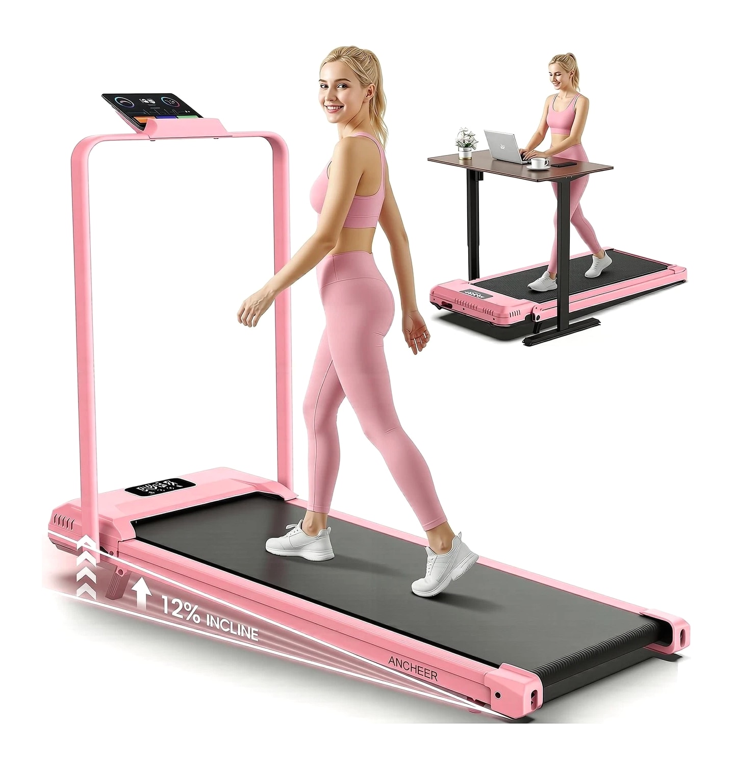 ANCHEER Walking Pad Treadmill with 12% Incline - Under Desk Treadmills with Handle Bar, 300-450lb Capacity 3.5HP Foldable Walking Pads for Home Small Spaces, Office, Gym Description 3.25HP Folding Treadmills with Incline, Fitness APP, Bluetooth Speaker and LCD Display, 300 LBS Capacity Electric Portable Running Walking Jogging Machine for Home Gym Office Use Features: More Safer Treadmills – The wobbly walking pad cannot serve as your safety coach during fitness; our treadmill with handle bars provides 360-degree balance support. The anti-sway design allows rehabilitation people/running enthusiasts/burning fat to completely eliminate the anxiety of falling. In addition, it can share 30% of your body weight during running, which protects your knees and joints 12% Incline Treadmill & 16" Extra-Wide Belt – Portable treadmill features a 2-level manually adjustable incline function. The 12% incline design simulates the uphill scene more realistically than other ordinary treadmills, torching 1.8X more calories than flat pad per hour; at the same time, our treadmill with incline uses a 16" widened running belt to let you have more running space to enjoy your fitness time in comfort Superior Home Fitness Machine: Built for Quiet & Strength – This foldable walking treadmill redefines home fitness: a 1000W brushless motor (quieter than rivals) powers speeds from 0.6–4.0MPH, accommodating walkers, joggers, and cardio enthusiasts. Its industrial-grade 350LBS capacity and oversized LED screen outperform basic models; this compact treadmill is the all-in-one solution for efficient, high-performance workouts at home Pro-Level Joint Safeguard System – Engineered with 6 high-performance damping absorbers and a 7-layer advanced shock-absorbing belt, this folding treadmill reduces impact on knees and ankles by 60%. Rigorous testing proves its durability, user-centric design ensures every step feels secure—because safety should never be an afterthought Foldable Treadmills for Home Small