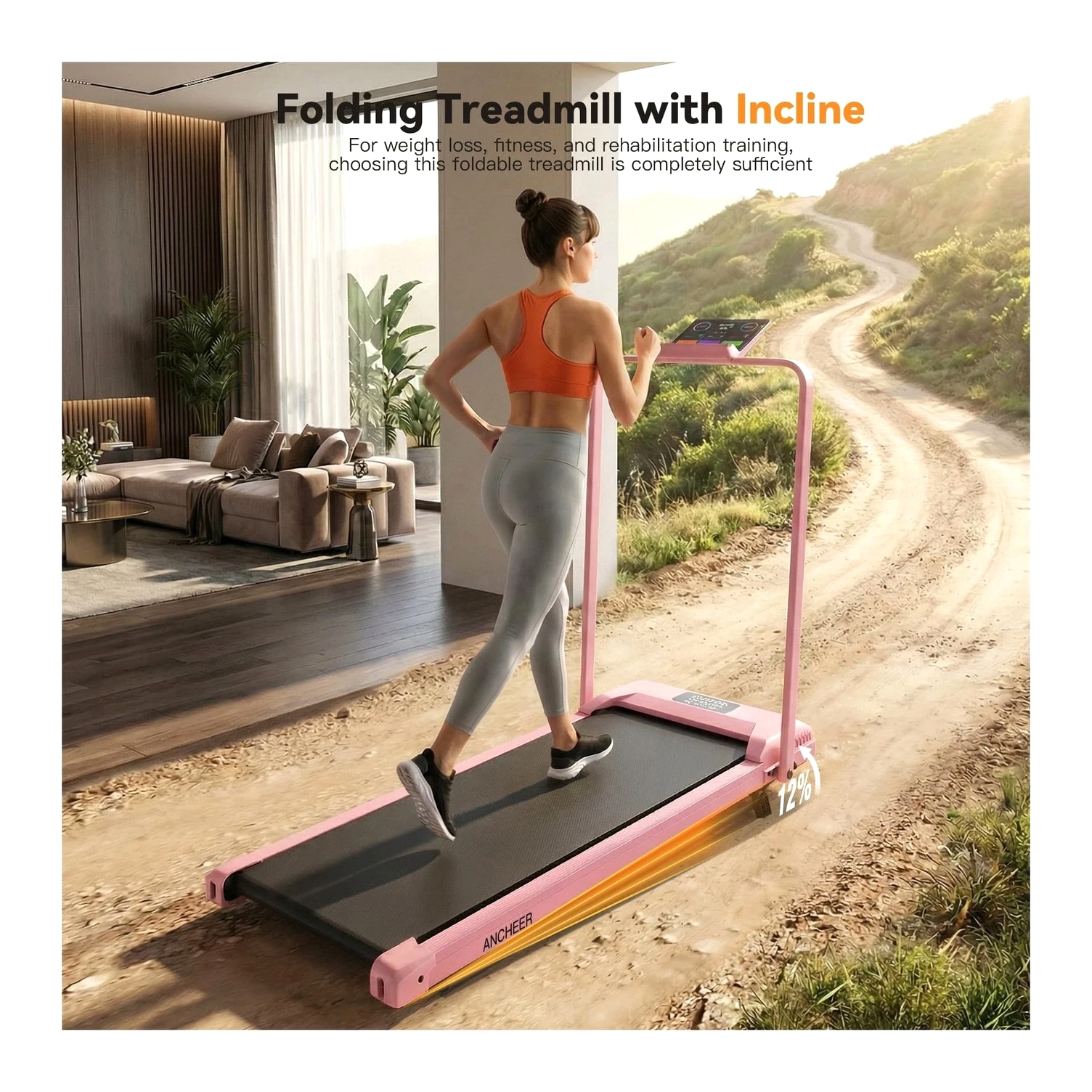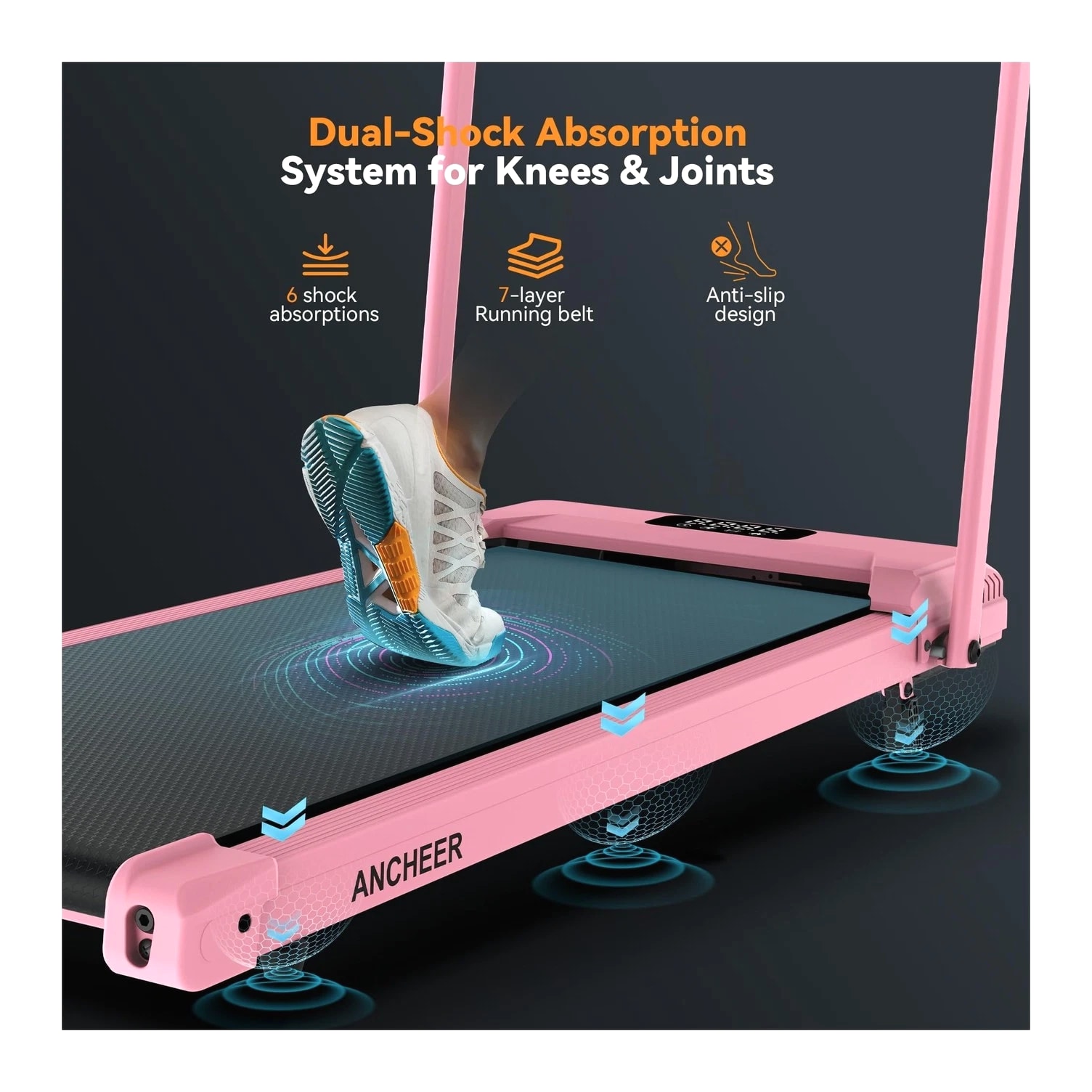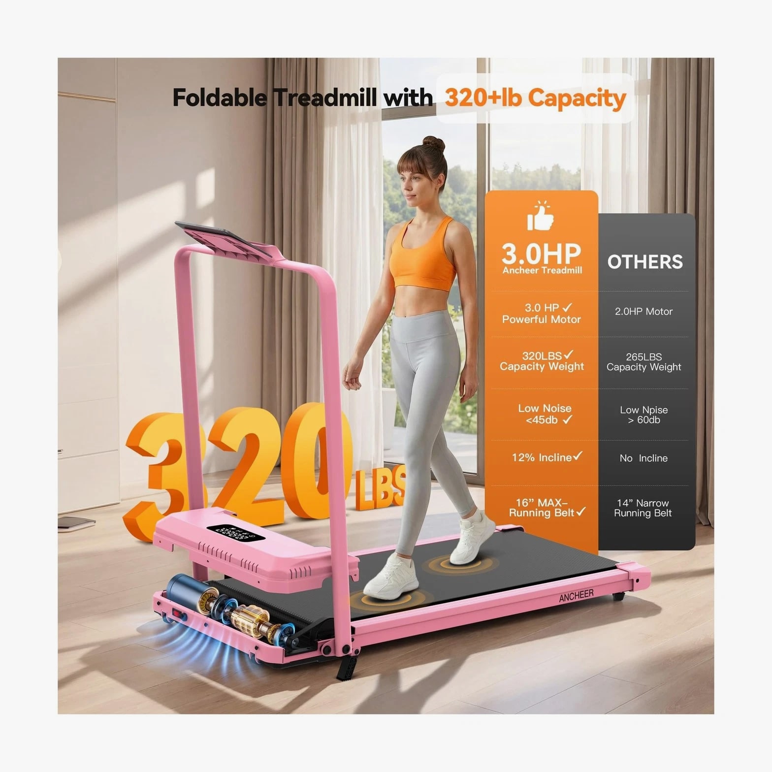 ANCHEER Walking Pad Treadmill with 12% Incline - Under Desk Treadmills with Handle Bar, 300-450lb Capacity 3.5HP Foldable Walking Pads for Home Small Spaces, Office, Gym Description 3.25HP Folding Treadmills with Incline, Fitness APP, Bluetooth Speaker and LCD Display, 300 LBS Capacity Electric Portable Running Walking Jogging Machine for Home Gym Office Use Features: More Safer Treadmills – The wobbly walking pad cannot serve as your safety coach during fitness; our treadmill with handle bars provides 360-degree balance support. The anti-sway design allows rehabilitation people/running enthusiasts/burning fat to completely eliminate the anxiety of falling. In addition, it can share 30% of your body weight during running, which protects your knees and joints 12% Incline Treadmill & 16" Extra-Wide Belt – Portable treadmill features a 2-level manually adjustable incline function. The 12% incline design simulates the uphill scene more realistically than other ordinary treadmills, torching 1.8X more calories than flat pad per hour; at the same time, our treadmill with incline uses a 16" widened running belt to let you have more running space to enjoy your fitness time in comfort Superior Home Fitness Machine: Built for Quiet & Strength – This foldable walking treadmill redefines home fitness: a 1000W brushless motor (quieter than rivals) powers speeds from 0.6–4.0MPH, accommodating walkers, joggers, and cardio enthusiasts. Its industrial-grade 350LBS capacity and oversized LED screen outperform basic models; this compact treadmill is the all-in-one solution for efficient, high-performance workouts at home Pro-Level Joint Safeguard System – Engineered with 6 high-performance damping absorbers and a 7-layer advanced shock-absorbing belt, this folding treadmill reduces impact on knees and ankles by 60%. Rigorous testing proves its durability, user-centric design ensures every step feels secure—because safety should never be an afterthought Foldable Treadmills for Home Small
