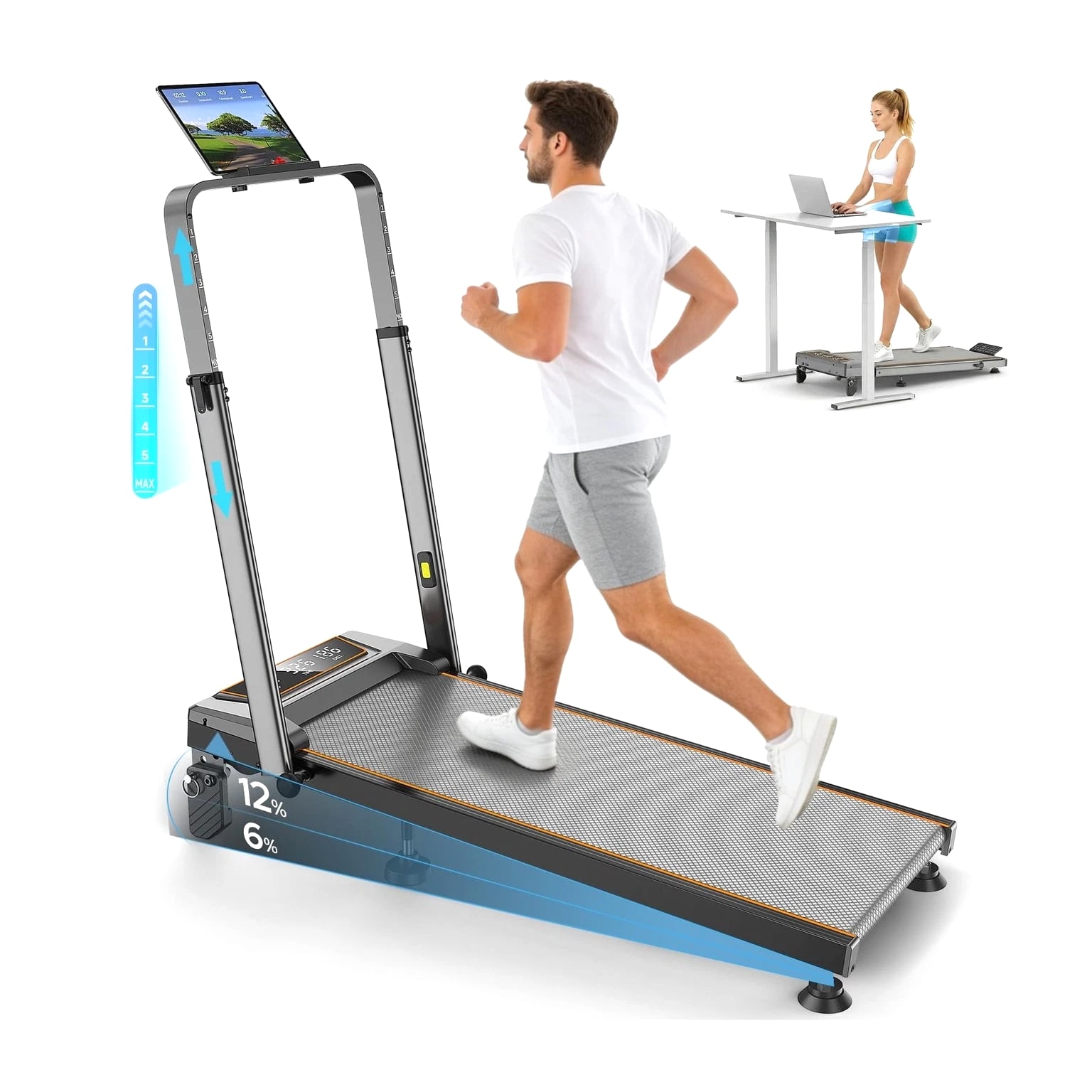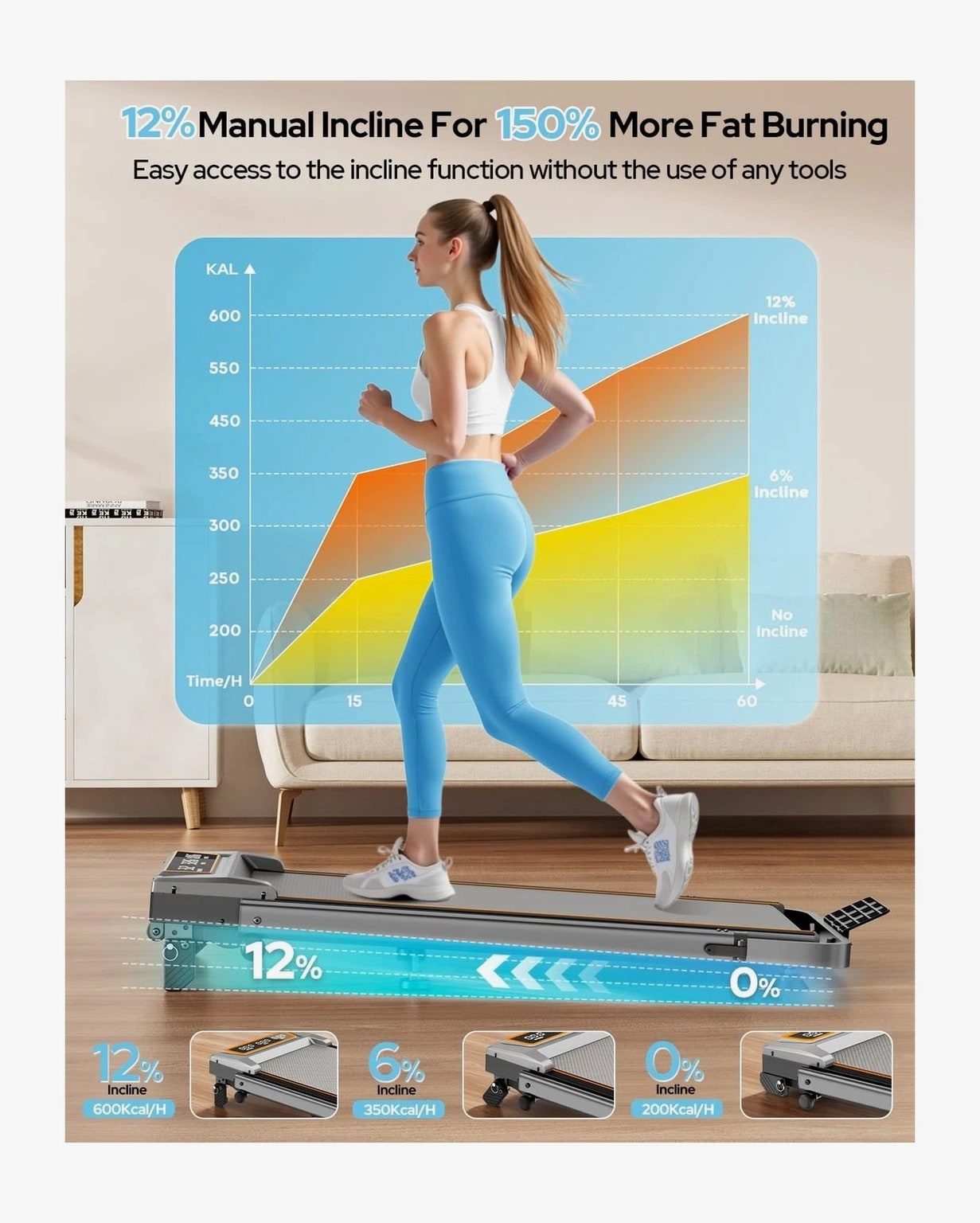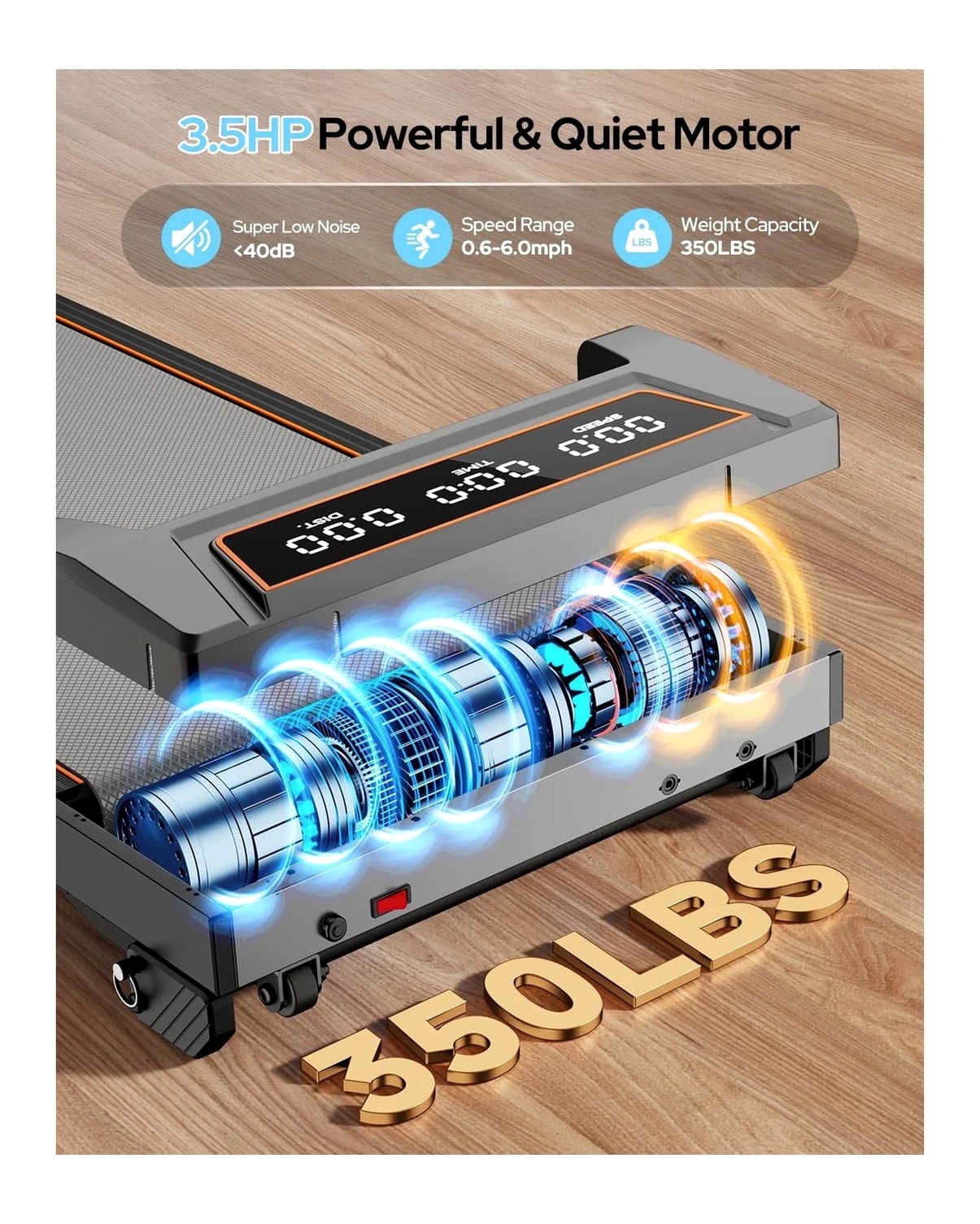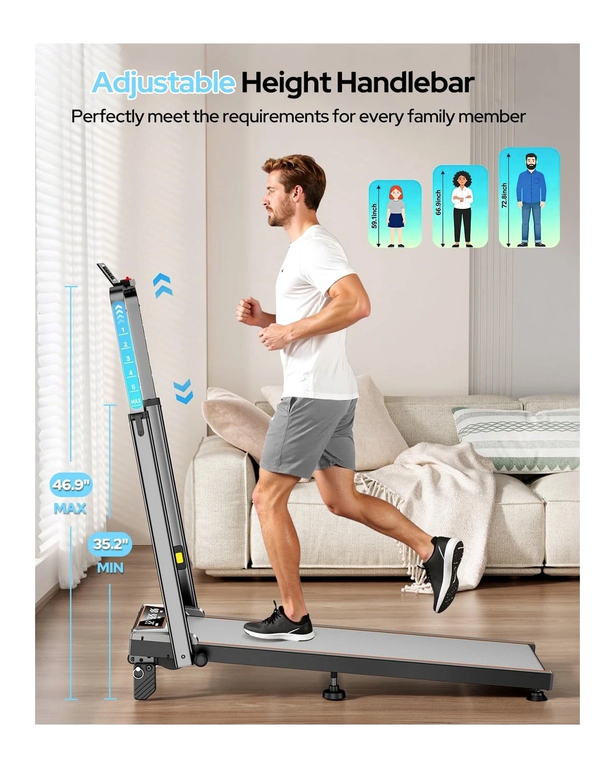 Treadmill Walking Pad with 12% Incline, Handle Bar Height Adjustable, One-click MUTE Walking Pad with Incline 3 Level, 3.5HP Foldable Walking Pad for Home Office Small Spaces 350lbs, Remote & APP Description Features: 6-Level Adjustable Handle Bar for All Heights – Designed for home workouts, this portable walking pad with handle bar offers a 6-level adjustable handle (35"-47") that fits the entire family perfectly. Unlike most treadmills with low, uncomfortable handles, we've upgraded to a sturdy reinforced steel handle—you can adjust it to your ideal height for safe, comfortable support. It works for all ages and body types, ensuring everyone in the family can work out with confidence. 12% Incline - 4 in 1 Walking Pad for Efficient Fat Burning – This incline walking pad treadmill combines walking, jogging, light running, and incline training modes to meet diverse fitness needs. Featuring 3 adjustable incline levels (0%/6%/12%), a 0.6-6.0 MPH speed range, and 350lbs weight capacity, it boosts calorie burn by up to 50% compared to standard walking pads. It adapts seamlessly to both beginners and fitness enthusiasts, making efficient, personalized home workouts effortless. 3.5HP Powerful Motor & One-Click MUTE Function – Powered by a 3.5HP high-performance motor (<40db) and equipped with a one-click MUTE function to turn off alert sounds, this under desk walking pad with incline lets you exercise while on conference calls, watching TV, or when family members are resting—no loud distractions. Rigorously tested for 100,000+ impacts and 8 hours of non-stop use, the motor runs smoothly and steadily without overheating, ensuring long-term reliability for daily workouts. Anti-Slip Shock-Absorbing, Adjustable Running Belt Design – Protect your joints with the 7-layer anti-slip running belt and multi-structure shock absorption system. The adjustable running belt ensures a perfect fit—you can tweak it based on your needs—while the textured non-slip surface prevents slips even during sw