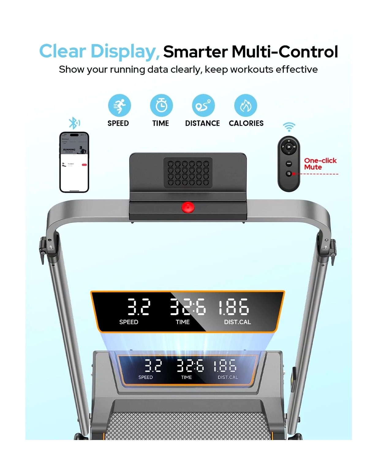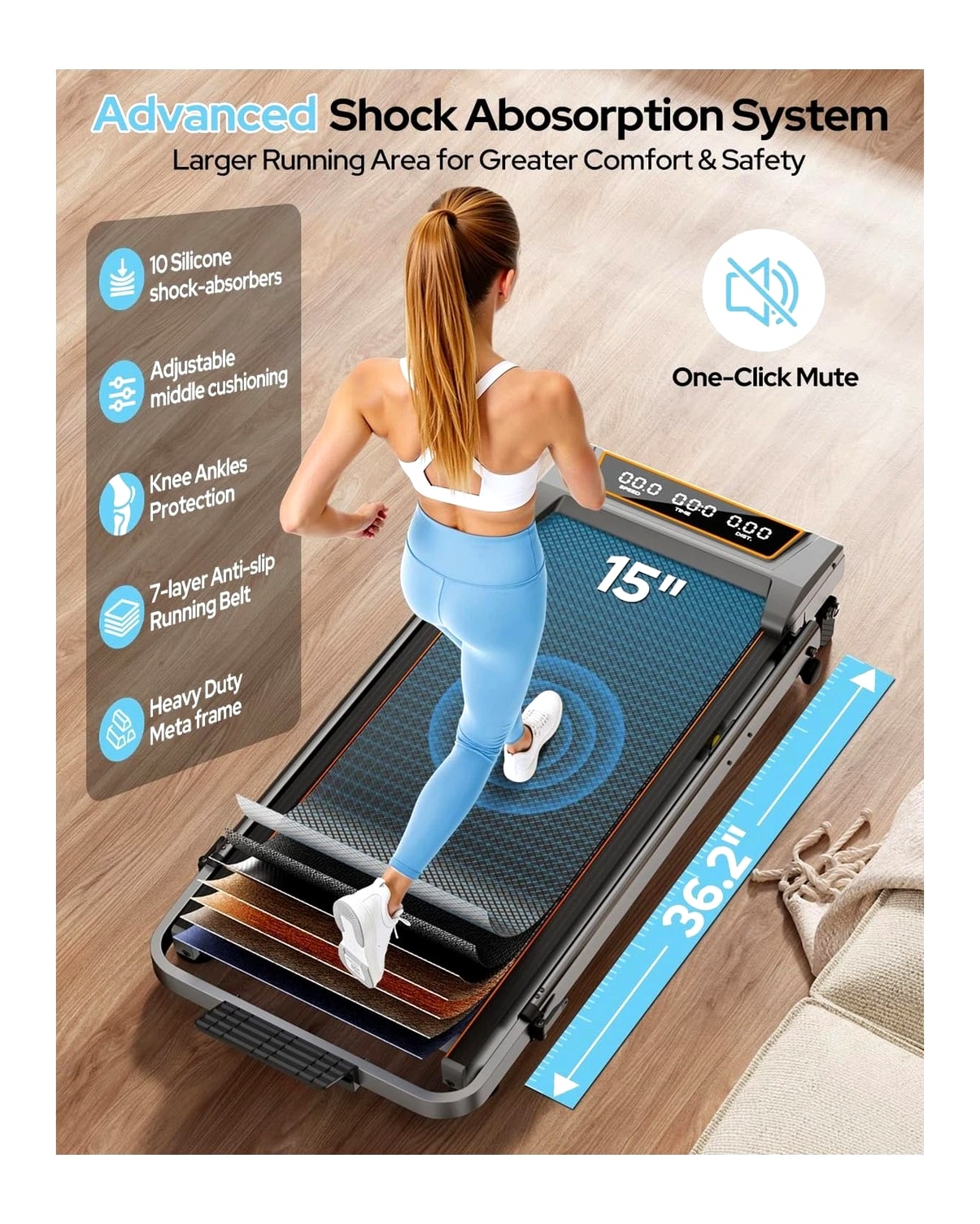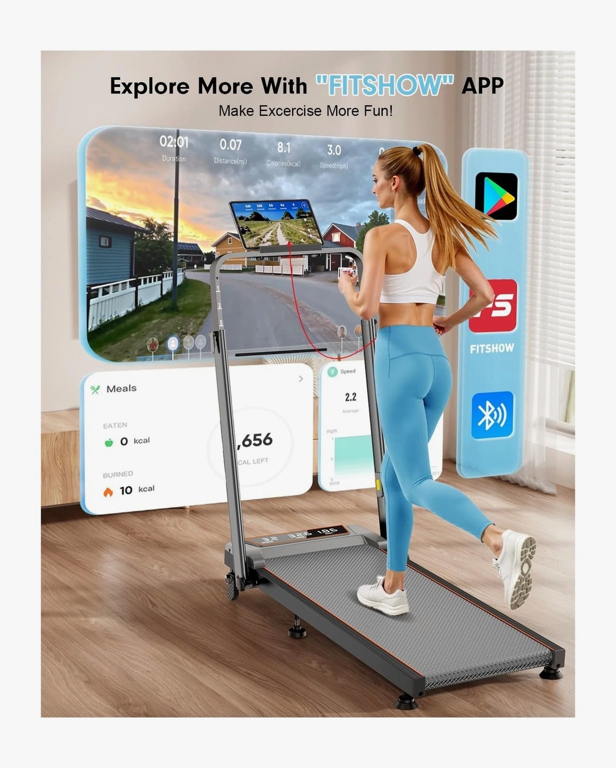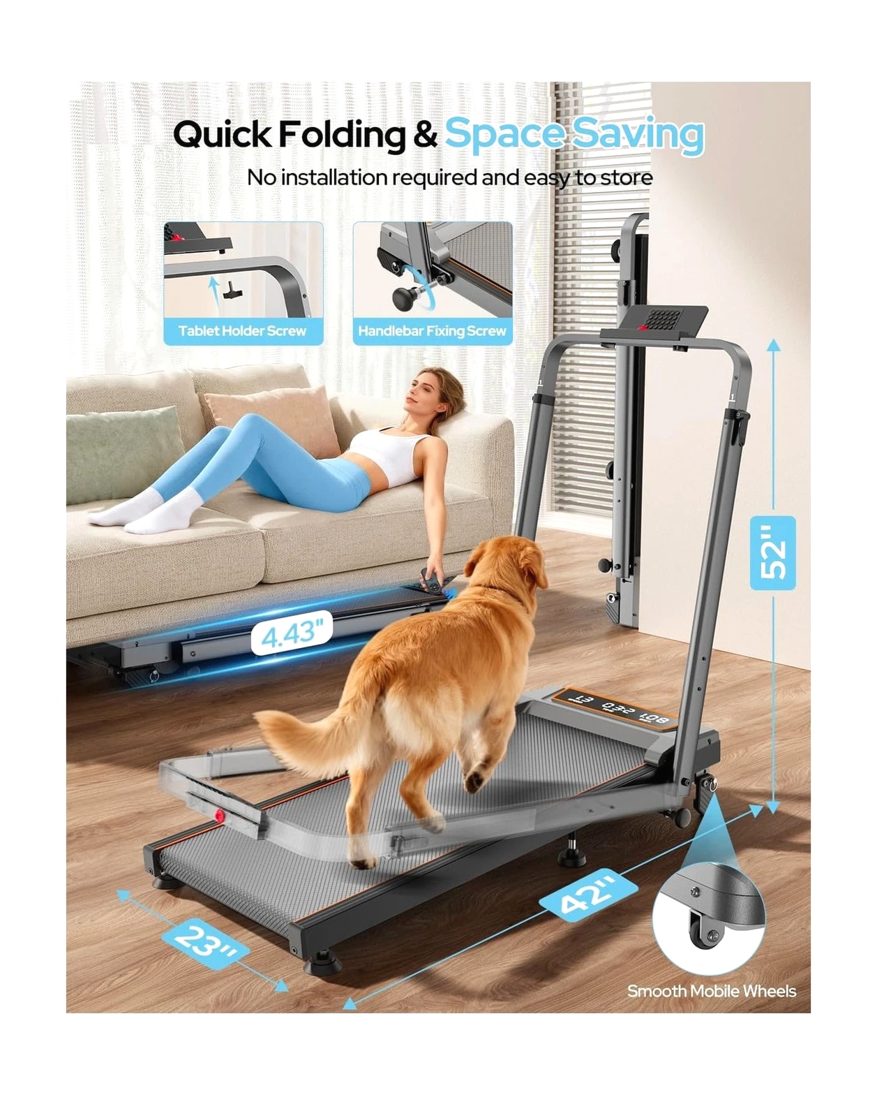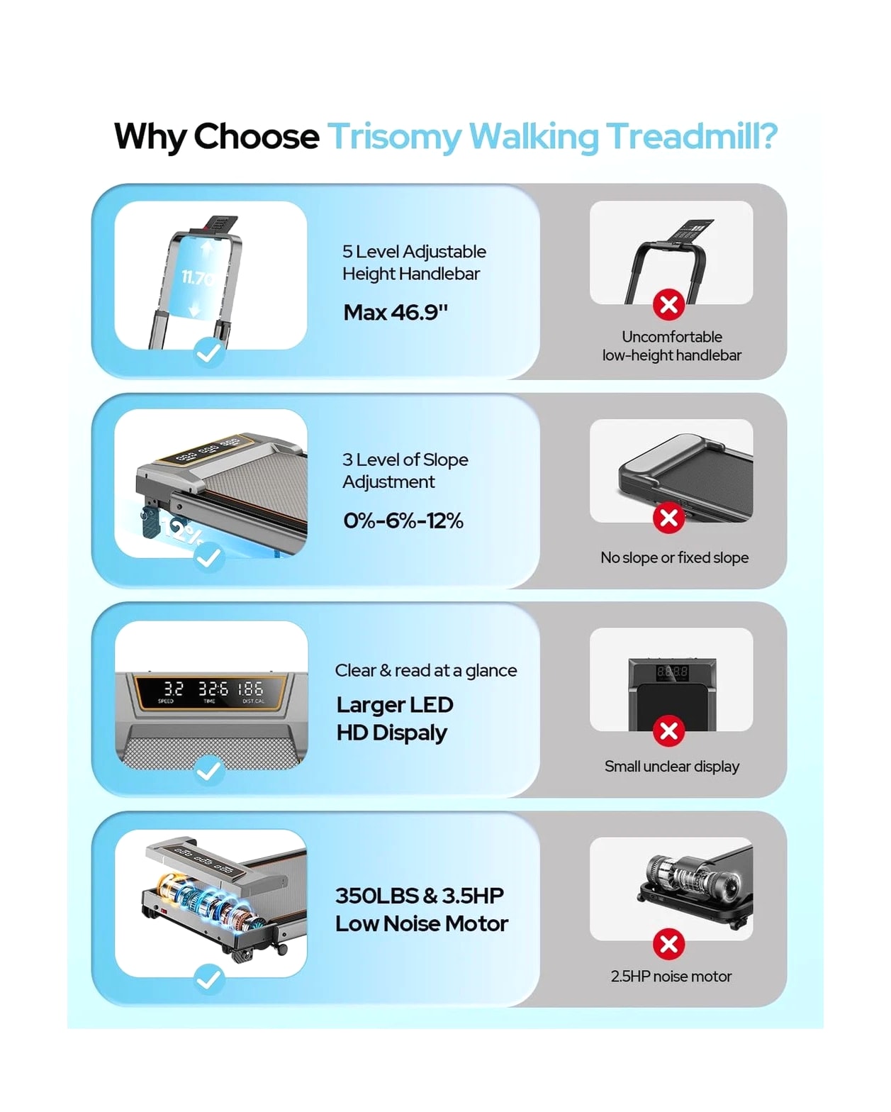 Treadmill Walking Pad with 12% Incline, Handle Bar Height Adjustable, One-click MUTE Walking Pad with Incline 3 Level, 3.5HP Foldable Walking Pad for Home Office Small Spaces 350lbs, Remote & APP Description Features: 6-Level Adjustable Handle Bar for All Heights – Designed for home workouts, this portable walking pad with handle bar offers a 6-level adjustable handle (35"-47") that fits the entire family perfectly. Unlike most treadmills with low, uncomfortable handles, we've upgraded to a sturdy reinforced steel handle—you can adjust it to your ideal height for safe, comfortable support. It works for all ages and body types, ensuring everyone in the family can work out with confidence. 12% Incline - 4 in 1 Walking Pad for Efficient Fat Burning – This incline walking pad treadmill combines walking, jogging, light running, and incline training modes to meet diverse fitness needs. Featuring 3 adjustable incline levels (0%/6%/12%), a 0.6-6.0 MPH speed range, and 350lbs weight capacity, it boosts calorie burn by up to 50% compared to standard walking pads. It adapts seamlessly to both beginners and fitness enthusiasts, making efficient, personalized home workouts effortless. 3.5HP Powerful Motor & One-Click MUTE Function – Powered by a 3.5HP high-performance motor (<40db) and equipped with a one-click MUTE function to turn off alert sounds, this under desk walking pad with incline lets you exercise while on conference calls, watching TV, or when family members are resting—no loud distractions. Rigorously tested for 100,000+ impacts and 8 hours of non-stop use, the motor runs smoothly and steadily without overheating, ensuring long-term reliability for daily workouts. Anti-Slip Shock-Absorbing, Adjustable Running Belt Design – Protect your joints with the 7-layer anti-slip running belt and multi-structure shock absorption system. The adjustable running belt ensures a perfect fit—you can tweak it based on your needs—while the textured non-slip surface prevents slips even during sw