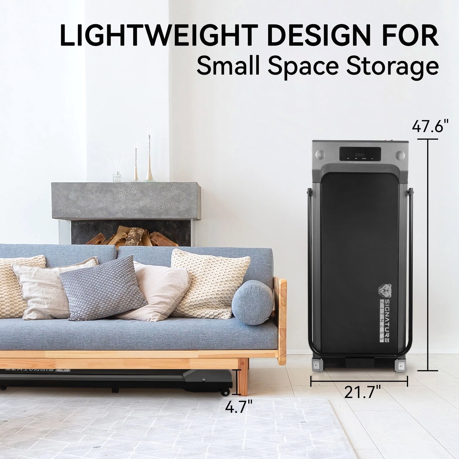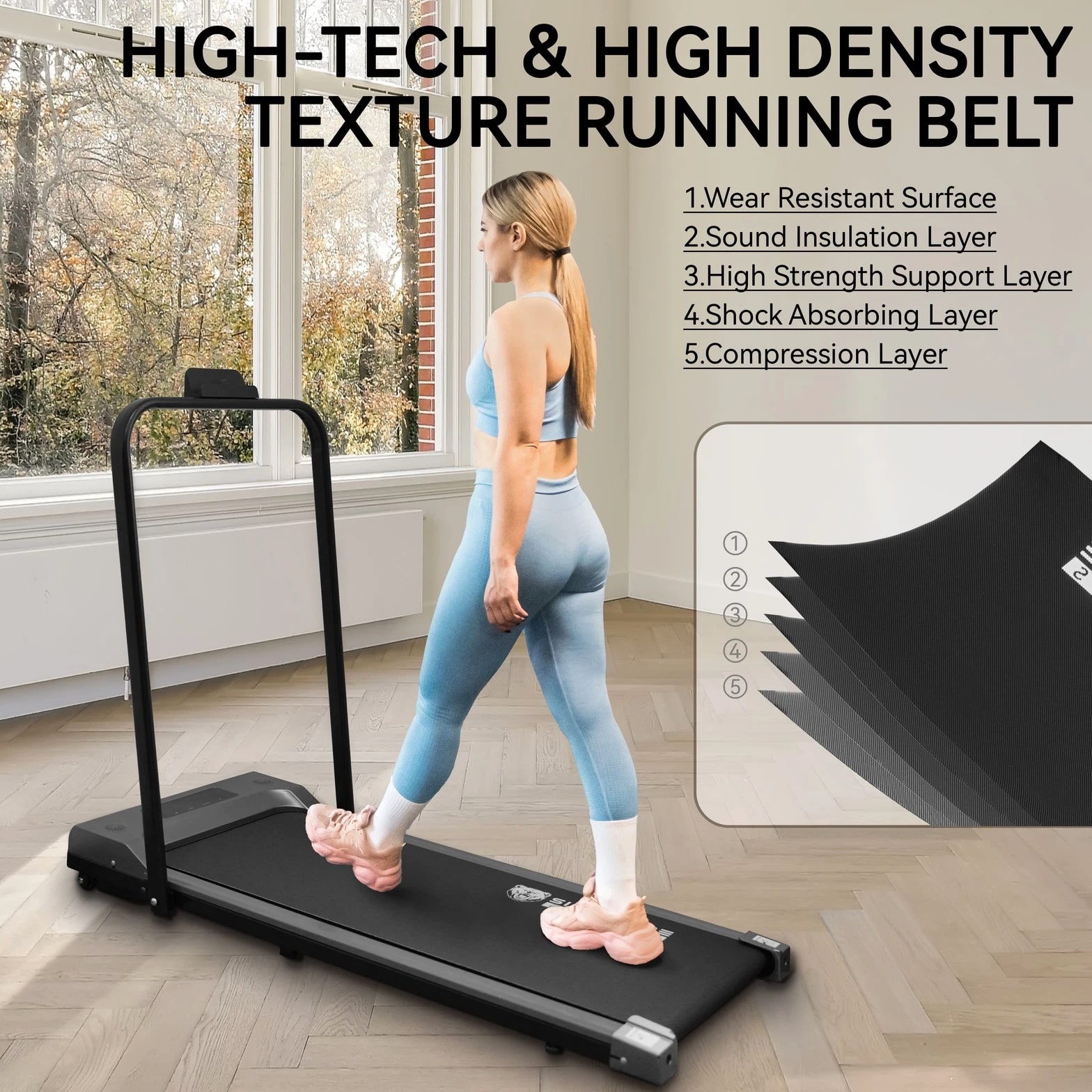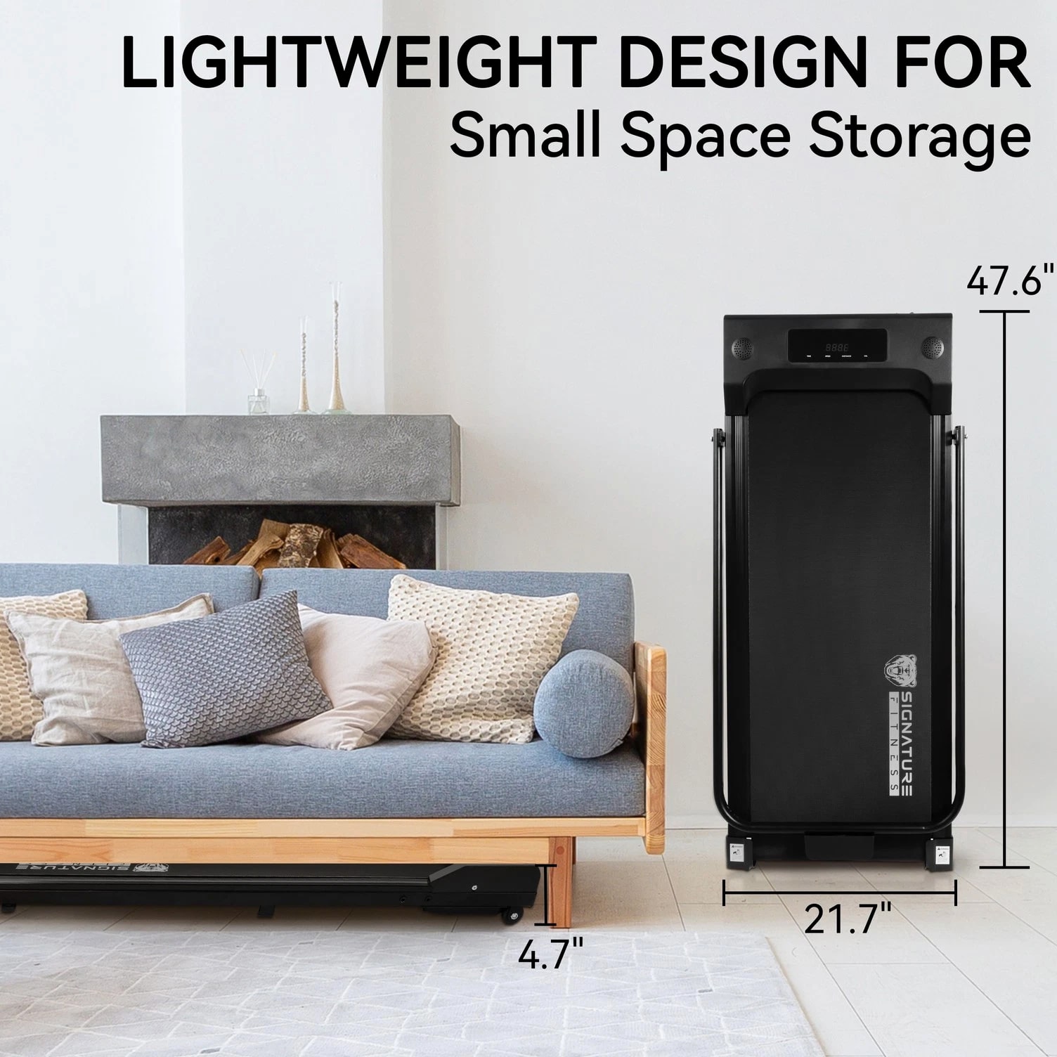 【Dual-Mode Design – Walk & Jog Freely】Supports two workout modes: use it as an under-desk walking pad while working, or lift the riser for jogging. Perfect for staying active in both home and office settings without sacrificing space. 【Precise Speed Control from 0.8 to 6 KM/H】Adjust your pace easily using the remote control. Low speeds are ideal for light walks, while higher speeds provide a steady jog—suitable for all fitness levels. 【Upgraded 5-Layer Running Belt for Comfort & Safety】Built with a multi-layered belt: wear-resistant surface, sound insulation layer, strong support, shock-absorbing cushion, and compression layer. This ensures reduced noise, joint protection, and enhanced durability. 【Zero Installation – Fold in One Step】Ready to use out of the box. No tools, no setup required. One-step folding allows quick transitions between use and storage, making it hassle-free for daily routines. 【Slim & Portable – Designed for Tight Spaces】Compact at 47.6" x 21.7" x 4.7". Store it under your bed, behind a door, or against the wall. Built-in wheels make it easy to move without heavy lifting. Maximum incline: 45% Max load: 330 lb Number of programs: 0 Features: Foldable, Compact, Portable Exercise treadmill type: Electric Exercise Treadmills Exercise treadmill motor type: Treadmill AC Drive Motor Height: 5.32 in Rec. use: Residential Color: Dark Grey Accessories included: Remote Control Rec location: Indoor Programs: Speed Model: DSV-FOB-QP-SFTM-2IN1SV-1 Power type: Corded Electric Folded item width: 21.7 in Folded item length: 47.6 in Folded item height: 4.7 in Weight: 47.3 lb Resistance method: Magnetic