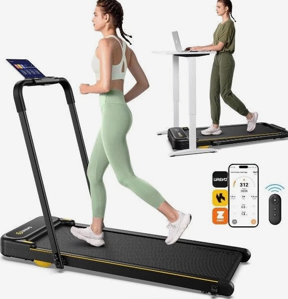 UREVO Strol 2E Smart 2-in-1 Folding Treadmill, Compact Walking Pad with Safety Handle, Plug and Play, Dual LED Display, Workout APP, Walking or Running for Home Office, Remote Included. New item, never used, open box condition.