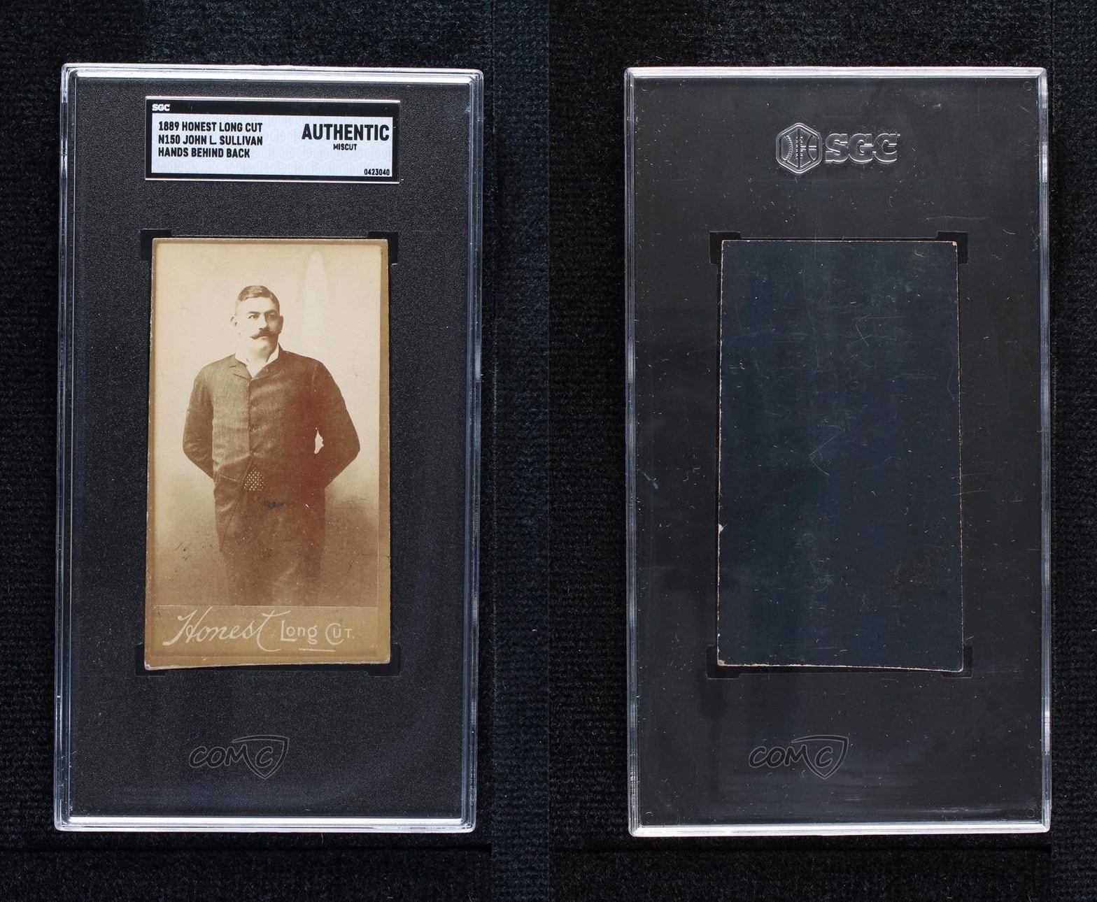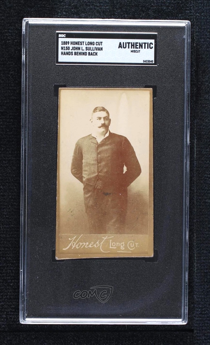 SGC Authentic condition. 1889 Duke Honest Long Cut N150 John L Sullivan card - SGC Authentic Miscut.