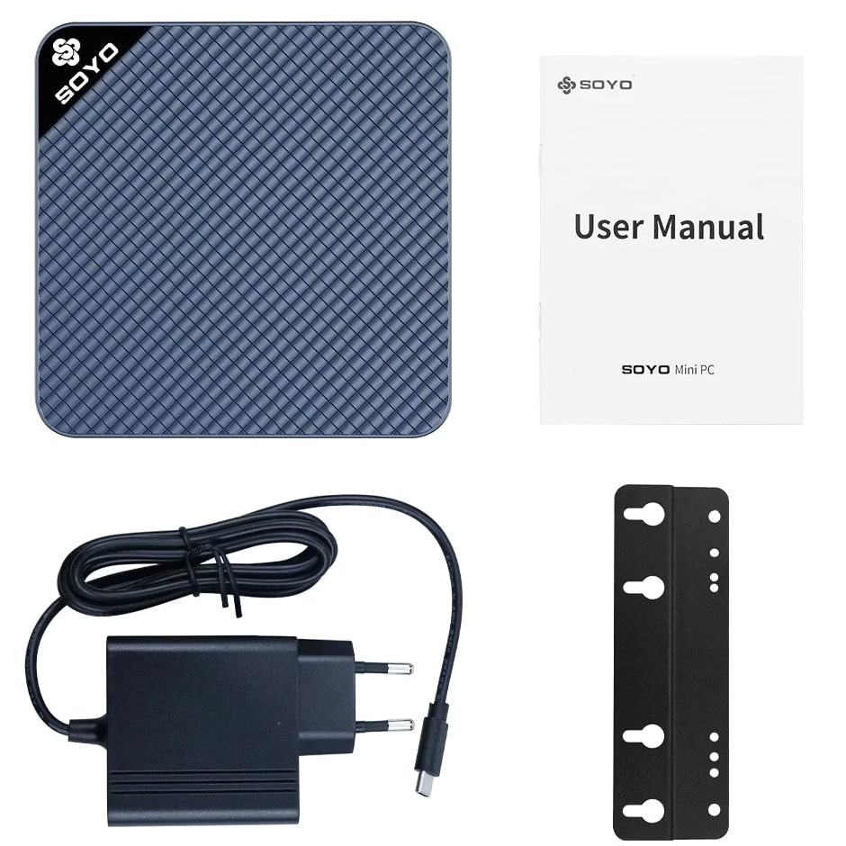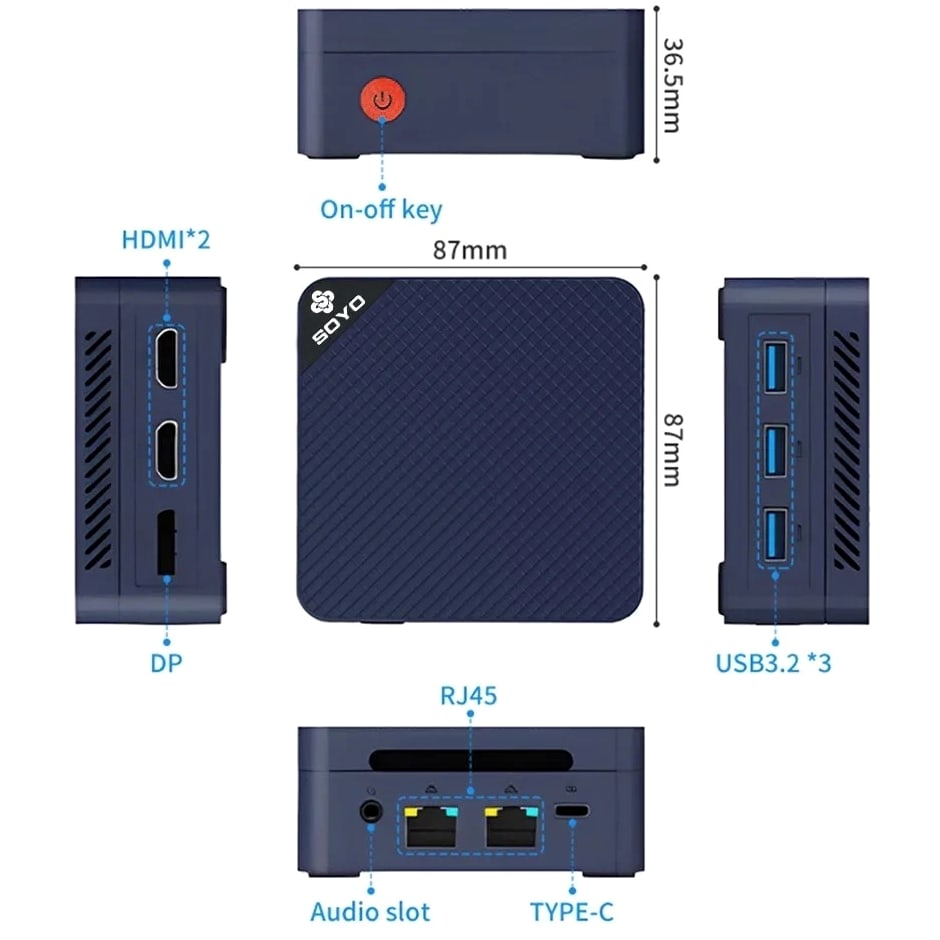 Si encuentra alguno de los siguientes problemas con su M4 Mini, comuníquese conmigo de inmediato y lo ayudaré a resolver el problema. 1.Fallo de activación del sistema 2.No se puede acceder al sistema durante un período prolongado 3.Problemas de conductor, conductores faltantes SOYO M4 Mini • Procesador: Intel® Twin Lake N150, 4 núcleos, 4 hilos, hasta 3,6 GHz, 6 W TDP (Thermal Design Power), 6 MB Smart Cache, fabricado con tecnología de proceso Intel 7 • Tarjeta Gráfica: Intel® Gráficos UHD, frecuencia central de hasta 1 GHz • Memoria: LPDDR5 4800MHz, 12GB • Almacenamiento: SSD M.2 2242 512 GB • Conectividad inalámbrica: WIFI - 5, Bluetooth 5.0 • Interfaces de salida de vídeo: 2 interfaces HDMI, 1 interfaz DP. Admite salida 4K HD de triple pantalla y decodificación de vídeo AVI • Interfaces de E/S: 3 interfaces USB3.2, 2 puertos RJ45 Gigabit Ethernet, 2 interfaces HDMI, 1 interfaz DP, 1 conector de audio, 1 interfaz tipo C • Fuente de alimentación: Tipo - C 12V/3A (incluido el adaptador) • Dimensiones: Ancho total 87 mm, altura de la máquina 36,5 mm (sin incluir almohadillas para los pies)/37,5 mm (incluidas almohadillas para los pies), peso 200 G. Compacto y portátil, sólo 1/60 del tamaño de una computadora de escritorio. Se puede montar en la pared detrás de un monitor o televisor. • Contenido del paquete: Mini host de PC, adaptador de corriente, manual de instrucciones