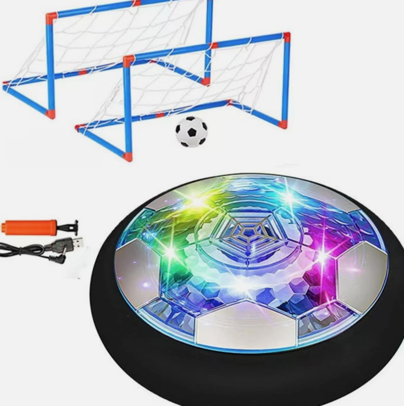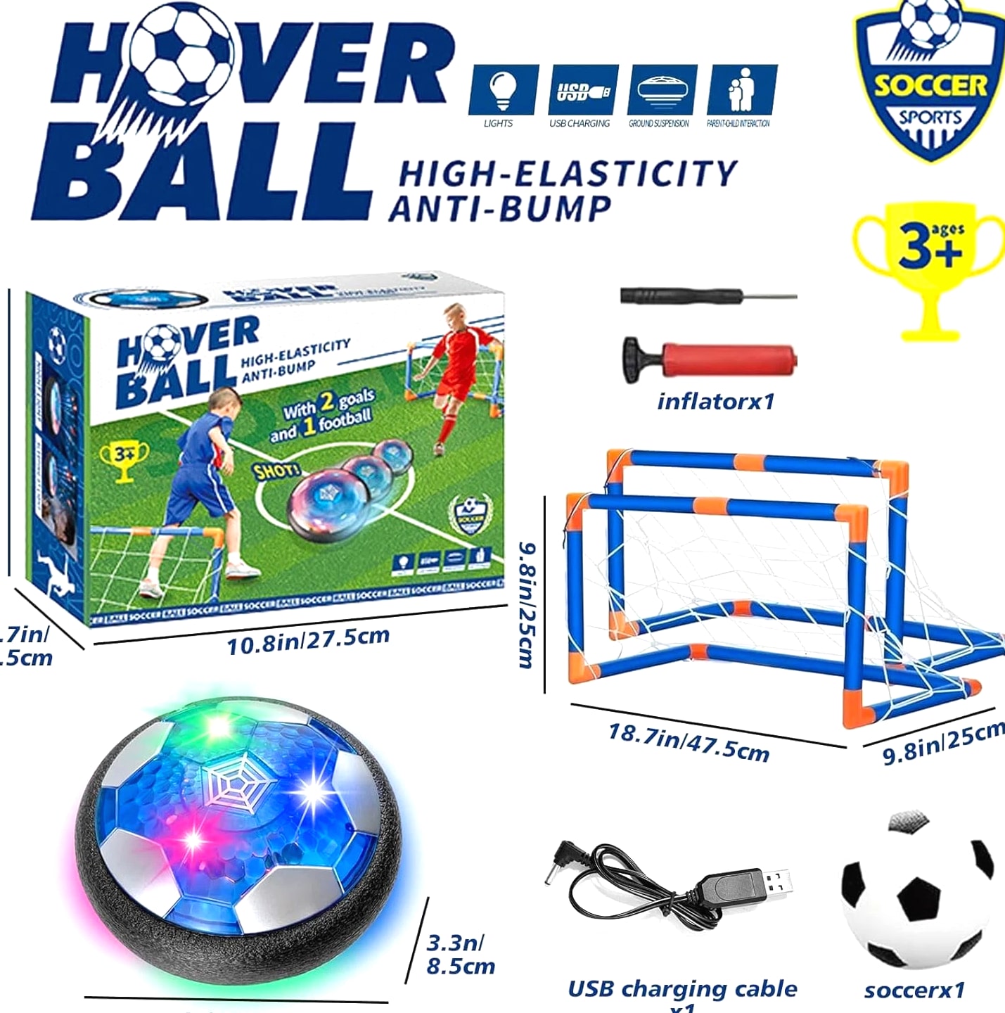 Hover Soccer Ball Set, Indoor Soccer Ball 4 in 1 Rechargeable Air Power Soccer with LED Lights and Foam Bumper Protection - Gifts for Boys Girls 3 4 5 6 7 8-12 Year Old Kids Description Item Dimensions: 8 x 3.7 x 10.8 inches Minimum Age: 48 months Theme: Sport Power Source: Rechargeable battery Age Range: Unisex Set Name: Hover Soccer Ball Set Assembly Required: No Material Type: Acrylonitrile Butadiene Styrene (ABS) Part Number: KD001 Model Number: KD001 Battery Type: Lithium Operation Mode: Automatic Size: Standard size for children's soccer Usage: Indoor Educational Objective: Locomotion, Physical coordination ability Battery: 1 Lithium Ion battery (included) Character: Football Complete Set for Endless Fun: Our rechargeable Hover Soccer Ball Set includes a floating soccer ball, an inflatable soccer ball, two detachable goals, and a soccer pump, transforming your home into a real soccer field where kids can enjoy thrilling matches. Safe Design to Protect Furniture: Made from high-quality, non-toxic materials, our hover soccer ball is safe for children. Soft foam bumpers ensure furniture and walls are protected from collisions and damage, allowing kids to play without worry. Advanced Air Hover Technology: Equipped with a powerful motor, the hover soccer ball glides smoothly over tiles, wooden floors, asphalt, and low-pile carpets. It's perfect for indoor sports games, fostering enjoyable parent-child bonding while enhancing children's physical coordination and immunity. Amazing Colorful LED Lights: The hover soccer experience becomes a dazzling light show with bright LED lights that capture children's attention, making the game even more exciting. It can also serve as a captivating bedroom decoration, creating magical nighttime atmosphere. The Perfect Gift Surprise: Whether for birthdays, Christmas, or special occasions