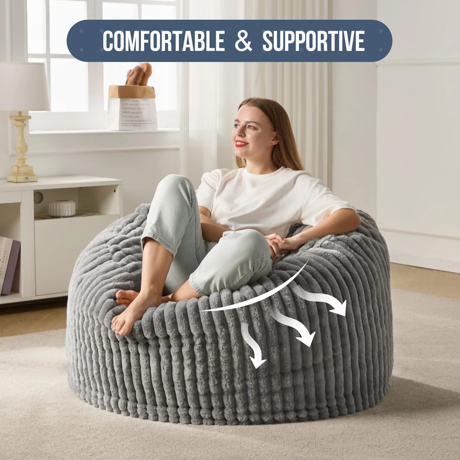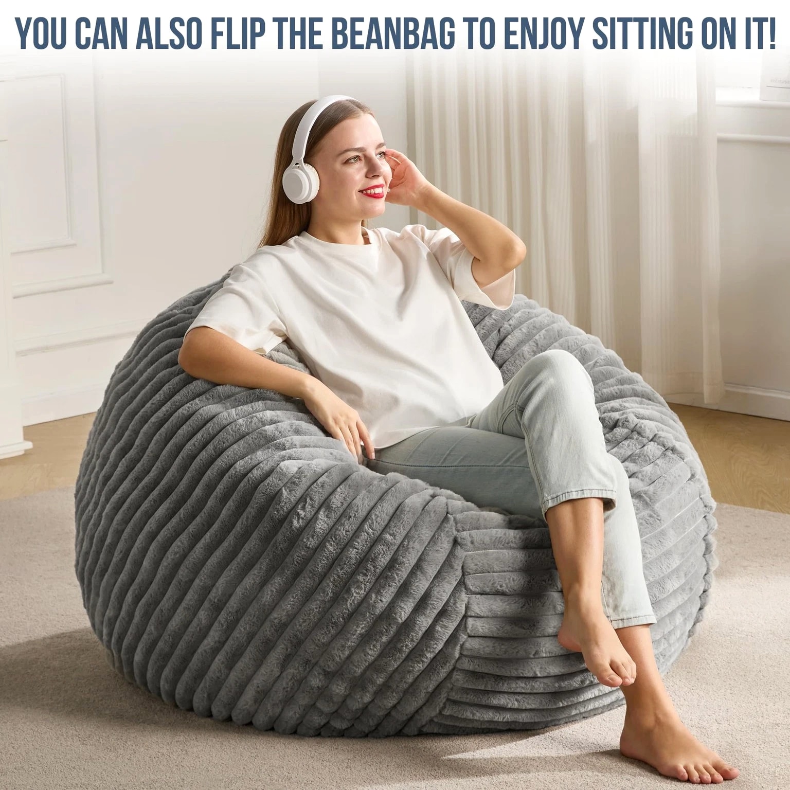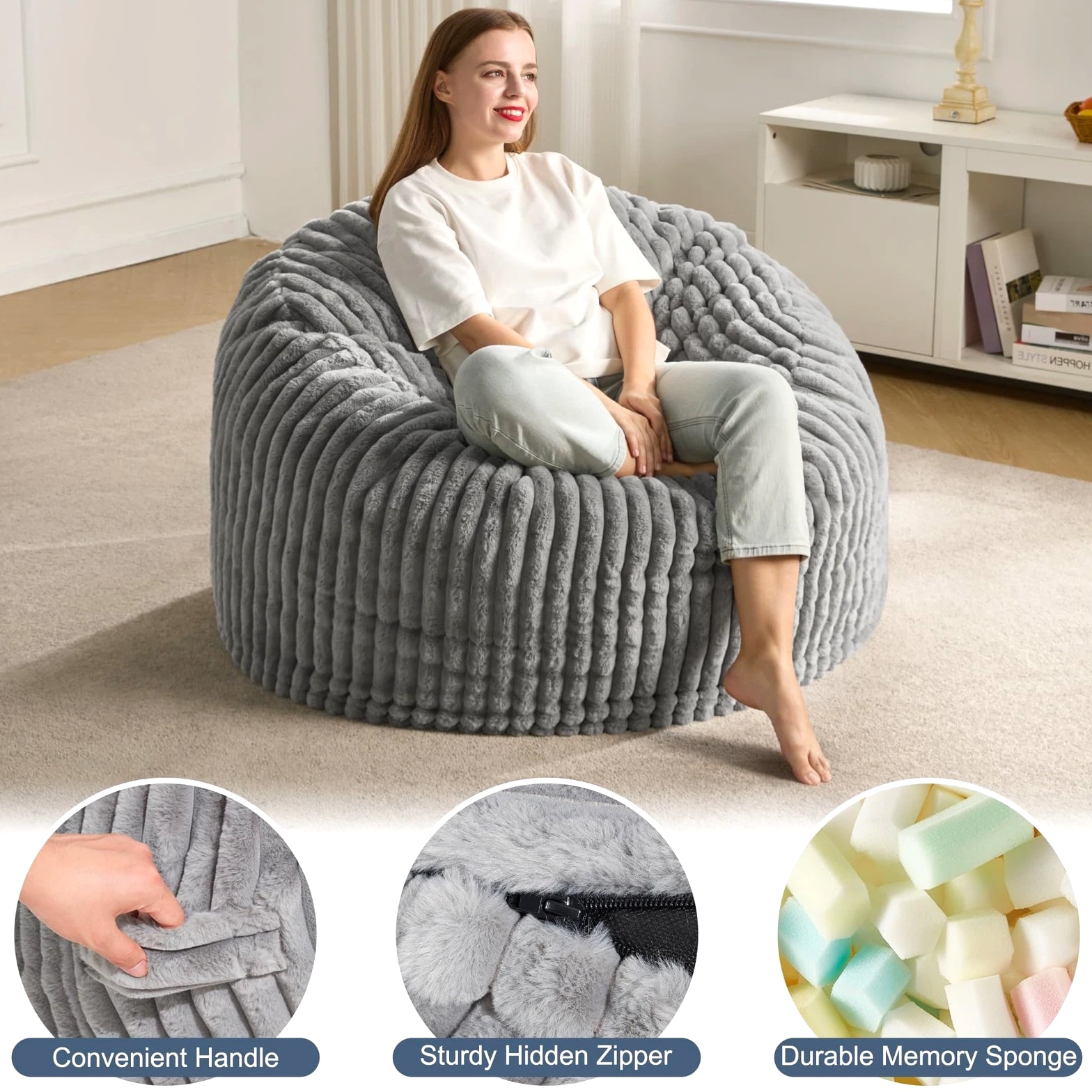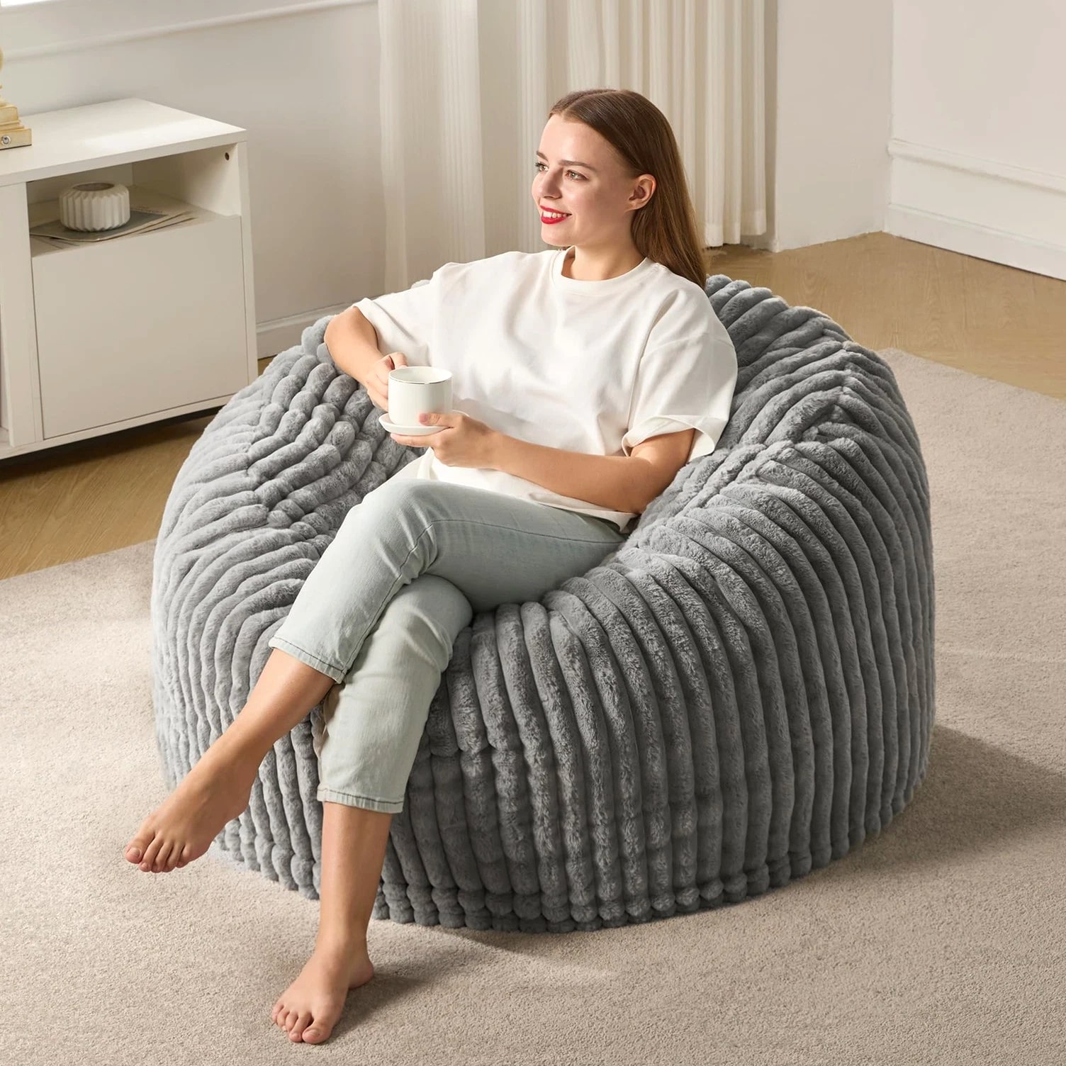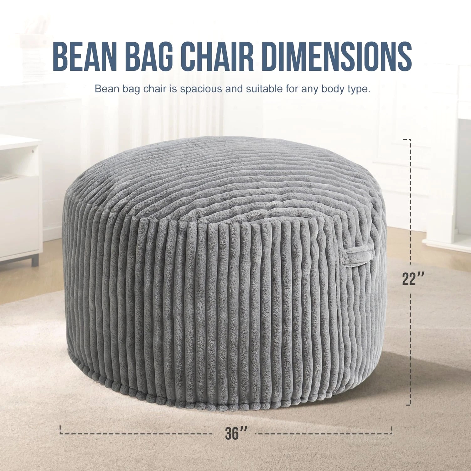 3ft Bean Bag Chairs for Adults, Large Beanbag Chair w/ Stripe Plush Cover Bi...