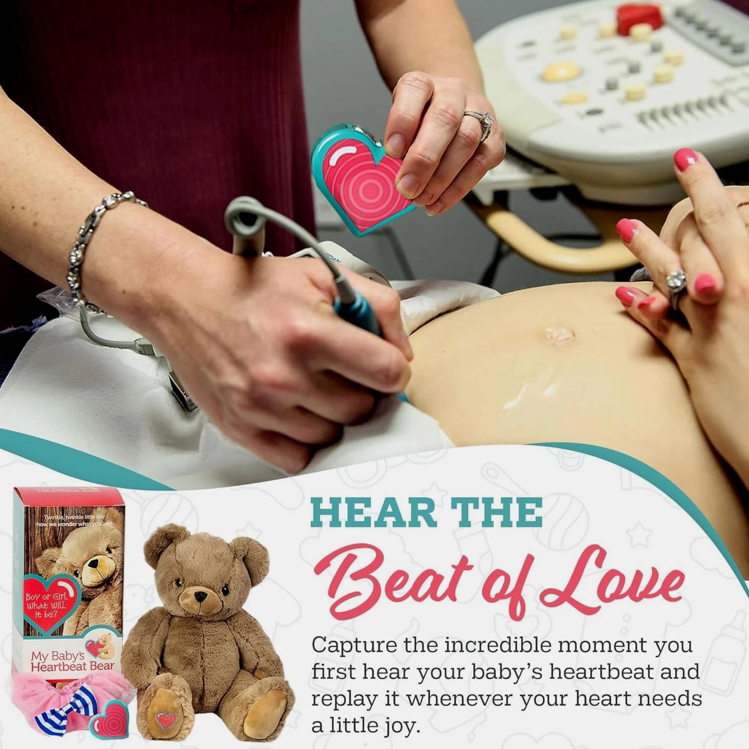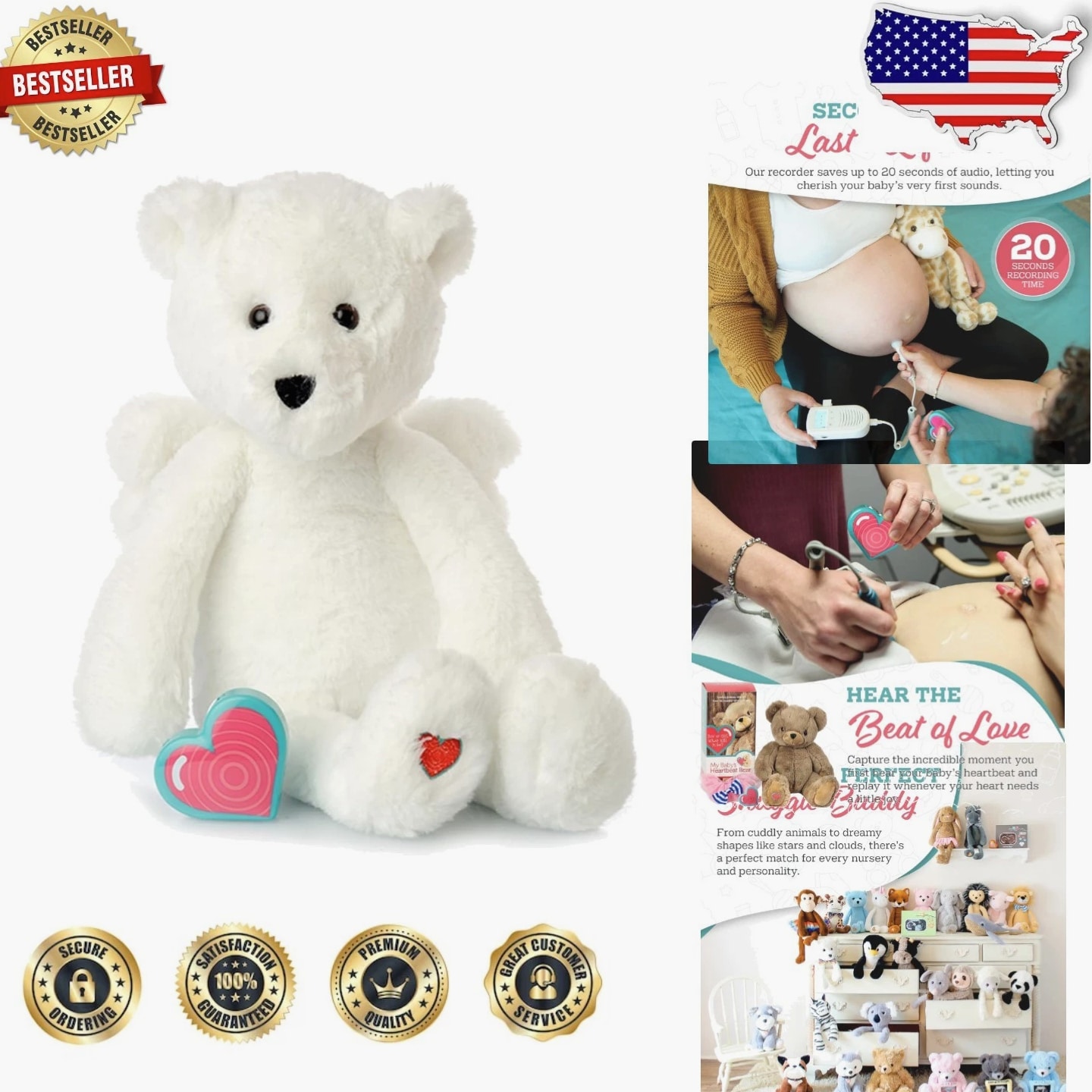 Baby Heartbeat Bear Plush Angel with 20 Sec Voice Recorder - Pregnancy Keepsake Baby Heartbeat Bear Plush Angel 20 Sec Voice Recorder Pregnancy Keepsake Product Features: Heartbeat Recorder Keepsake: Capture up to 20 seconds of your baby's heartbeat, voice, or special audio with a built-in recorder, creating a cherished keepsake for pregnancy announcements, baby heartbeat recordings, and perfect gifts for expecting parents. Built-in Voice Recorder: With a simple press, record up to 20 seconds of audio, then press again for instant playback. A lock function protects your recording, allowing you to unlock it whenever necessary to re-record important moments. Soft White Angel Bear Plush Design: Crafted from fleece-like material and filled with plush poly fiber stuffing, this 15-inch angel bear features a secure Velcro closure that safely holds the voice recorder, offering a comforting keepsake for remembrance, solace, and connection. Soft, Cute & Cuddly Variety: Available in an array of adorable designs, including bears, giraffes, elephants, and unicorns, all made from premium soft materials. These charming companions are designed to coordinate perfectly with any nursery theme. Pregnancy & Baby Shower Gift: A thoughtful choice for baby showers, gender reveals, push presents, and registry gifts, offering a personal and beautiful way to preserve heartbeat recordings and voice messages as lasting memories. Why Choose the Baby Heartbeat Bear? Embrace the magic of your baby's early moments with the Baby Heartbeat Bear Plush Angel. This charming keepsake combines the soft comfort of a plush companion with the emotional power of recorded memories, bringing you closer to your little one even before their arrival. Whether for your own growing collection or as a heartfelt gift for loved ones, this plush bear offers an everlasting connection, blending sentimentality with adorable design. Preserve these precious memories today!