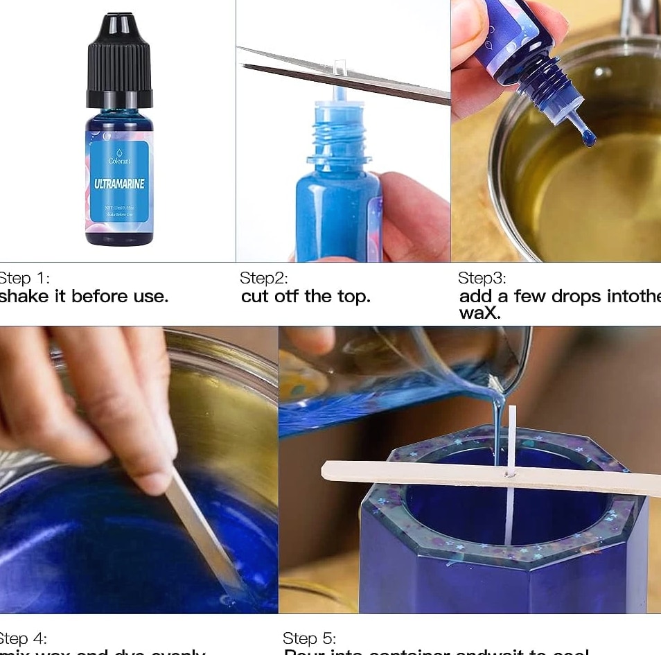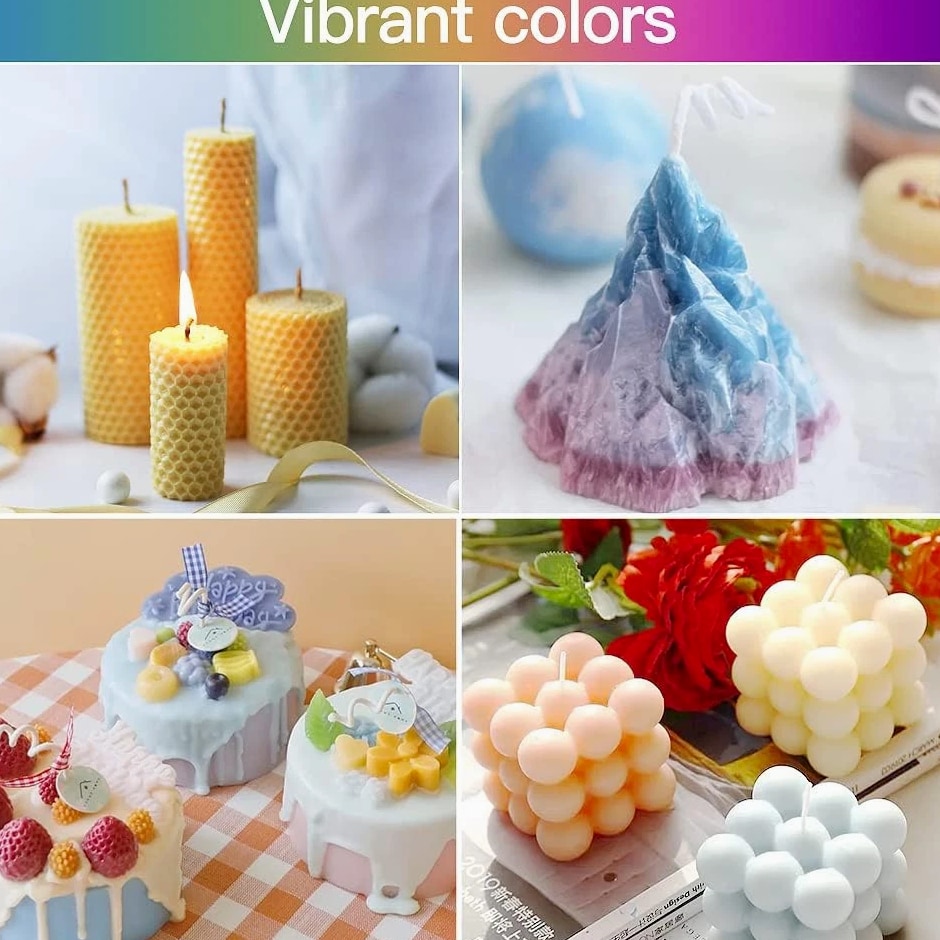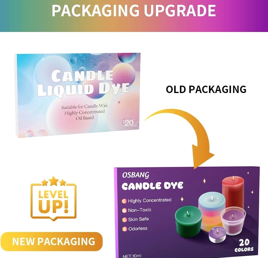 Candle Dye - 20 Colors Liquid Candle Making Dye for DIY Candle Making Supplies Kit Description Compatible Material Soy Wax, Beeswax, Gel Wax Color Multicolor Item Weight 0.35 Ounces Item Form Gel, Powder Size 20 Colors Upgraded & Concentrated Oil-Based Pigment: Upgraded pigments, finer, brighter in color, and highly concentrated, one drop dyeing, 0.35oz/10ml per bottle (please shake well before use; need darker color, add more) Safe Formula: Oil-based, with no volatile solvents, no toxic substances, pure natural mica, overall odorless. When mixed with wax, it will not produce gas or affect the smell of candles. Note: Not for aromatherapy beads and Eva beads 20 colors, more choices: We have selected the 20 most popular colors in the market for you, 0.35oz/10ml each bottle. The rich colors can create more excitement for your projects and life, let's begin now Easy To Use: Each time before use, shake until the color is evenly dispersed, then start adding dye. Need darker, add more. The proportion can be freely adjusted to your preference 24Hour - 100% QUALITY SERVICE: We provide 30-day money-back. After-service within 24 hours. If the item you received was damaged due to transportation, please contact us Product description OSBANG-Chemical Experts OSBANG, focusing on R&D, production and sales of personal DIY products Main UV resin, chameleon powder, pigment VIBRANT COLORS-LOVELY WAX OSBANG Candle dyes Upgraded pigments, finer, brighter in color, and highly concentrated, one drop achieving dyeing and perfect for Epoxy Resin Crafts DIY, Painting, Candle Making, Bath Bombs, Soap Colorant, Slime, Eyeshade Our candle wax dye is only made from high quality non-toxic and non-irritating ingredients, all of them are food grade and with MSDS. It will not produce gas after being mixed with wax or affect the smell of candle fragrance. Moreover, it will not produce any poisonous or harmful substances when burning after being made into candle Strong Dyeing Power, More Drops Mo