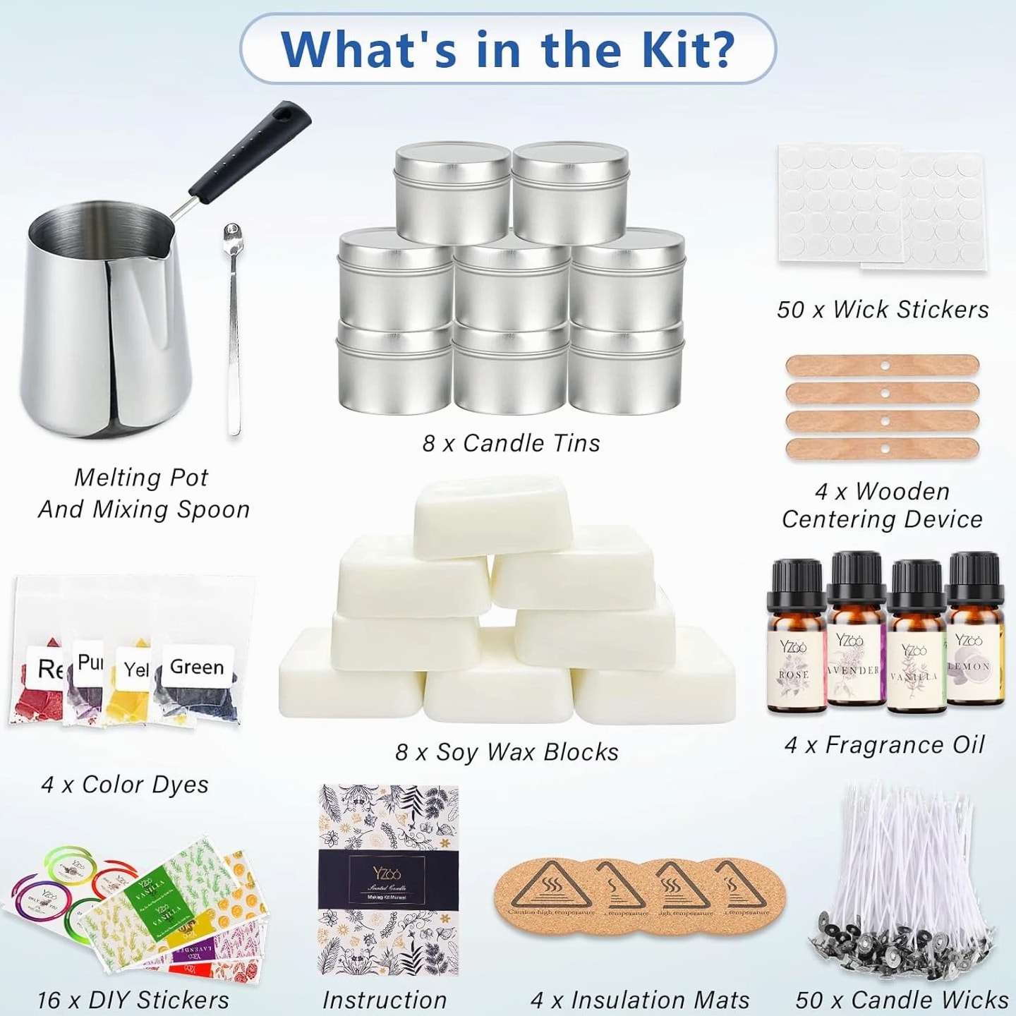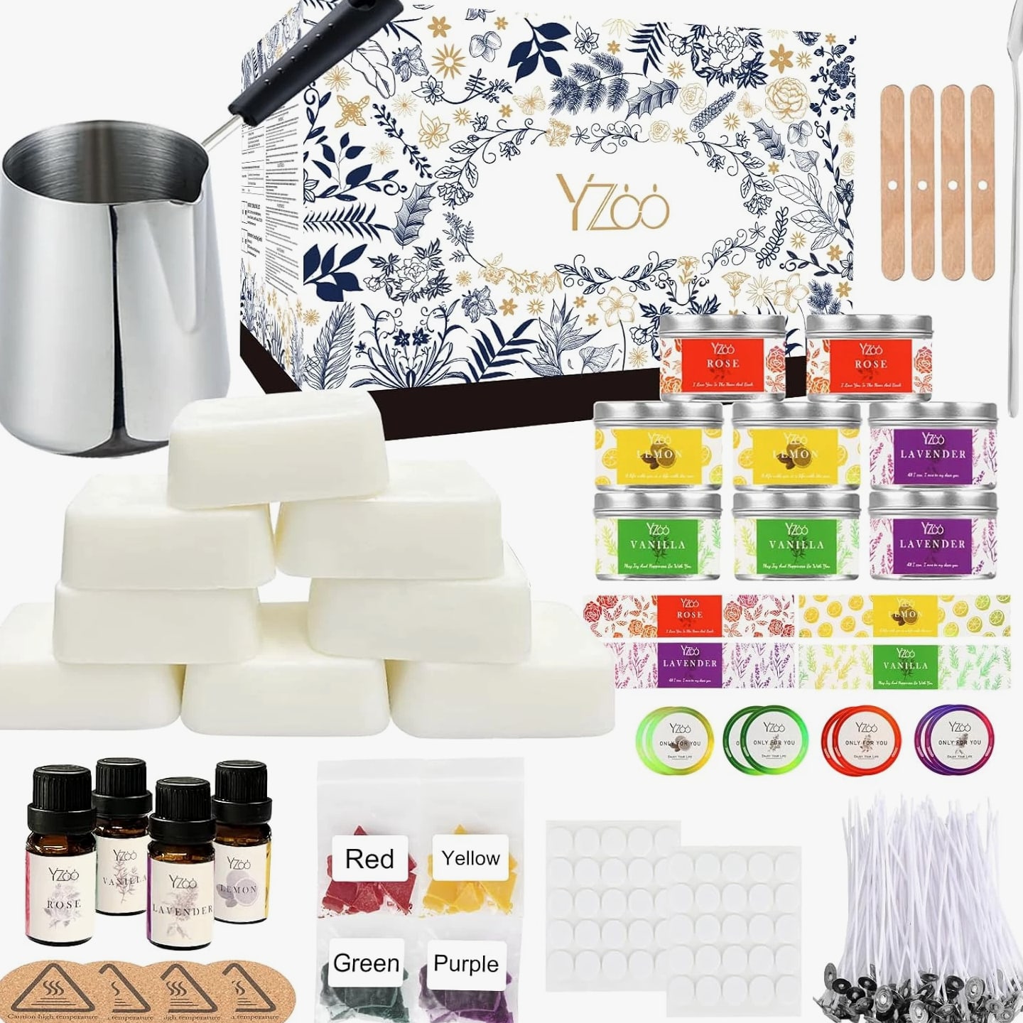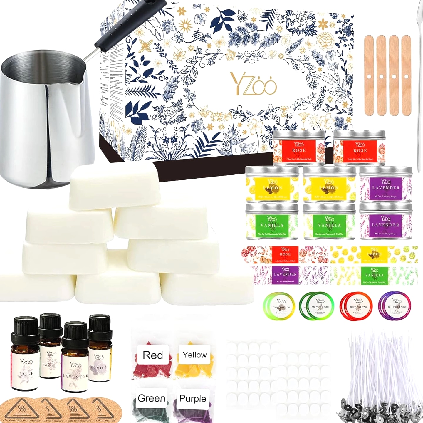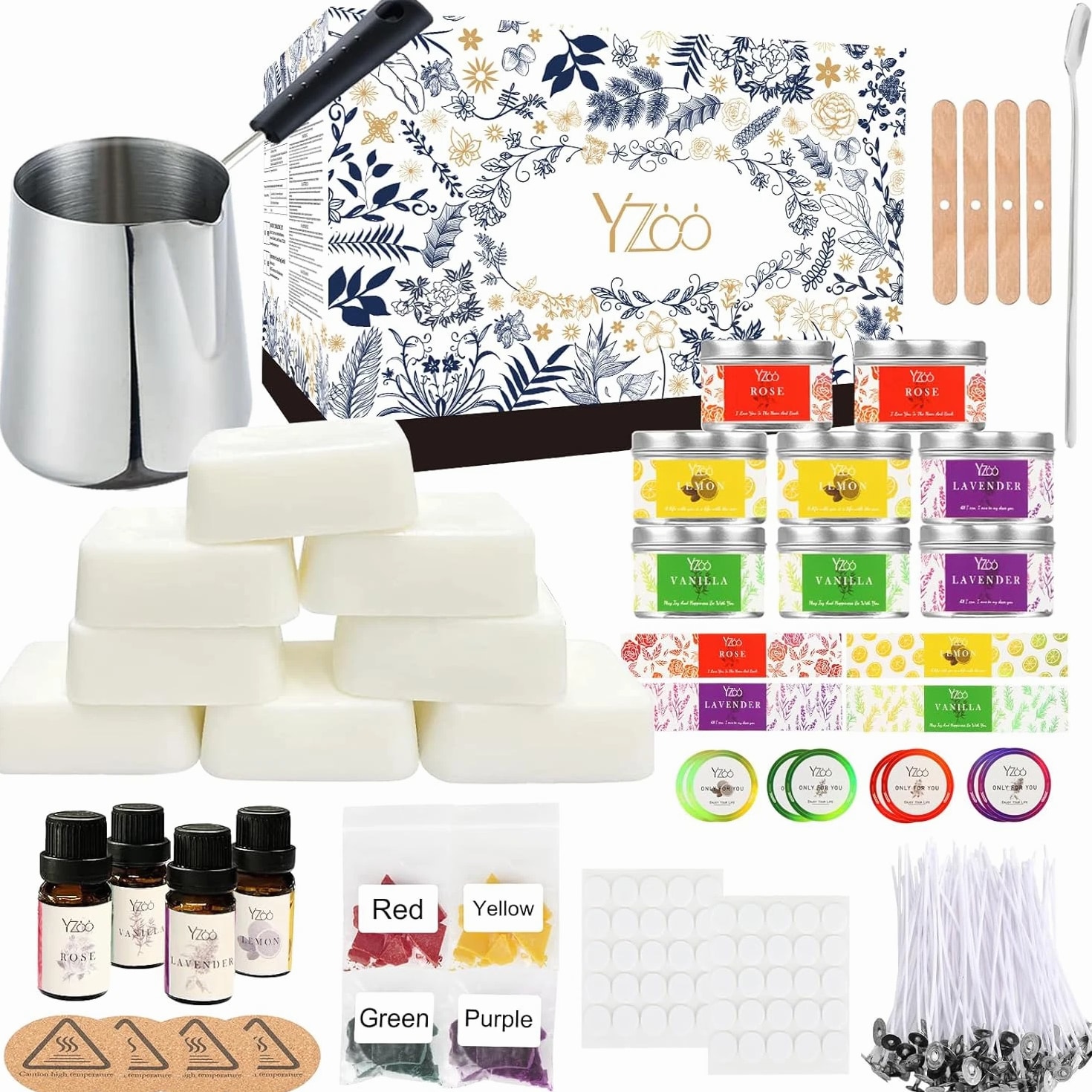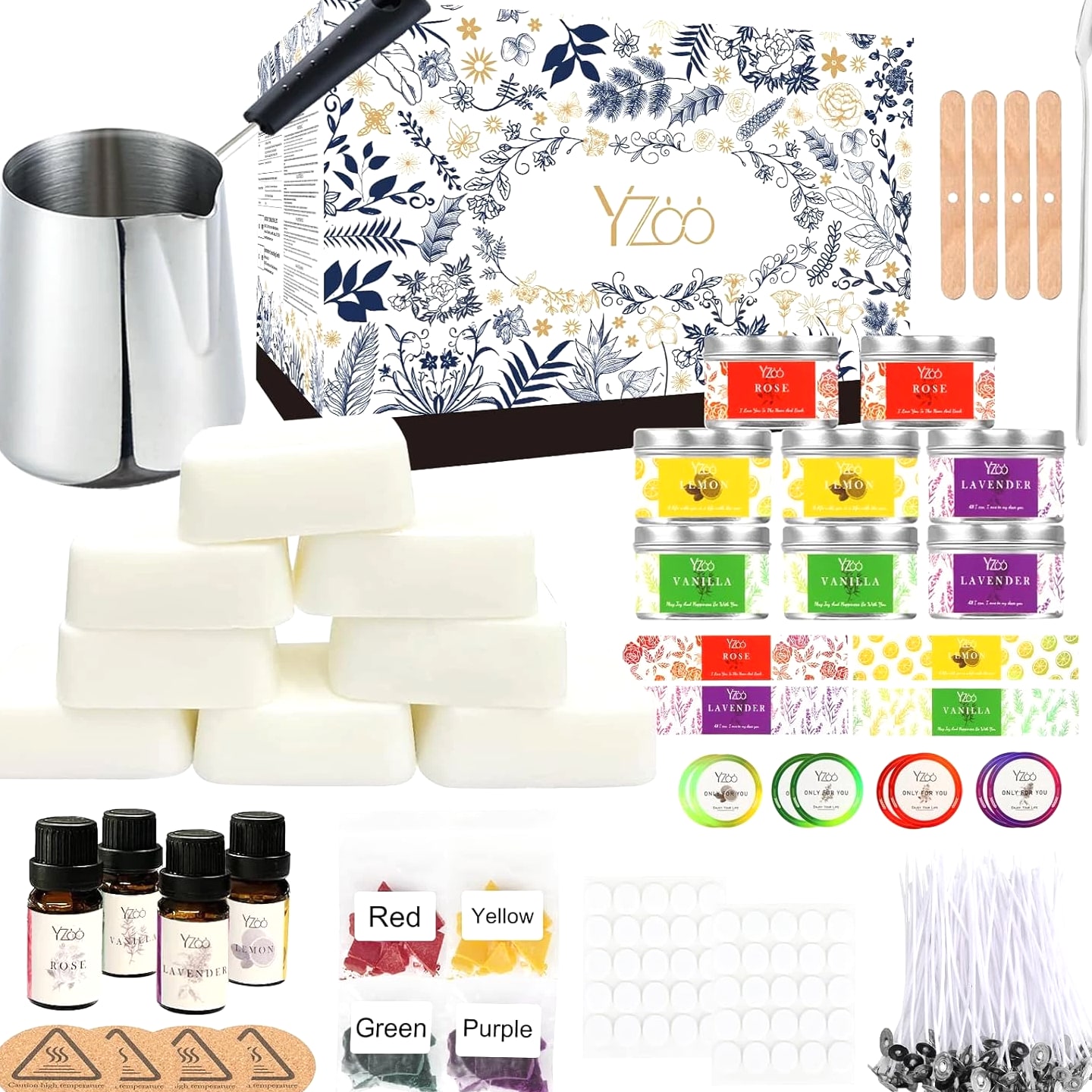 Complete Candle Making Kits for Adults Beginners, DIY Candle Making Supplies Include Soy Wax, Wax Melter, Scents, Dyes, Wicks, Wick Stickers, Candle Tins & More-Full Candle Maker Set - Arts & Crafts Kits Description Item model number 01CANDLE-NEW Item dimensions L x W x H 6.5 x 5 x 5 inches Age Range (Description) Adult Color Black Included Components 480g Soy Wax, 4 fragrance oils, 1 candle pouring pot, 50 candle wicks, 50 candle wick stickers, 4 wax dyes, 8 candle tins, 4 centering devices, 1 stirring spoon, 4 insulation mats, 16 DIY stickers, 1 user manual, and 1 exquisite gift box. Material Wax Style Box Item Weight 2.68 pounds Theme Floral Size Complete Candle Making Kit Model Name best candle new Seasons All Seasons Art Craft Kit Type Candle Making Product Dimensions 6.5 x 5 x 5 inches Paint Type Oil Number of Pieces 151 All-IN-ONE Complete Premium DIY Candle Making Kit: The candle making supplies work for all levels and contain everything needed to make scented homemade candles: 480g Soy Wax (8 block soy wax, 1 block about 60g=1 jar of candle), 4 * fragrance oils, 1* candle pouring pot with anti-scalding handle, 50 * candle wicks, 50 * candle wick stickers, 4 * wax dyes, 8*candle tins, 4* centering device, 1*stirring spoon, 4* insulation mats, 16* DIY stickers, 1 * user manual and exquisite gift box Super Easy to Make, Perfect for Beginners: The ultimate candle making set for beginners is available in our shop. Whether you are a beginner or a candle making enthusiast, owning our candle making kit is the first step to successfully making candles. The set includes step-by-step instruction and all necessary soy wax, dyes, essential oils and other accessories for making candles. Come and try this DIY candle making set to start your journey as a handmade candle designer Advanced and Superior Quality of Soy Wax: The candle making kit features 100% natural soy wax, and the completed candles will not easily deform or break, allowing for long-time clean burning. And soy wax has e