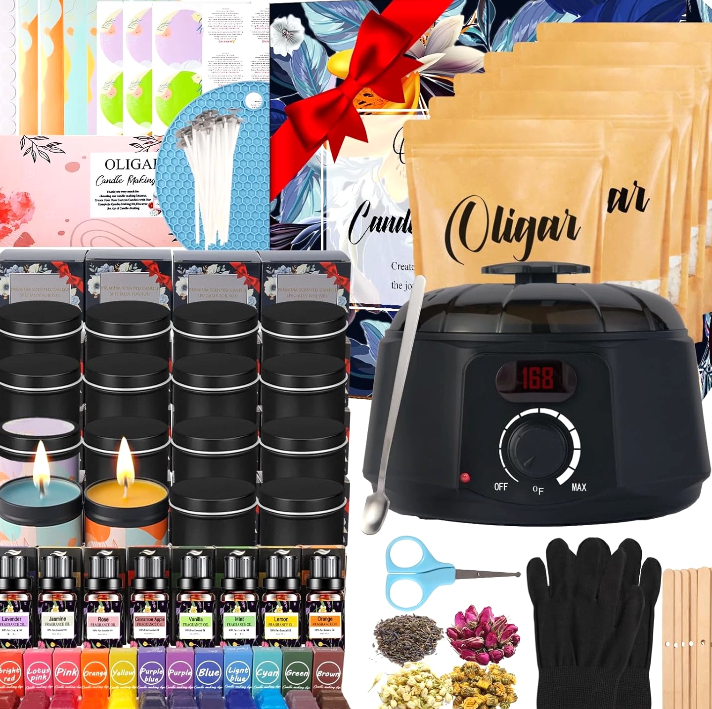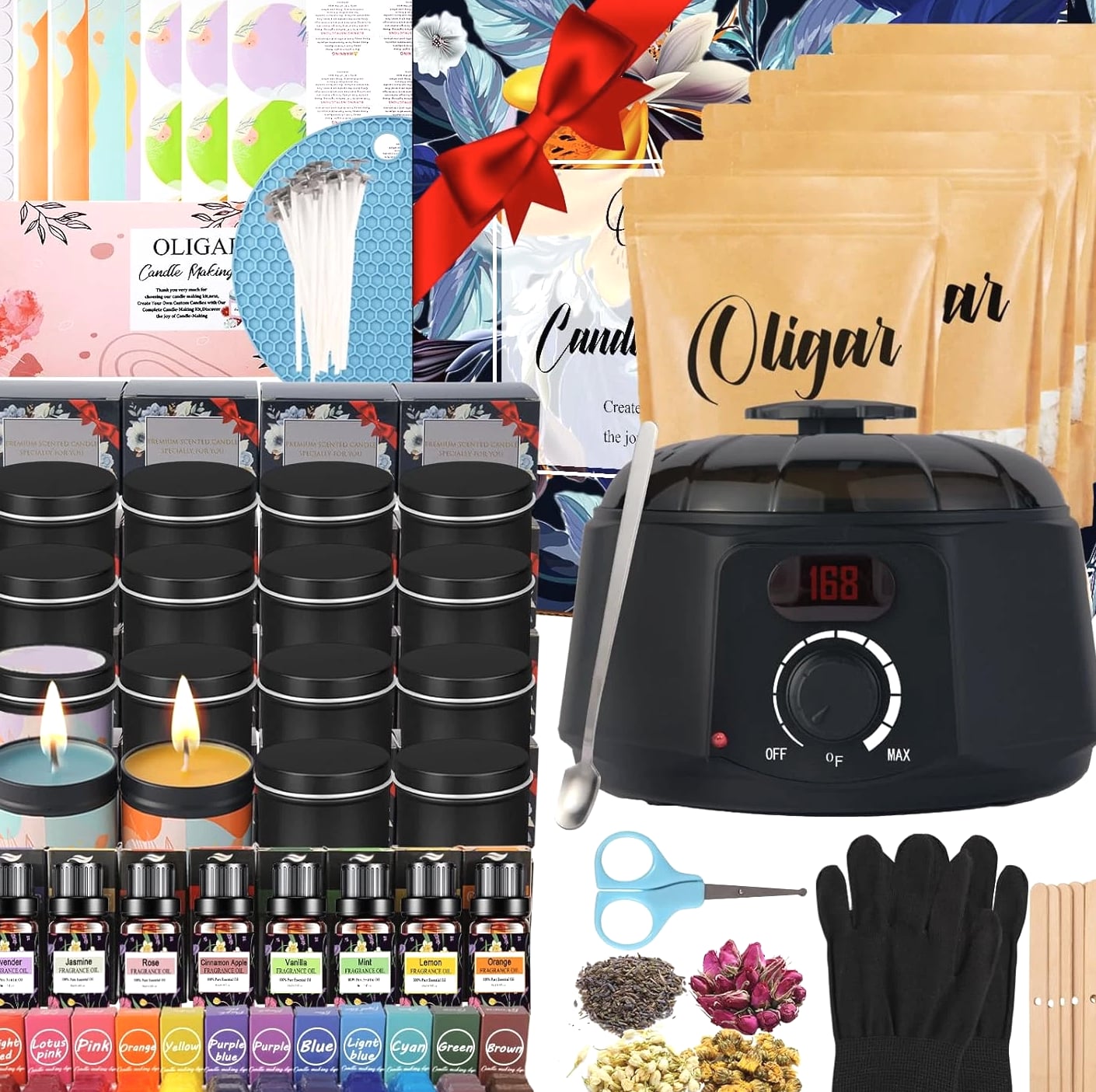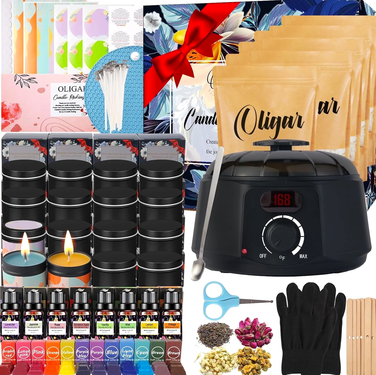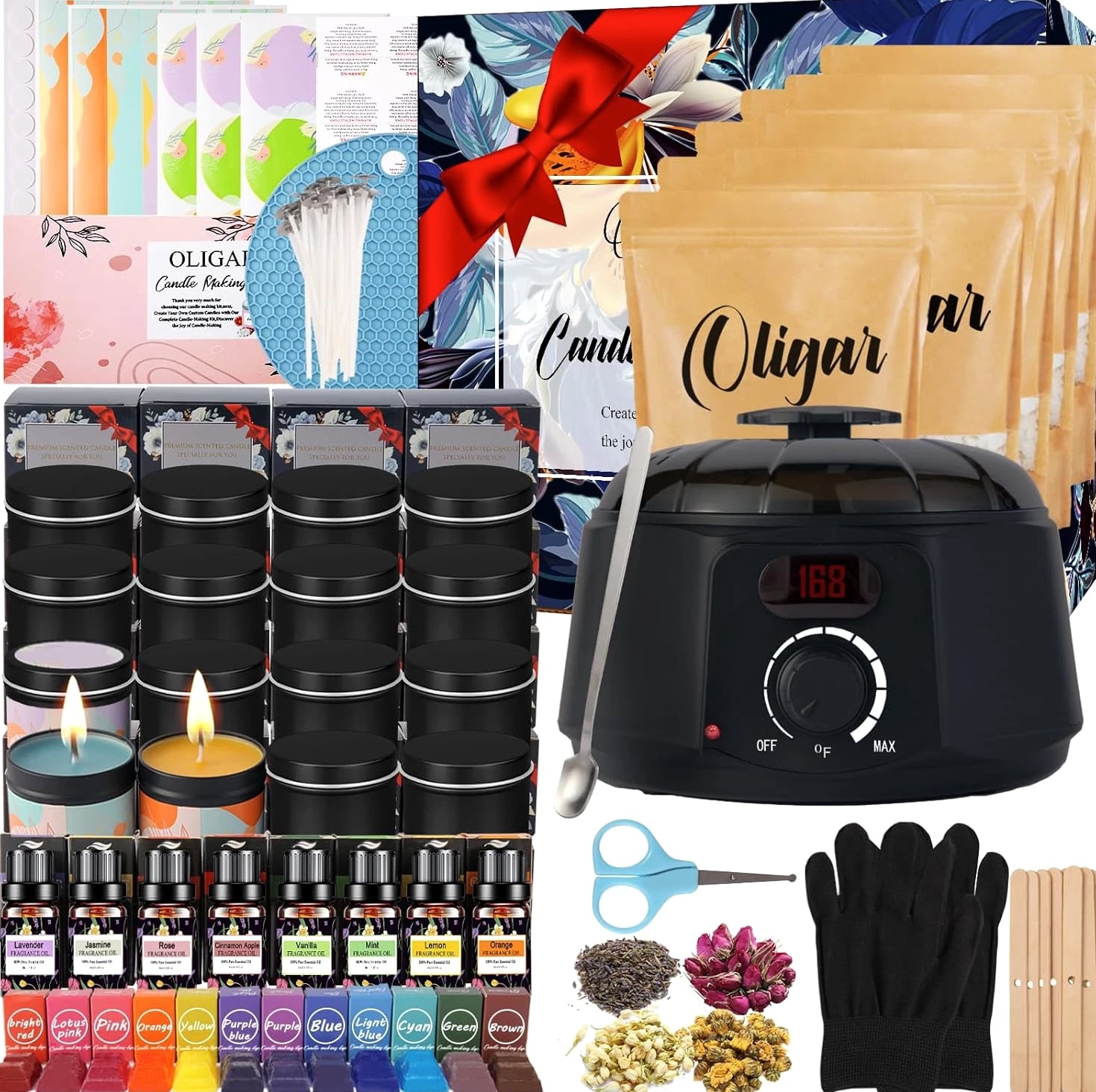 [Easy To Use For All Levels]: With super detailed and easy-to-follow step-by-step instructions, manual and video, our candle making kit is easy for both experienced candle lovers and beginners to create beautiful candles. [A Complete & Cost-Effective DIY Kit]: Making your own candles with this candle making supplies is more cost-effective compared to buying pre-made scented candles. Our candle kit provides all needed materials and tools including 1 candle wax melter, 8 essential oils (Lavender + Rose + Lemon + Jasmine + Mint + Orange + Apple Cinnamon + Vanilla), 8 bags of Beeswax, 12 dyes, 1 wick sticker, 20 Candle Wicks, 16 wick centering devices, 16 Candle Jars, 1 stirring Spoon, 1 pair of Anti Scalding Gloves etc. [All Natural Beeswax] Equipped with 100% natural beeswax & 8 kinds of premium essential oils, a natural & eco-friendly option. It burns smokeless, non-toxic, safe and has a longer burning time. The unique scents of the candles help relax and relieve stress. Creating your own candles with distinctive fragrances brings a calm and cozy ambiance. Besides making scented candles, you can explore your creativity to make other types of candles, such as colored candles or holiday-themed candles. [A Great Activity For Family & Friends]: Whether it's during weekend family time or special holidays, you can invite your children to join you in making candles with our complete DIY candle making kit. It strengthens your parent-child relationship and cultivates their creativity and manual skills. You can also enjoy the joy of creating and the opportunity for interaction with your friends, bringing you closer and happier. [Unique Gift]: Our candle making kit for adults comes in a beautiful box. If you are looking for a thoughtful and creative present, this will be a good choice. For those who like handmade and DIY craft hobby kits, this candle maker kit will be even a better & unique Christmas gift, birthday gift, Mother's Day gift or holiday gift, anniversary gift. Product descri