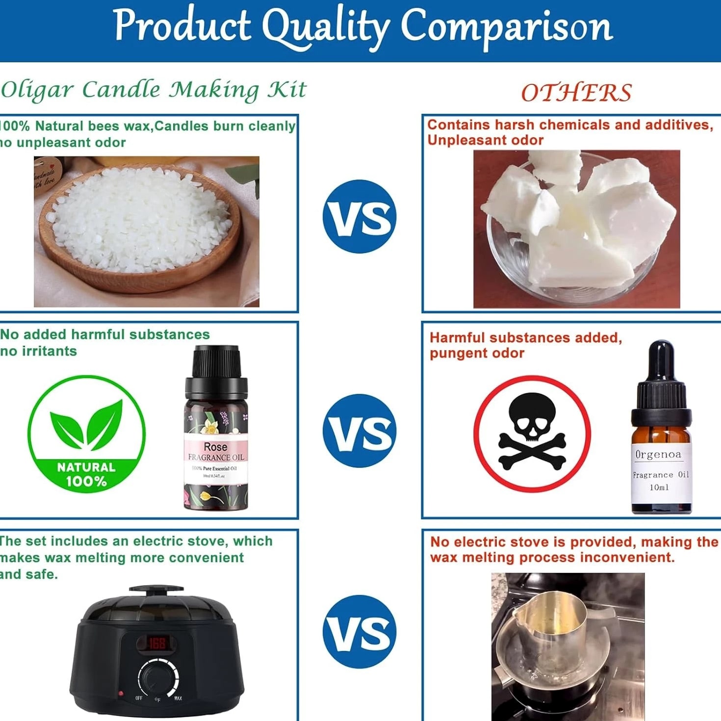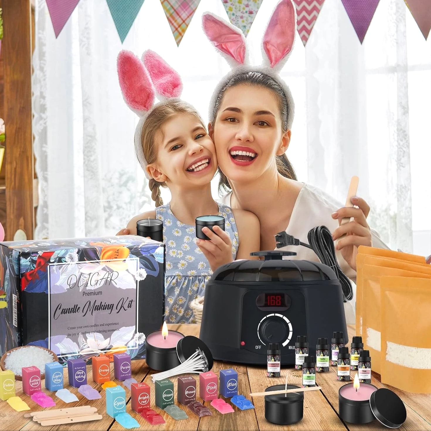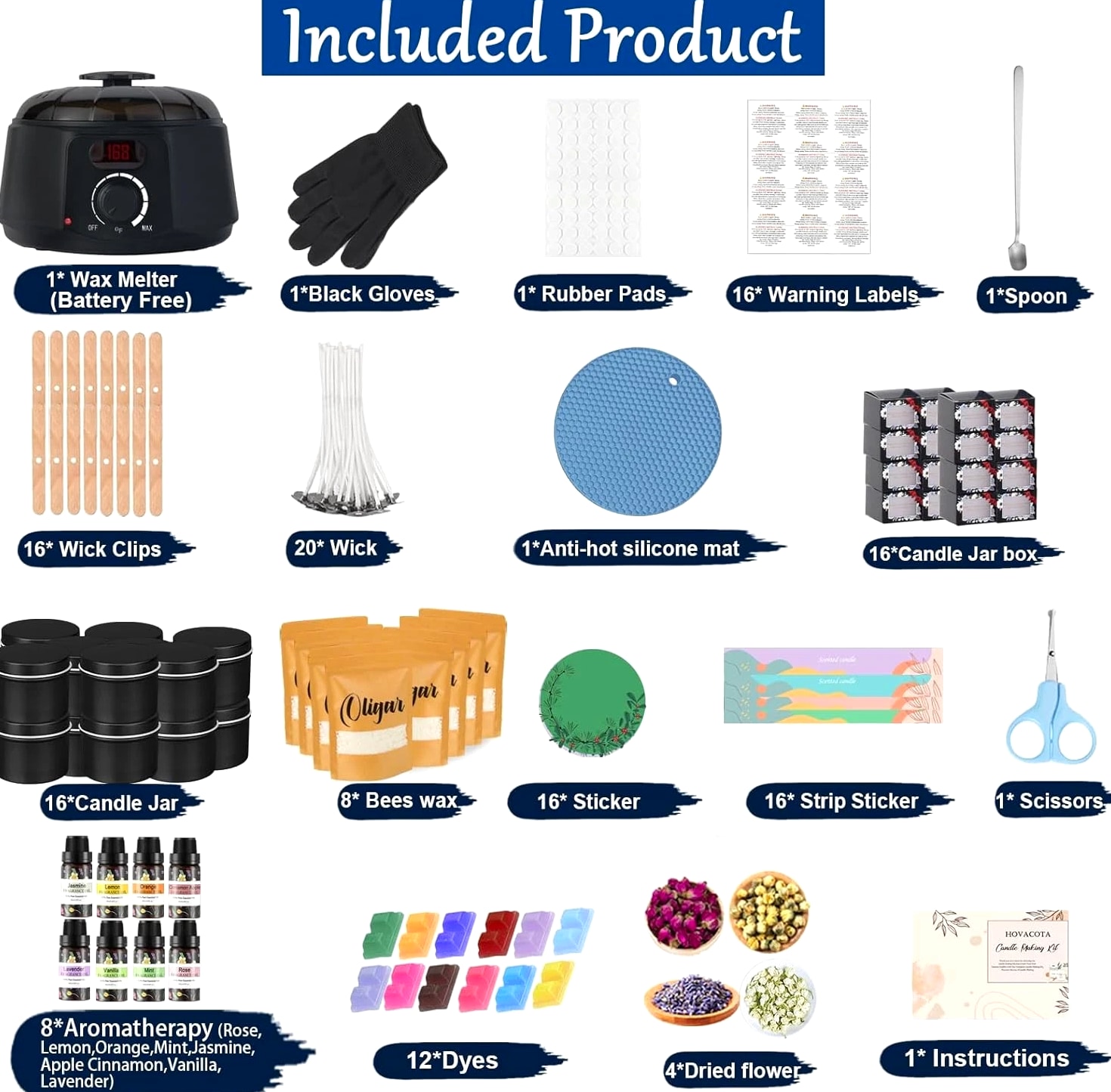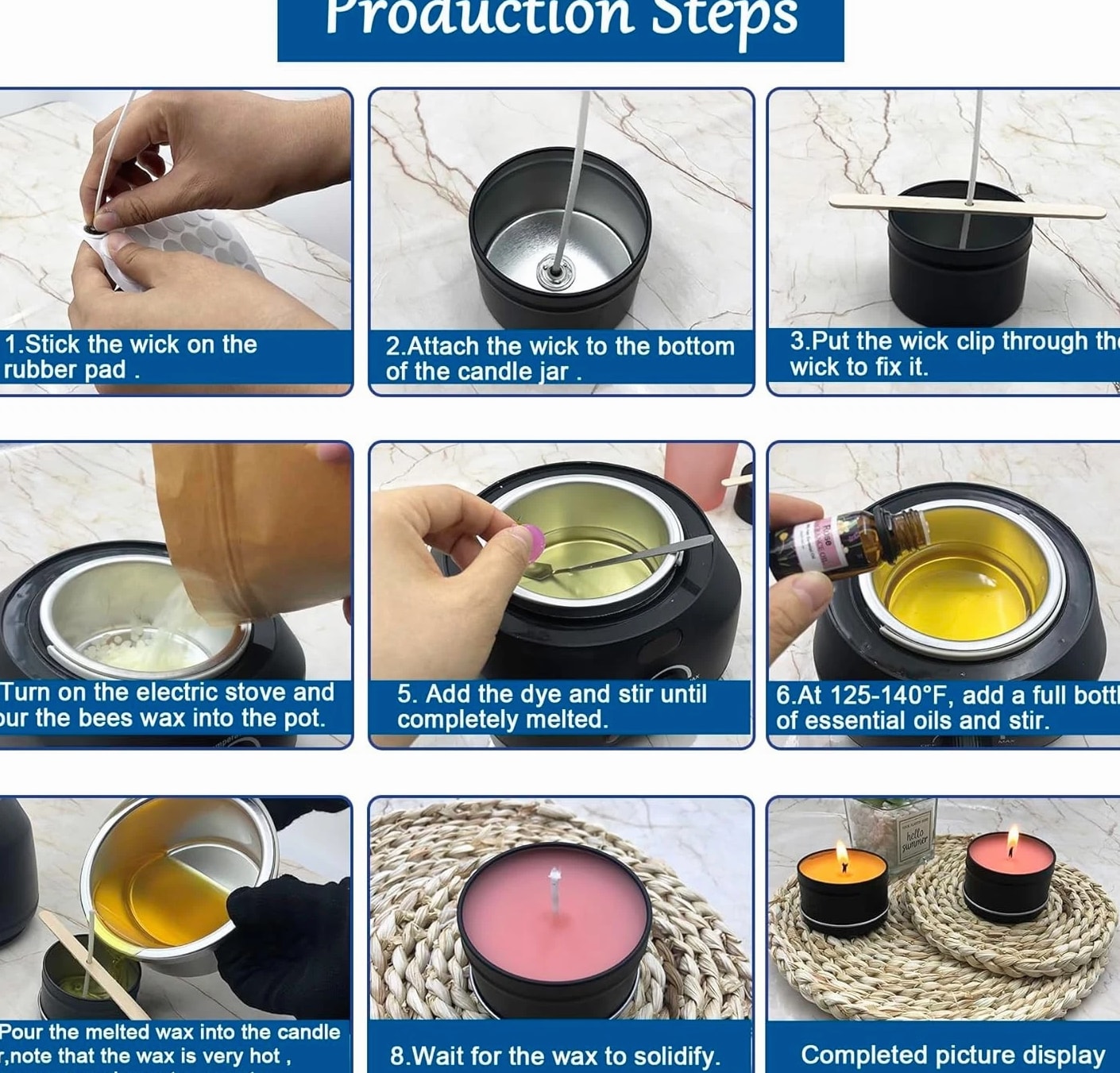 [Easy To Use For All Levels]: With super detailed and easy-to-follow step-by-step instructions, manual and video, our candle making kit is easy for both experienced candle lovers and beginners to create beautiful candles. [A Complete & Cost-Effective DIY Kit]: Making your own candles with this candle making supplies is more cost-effective compared to buying pre-made scented candles. Our candle kit provides all needed materials and tools including 1 candle wax melter, 8 essential oils (Lavender + Rose + Lemon + Jasmine + Mint + Orange + Apple Cinnamon + Vanilla), 8 bags of Beeswax, 12 dyes, 1 wick sticker, 20 Candle Wicks, 16 wick centering devices, 16 Candle Jars, 1 stirring Spoon, 1 pair of Anti Scalding Gloves etc. [All Natural Beeswax] Equipped with 100% natural beeswax & 8 kinds of premium essential oils, a natural & eco-friendly option. It burns smokeless, non-toxic, safe and has a longer burning time. The unique scents of the candles help relax and relieve stress. Creating your own candles with distinctive fragrances brings a calm and cozy ambiance. Besides making scented candles, you can explore your creativity to make other types of candles, such as colored candles or holiday-themed candles. [A Great Activity For Family & Friends]: Whether it's during weekend family time or special holidays, you can invite your children to join you in making candles with our complete DIY candle making kit. It strengthens your parent-child relationship and cultivates their creativity and manual skills. You can also enjoy the joy of creating and the opportunity for interaction with your friends, bringing you closer and happier. [Unique Gift]: Our candle making kit for adults comes in a beautiful box. If you are looking for a thoughtful and creative present, this will be a good choice. For those who like handmade and DIY craft hobby kits, this candle maker kit will be even a better & unique Christmas gift, birthday gift, Mother's Day gift or holiday gift, anniversary gift. Product descri