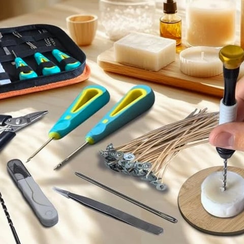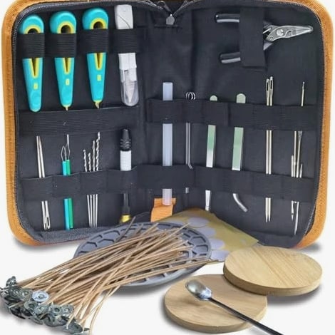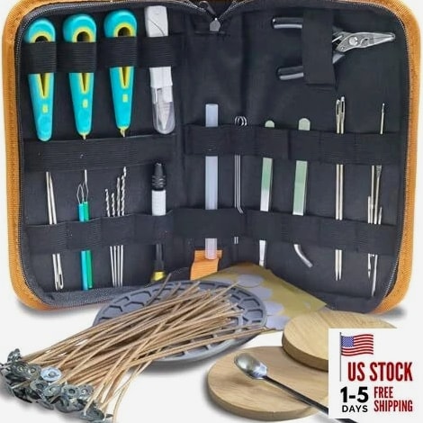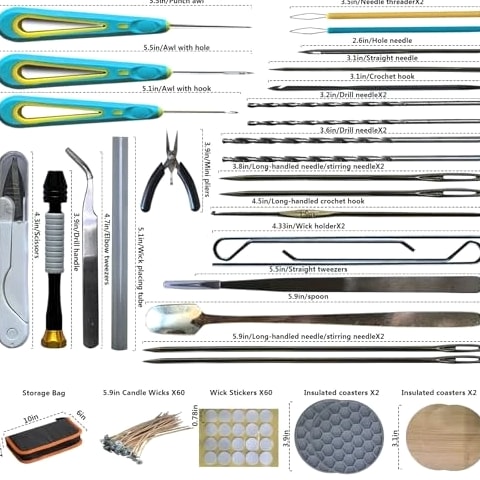 Fast Delivery 1-5 Days Trusted Quality Beginner's Candle Making Kit for Adults, Wick Needle for Candle Making for Punching and Inserting Candle Molds Wicks, Candle Making Tools Perfect for Silicone Molds with No Holes for Wicks Product Description COMPLETE TOOL SET: Professional candle-making tools and various accessories are neatly organized in a portable pouch. This durable zippered pouch features elastic bands to securely hold all tools, ensuring easy access and preventing loss. It's also very convenient to carry. SIMPLE AND PRACTICAL: The set includes a pointed awl, a hook awl, and a large-eye awl, along with a drill bit and a large-eye wick needle. The awl is suitable for drilling holes in thinner molds and candles with finer wicks, while the large-eye wick needle accommodates a wider range of wick sizes and thicknesses. You can also drill holes directly on candles that are not fully solidified or have been heated. The included drill bit makes it easier to drill holes in fully solidified or harder candles, preserving the candle's integrity during the drilling process. Making candles is now easier than ever. CAREFULLY SELECTED: The wick needle is made of high-strength metal, making it easy to drill and punch holes in silicone candle molds. The extended, non-slip handle fits perfectly in the hand for a comfortable grip. The wick holder easily secures metal and wooden wicks. The set includes a silicone heat-resistant mat and a bamboo mat. The bamboo mat prevents damage to your work surface during candle making or drilling, meeting the needs of various occasions. The silicone heat-resistant mat protects your work surface from high temperatures during wax melting or candle burning, ensuring a safer and cleaner DIY workspace. MULTI-FUNCTIONAL: This DIY candle-making kit can be used for a variety of candle-making tasks, such as drilling holes, threading wicks, securing wicks, stirring wax, and cutting and picking up wicks. It is suitable for a wid
