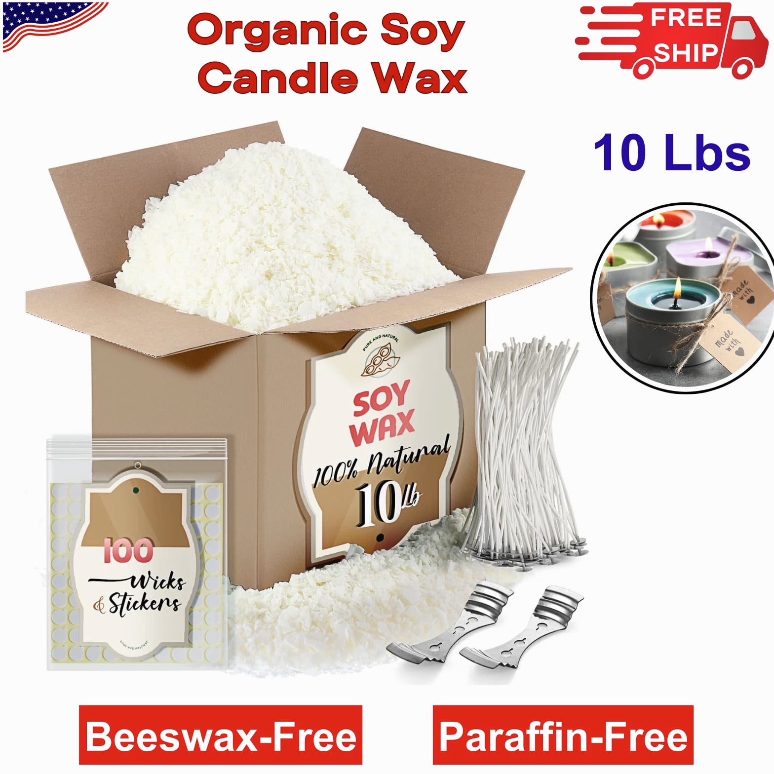 Natural Organic Soy Candle Wax Bulk For Candle Making, 10 lbs Soy Wax Flakes Kit