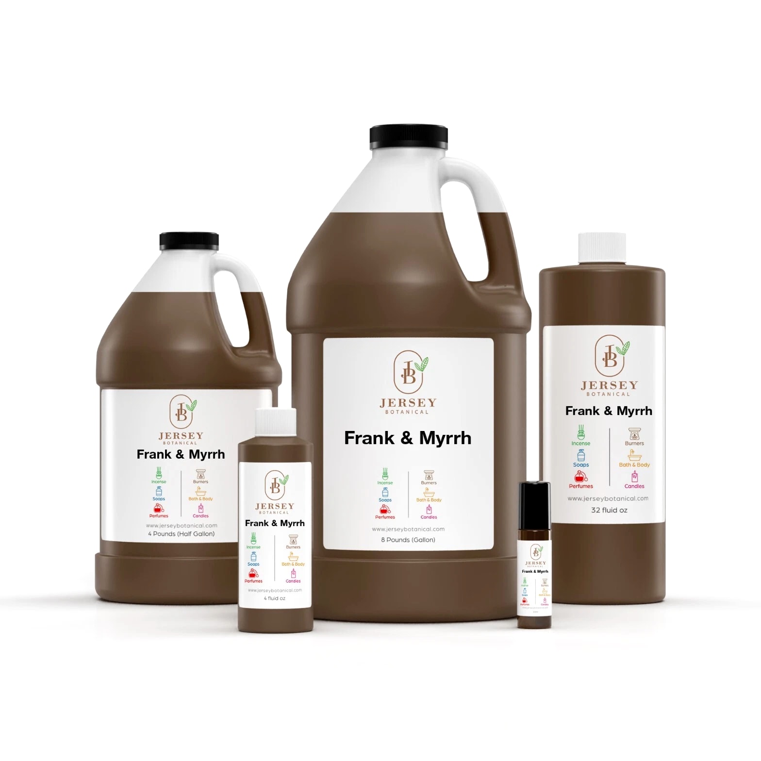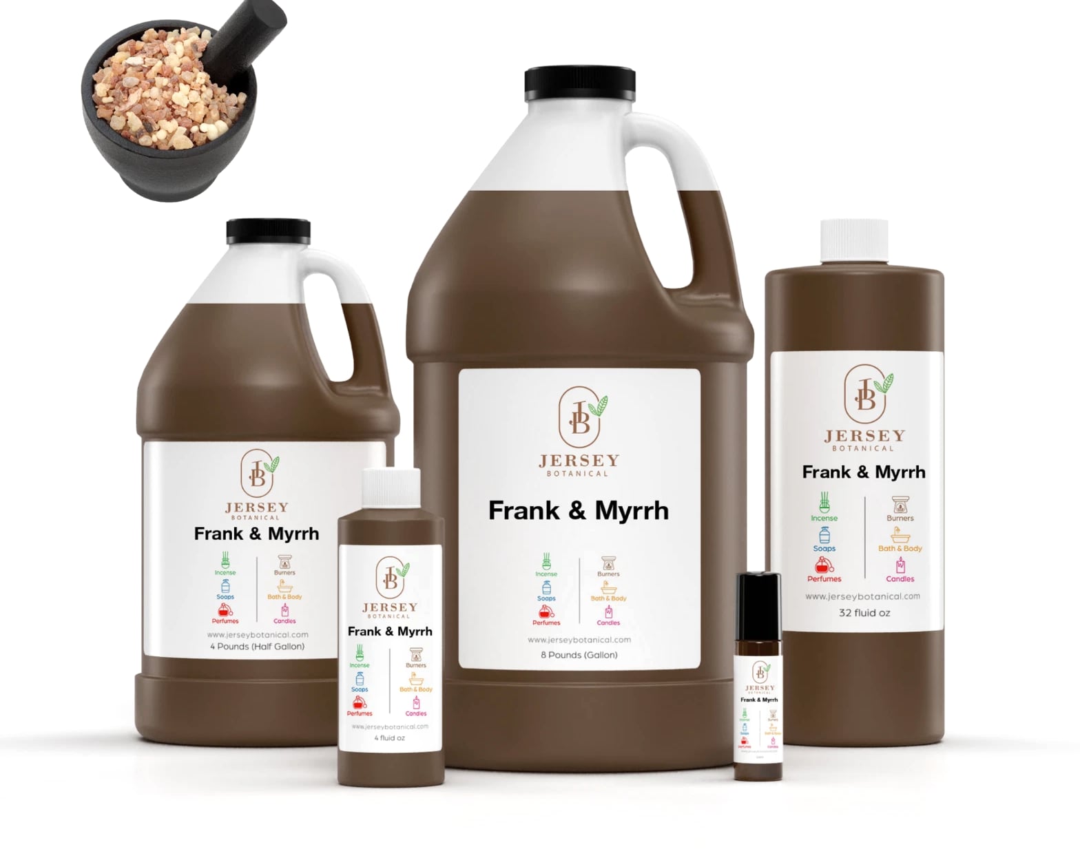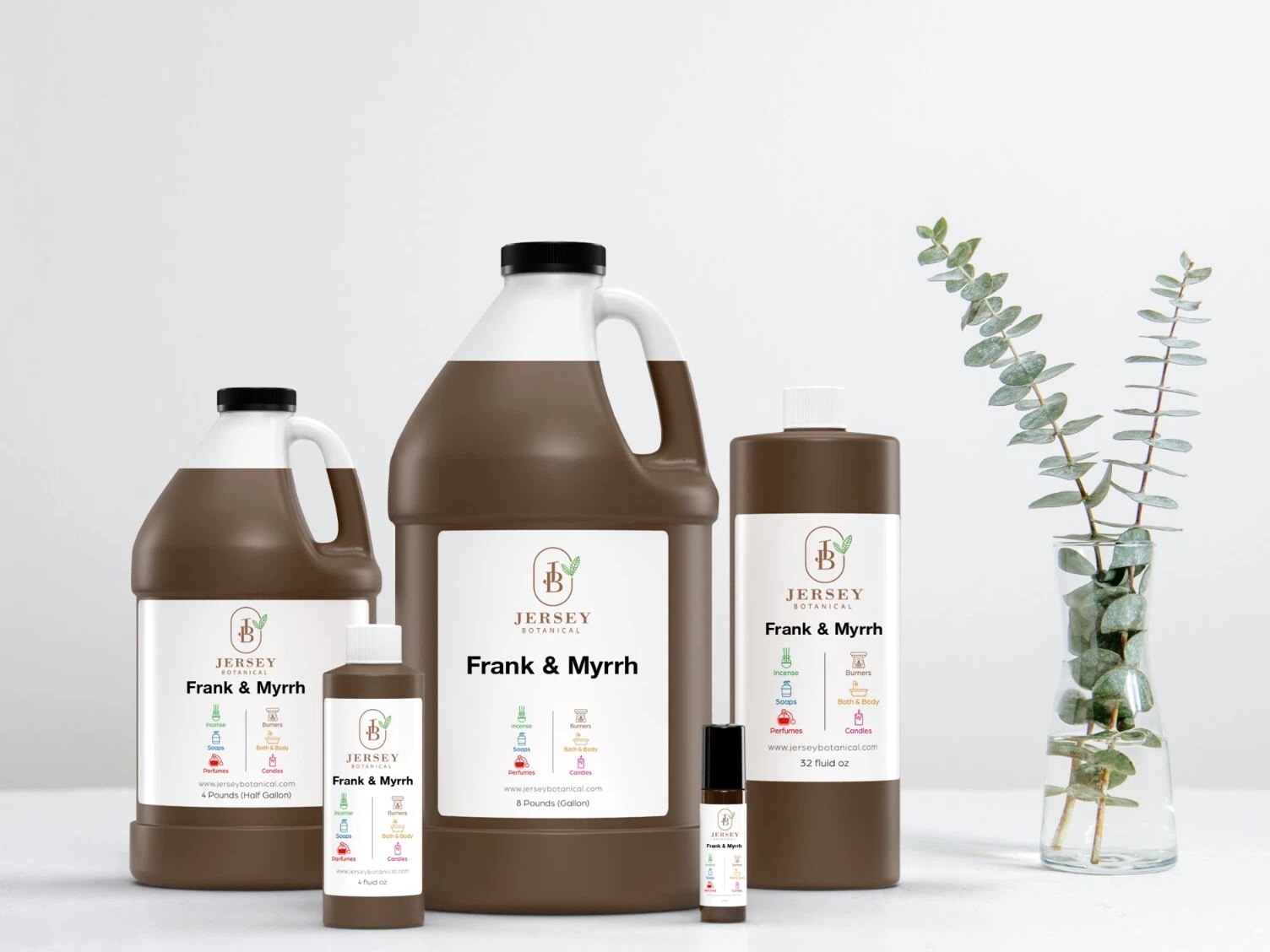 Products Like Our Page Check Our Feedback Contact Us Fair Price TESTED BEFORE USE QUALITY GUARANTEED SATISFACTION GUARANTEED Frankincense & Myrrh Product Uses Great for Bath Bombs Perfect for Candles & Soaps Known to Last Long with Diffusers Amazing for Moisturizing the Body Ultimate Aroma for Perfumery Favorite Product Details Frankincense and Myrrh fragrance oil tends to have a complex and captivating aroma with elements of warmth, richness, and a touch of mystery. Frankincense and myrrh fragrance oil already has a rich and distinctive scent. However, if you're looking to enhance or complement its aroma, consider the following scents to mix with it: What scents are good to mix with Frank & Myrrh fragrance oil? Citrus scents: Add a touch of brightness and freshness by incorporating citrus notes such as orange, lemon, or bergamot. These can provide a vibrant and uplifting element to the fragrance blend. Spice scents: Enhance the warm and aromatic qualities of the fragrance oil by including spices like cinnamon, clove, or cardamom. These spices can contribute a cozy and comforting element. Floral scents: For a softer and more delicate touch, consider incorporating floral notes like rose, jasmine, or lavender. These scents can provide a subtle balance and floral complexity to the blend. Lasting fragrance hours later for: Candles Soaps Perfumes What else can this be used for? Fragrance oils are enchanting essences that add captivating scents to a wide range of products. From perfumes and candles to soaps and home fragrances, they infuse personal care items and living spaces with delightful aromas, creating a sensory experience that uplifts and delights. Explore a world of endless possibilities as fragrance oils become the key ingredient in crafting unique, personalized scents that leave a lasting impression. Pros Phthalate, Alcohol, Cruelty, and Dilution Free Why Jersey Botanical? We're your destination for premium grade fragrance oils that won't break your bank