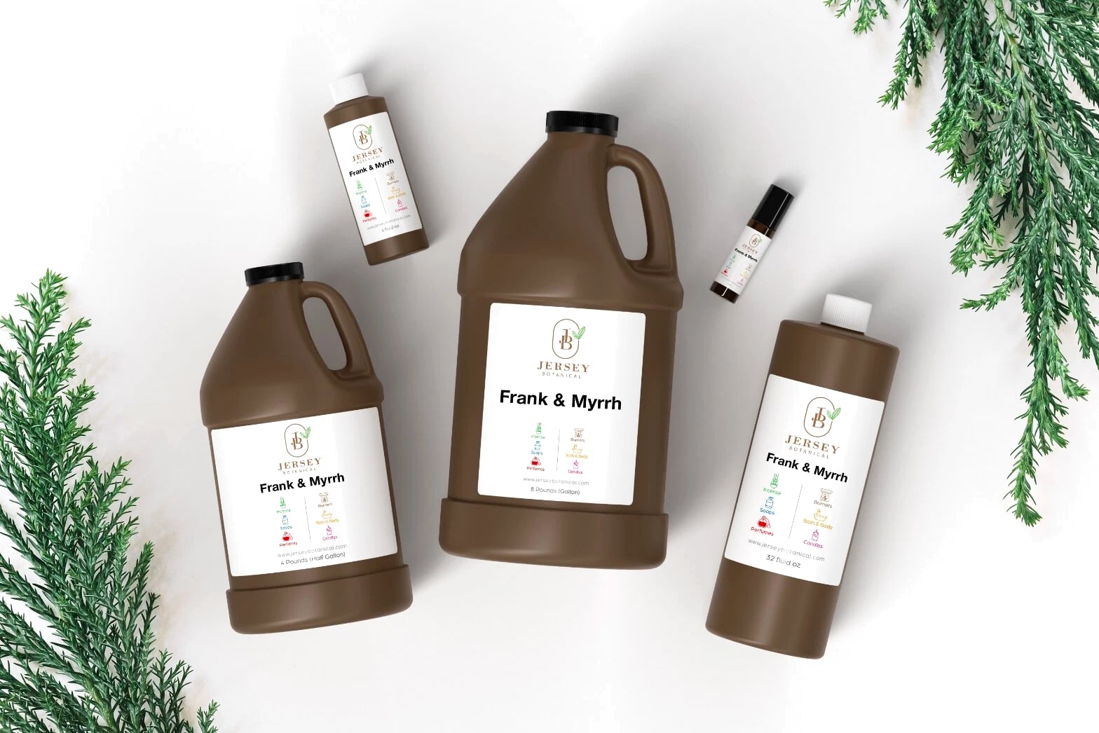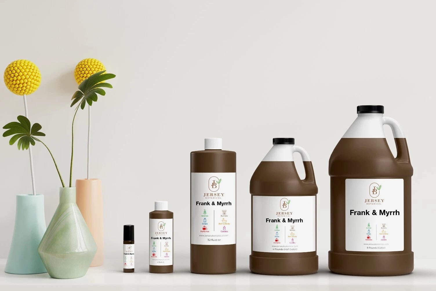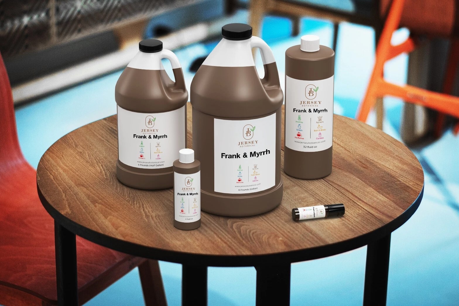 Products Like Our Page Check Our Feedback Contact Us Fair Price TESTED BEFORE USE QUALITY GUARANTEED SATISFACTION GUARANTEED Frankincense & Myrrh Product Uses Great for Bath Bombs Perfect for Candles & Soaps Known to Last Long with Diffusers Amazing for Moisturizing the Body Ultimate Aroma for Perfumery Favorite Product Details Frankincense and Myrrh fragrance oil tends to have a complex and captivating aroma with elements of warmth, richness, and a touch of mystery. Frankincense and myrrh fragrance oil already has a rich and distinctive scent. However, if you're looking to enhance or complement its aroma, consider the following scents to mix with it: What scents are good to mix with Frank & Myrrh fragrance oil? Citrus scents: Add a touch of brightness and freshness by incorporating citrus notes such as orange, lemon, or bergamot. These can provide a vibrant and uplifting element to the fragrance blend. Spice scents: Enhance the warm and aromatic qualities of the fragrance oil by including spices like cinnamon, clove, or cardamom. These spices can contribute a cozy and comforting element. Floral scents: For a softer and more delicate touch, consider incorporating floral notes like rose, jasmine, or lavender. These scents can provide a subtle balance and floral complexity to the blend. Lasting fragrance hours later for: Candles Soaps Perfumes What else can this be used for? Fragrance oils are enchanting essences that add captivating scents to a wide range of products. From perfumes and candles to soaps and home fragrances, they infuse personal care items and living spaces with delightful aromas, creating a sensory experience that uplifts and delights. Explore a world of endless possibilities as fragrance oils become the key ingredient in crafting unique, personalized scents that leave a lasting impression. Pros Phthalate, Alcohol, Cruelty, and Dilution Free Why Jersey Botanical? We're your destination for premium grade fragrance oils that won't break your bank