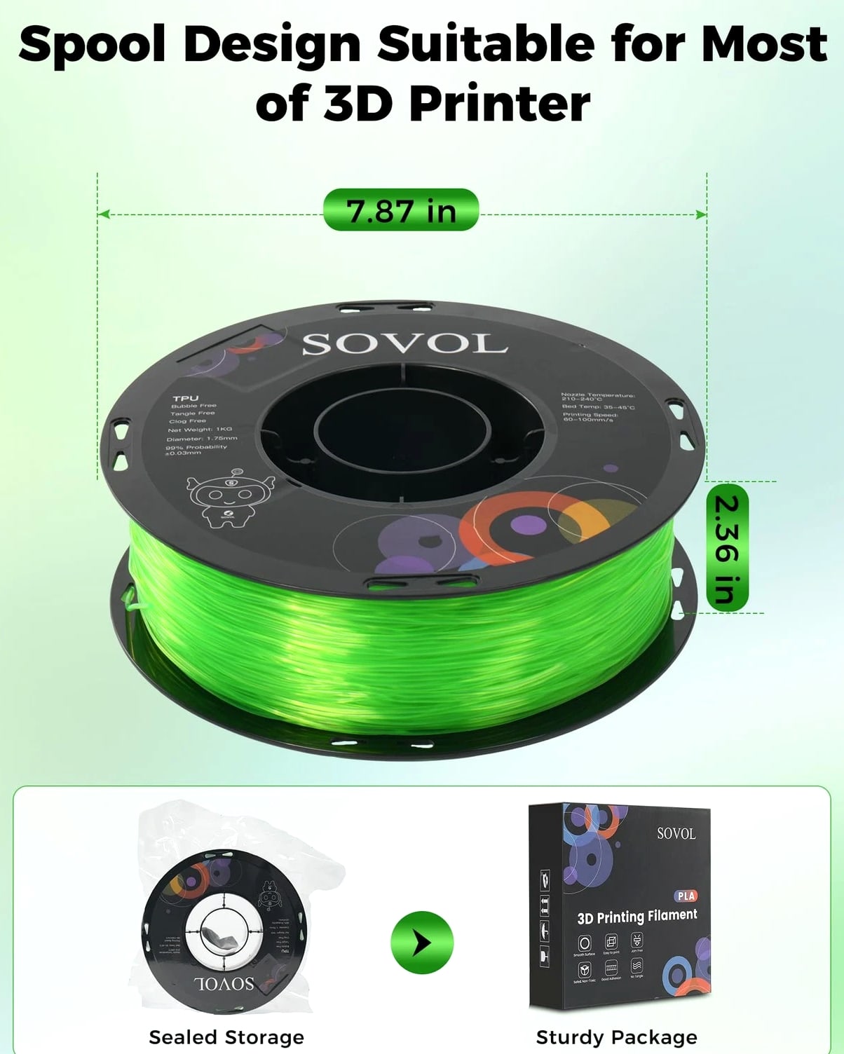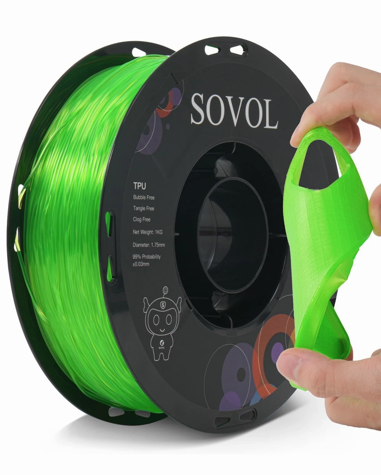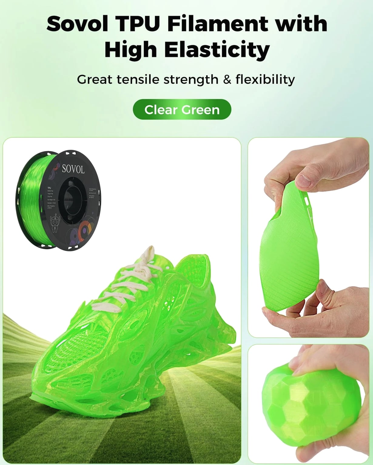 Sovol TPU Filament 1.75mm, 95A Soft Flexible 3D Printer 1 KG, Clear Green Features: Soft & High Elasticity: Sovol TPU is highly flexible and durable. Featuring Shore hardness of 95A, Sovol TPU filament allows you to print soft yet strong prints, such as shoe insoles, watch bands, phone cases, drone parts and so on High Quality TPU Material: Sovol tpu filament is easy to print, minimal tolerance and warping, easy handling, minimal deformation, no odor, no clogging, no bubbles Excellent Layer Adhesion: Setting the standard for impeccable layer adhesion and delivering impressive results. Sovol TPU features optimal layer bonding and a flawlessly smooth finish for FDM 3D Printers using 1.75mm diameter filament Vacuum Packaging: Completely dried for 24 hours before packaging and vacuum sealed, ensuring smoother and more stable printing. Please store it into a re-sealable bag after use to keep excellent printing performance Easy to Print: Full mechanical winding and strict manual examination to ensure tidy lines and avoid possible snap and line breaking; Larger spool inner diameter design makes feeding smoother. The diameter tolerance of this 1.75 TPU filament is +/- 0.03mm. More stable diameter tolerance of 3D printer filament brings you smoother printing experience. Universal compatibility with most FDM 3D printers and 3D Pens. Recommended extrusion nozzle temperature: 220°C, hot bed temperature: 50°C - 70°C, printing speed: 60mm/s. Handling: Orders ship within 1 business day of payment. Return Policy: All items qualify for returns within 30 days of receipt. Buyer is responsible for return shipping on any item that is not damaged.
