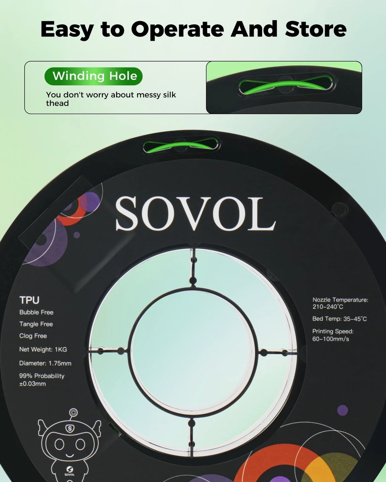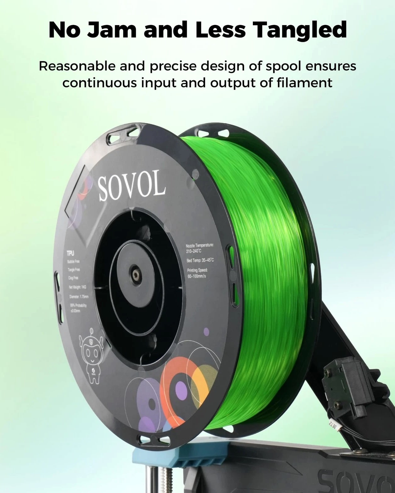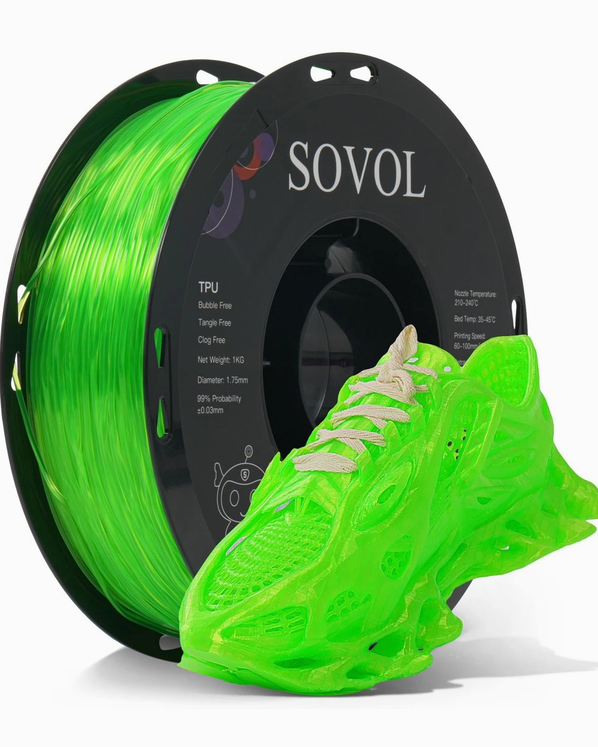 Sovol TPU Filament 1.75mm, 95A Soft Flexible 3D Printer 1 KG, Clear Green Features: Soft & High Elasticity: Sovol TPU is highly flexible and durable. Featuring Shore hardness of 95A, Sovol TPU filament allows you to print soft yet strong prints, such as shoe insoles, watch bands, phone cases, drone parts and so on High Quality TPU Material: Sovol tpu filament is easy to print, minimal tolerance and warping, easy handling, minimal deformation, no odor, no clogging, no bubbles Excellent Layer Adhesion: Setting the standard for impeccable layer adhesion and delivering impressive results. Sovol TPU features optimal layer bonding and a flawlessly smooth finish for FDM 3D Printers using 1.75mm diameter filament Vacuum Packaging: Completely dried for 24 hours before packaging and vacuum sealed, ensuring smoother and more stable printing. Please store it into a re-sealable bag after use to keep excellent printing performance Easy to Print: Full mechanical winding and strict manual examination to ensure tidy lines and avoid possible snap and line breaking; Larger spool inner diameter design makes feeding smoother. The diameter tolerance of this 1.75 TPU filament is +/- 0.03mm. More stable diameter tolerance of 3D printer filament brings you smoother printing experience. Universal compatibility with most FDM 3D printers and 3D Pens. Recommended extrusion nozzle temperature: 220°C, hot bed temperature: 50°C - 70°C, printing speed: 60mm/s. Handling: Orders ship within 1 business day of payment. Return Policy: All items qualify for returns within 30 days of receipt. Buyer is responsible for return shipping on any item that is not damaged.