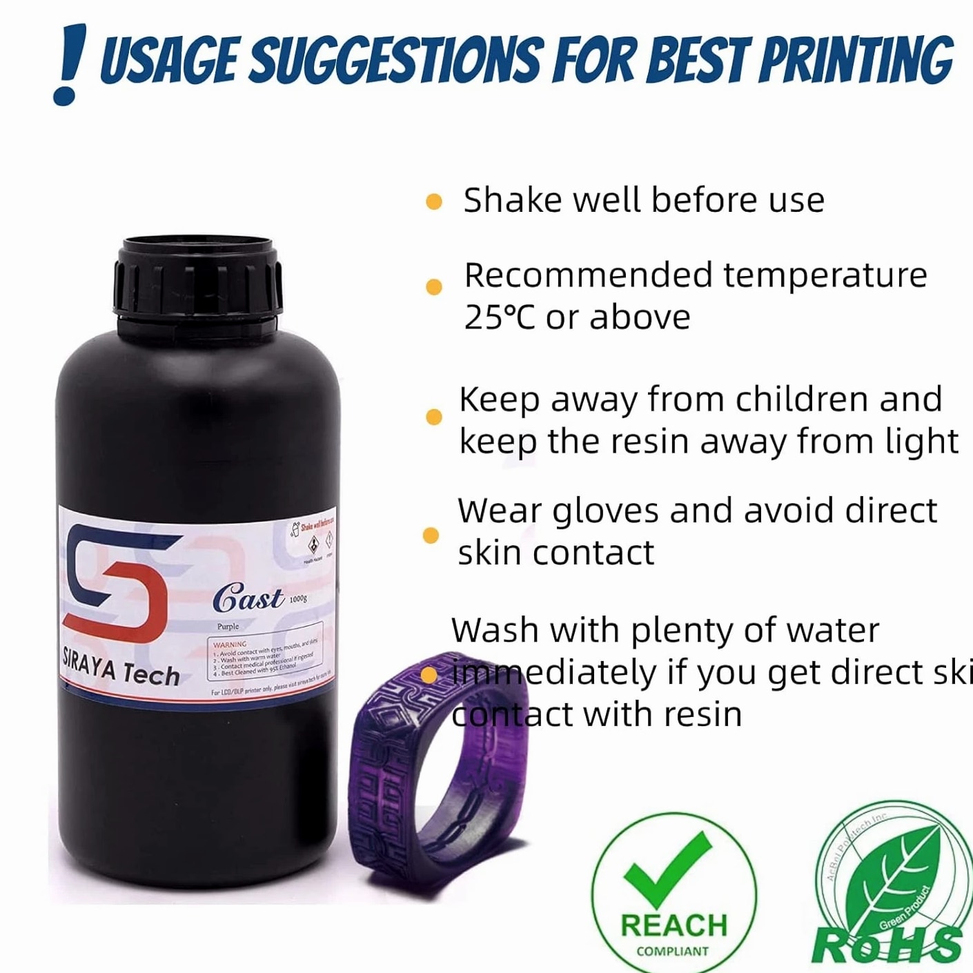 Simple to Use - Our Siraya Tech Cast 3D Printer resin is straightforward to use, it does not require a very dry environment or special additive to print and burn well, and this castable 405nm standard photopolymer resin has good plate adhesion. Both new and experienced users can easily print the model. Easier to Burn - This castable 3D printer resin material contains some wax, so it is easier to burn than many non-wax based casting resins. This Siraya Tech Cast rapid resin is very suitable to be used in the production of small metal parts, which can fully demonstrate the core of the part. High Resolution - Siraya Tech Cast 3D printer resin uses a unique and beautiful purple color, and the printed model has high resolution and smooth surface. Its high resolution allows the model to be printed with precise details, which will make your model look great. Easy to Print - This Siraya Tech Cast 3D printing resin can print quickly and has high resolution, is easy to print. This Cast LCD UV-Curing resin is very easy to use and dye, and is a castable resin for jewelers and small metal parts. Wide Applications - Cast by Siraya Tech was developed as an affordable castable 3D printer resin by jewelers for making rings and pendants, by engineers for small metal functional parts and by dentists. This Siraya Tech Cast 3D printing resin can be used in most LCD and has been used in DLP 3D printers. Cast by Siraya Tech was developed as an affordable castable resin for jewelers and those who want to cast small metal parts. It is easy to work with as it does not require a very dry environment or special additive to print and burn well.
