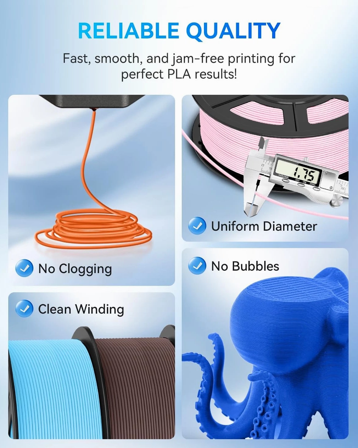 PLA Filament Improved toughness and impact resistance: our PLA filament offers superior toughness and impact resistance, allowing for the creation of durable and long-lasting 3D printed models Easy removal with clean breaks: designed for hassle-free use, this 3D printer filament allows for easy removal from the print bed, reducing the risk of model damage High-speed printing support: designed for 3D printers, this 1.75mm PLA filament supports rapid printing speeds up to 50-600mm/sec, ensuring efficient and smooth printing experiences Extra 100g filament: with a net weight of 1100g, our PLA filament offers 100g more than standard 1kg spools, providing additional material for your creative projects Bubble-Free and Clog-Free Printing: manufactured with precision, our PLA filament ensures a bubble-free and clog-free printing process, resulting in consistent prints Tangle-Free and Neatly Wound: Each spool of PLA filament 1.75mm is neatly wound to prevent tangling, ensuring a smooth feeding experience during printing sessions Delivery details 1. Goods will be delivered within 2-3 working days after payment is received 2. We ship items according to your address 3. Be sure that your address is correct when you purchase items 4. We do not take responsibility for item loss due to wrong address 5. We are not responsible for any customs duty incurred at foreign customs. If you want to ship in another way, please contact us. Returns 1. Buyers must contact us within 30 days upon receiving the item(s); buyers should be responsible for the shipping cost for returning items and the shipping cost for re-sending replacement items. 2. Please keep our products in original condition (packaging) if you return the item(s). If your item arrives faulty, we will exchange it for a replacement. 3. If you prefer a refund, we will fully refund to you through PayPal when we receive the item.