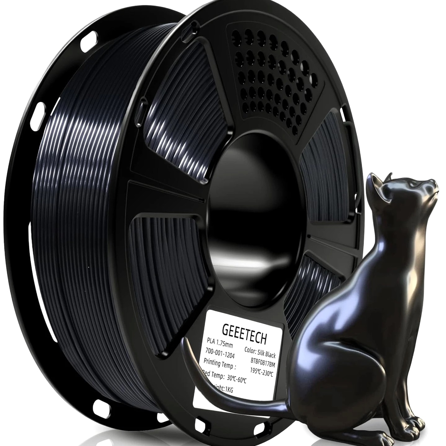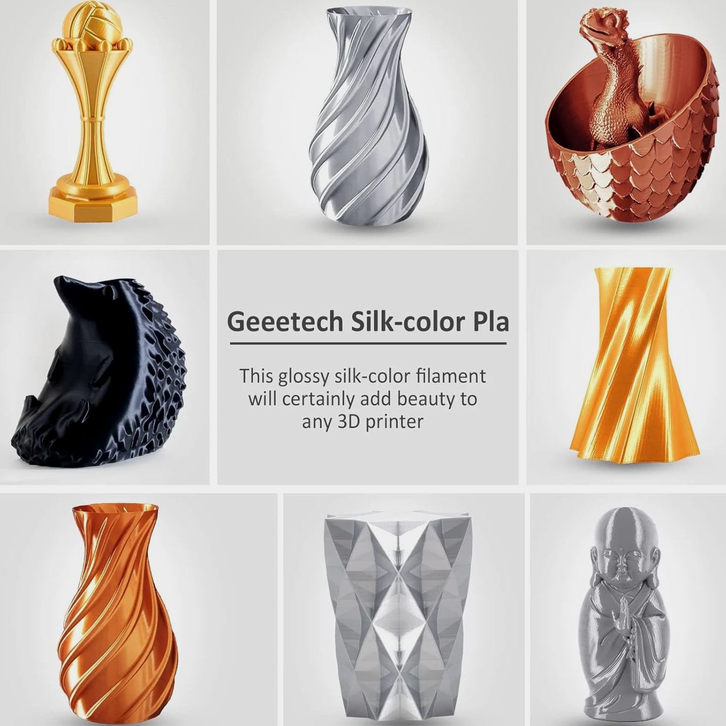 【Silky Shiny Color】The special color of PLA Silk Filament brings arts & crafts and 3D Projects smooth shiny silver surface which definitely gives eye-catching, glossy prints. It's very suitable to print decoration or gift for all kinds of festival and cosplay 【High Quality】This filament is anti-warping, high accuracy, no bubble, no jamming and no stringing. Recommended printing temp 180-210°C (356-410°F), hot bed temp 50-70°C (122-158℉), printing speed 40-60mm/s 【High Compatibility】This filament is universally designed and compatible with 3D Printers using 1.75mm diameter filament, with a dimensional accuracy of +/- 0.02mm 【Vacuum sealed packaging】 This filament is packed in a sealed vacuum bag with a desiccant bag to keep it dry and maintain its high performance for long time 【Satisfaction Warranty】GEEETECH provides Satisfaction Guarantee and Premium Customer Services within 24 hours guaranteed reply. If you are not satisfied with this filament, please kindly contact us at any time