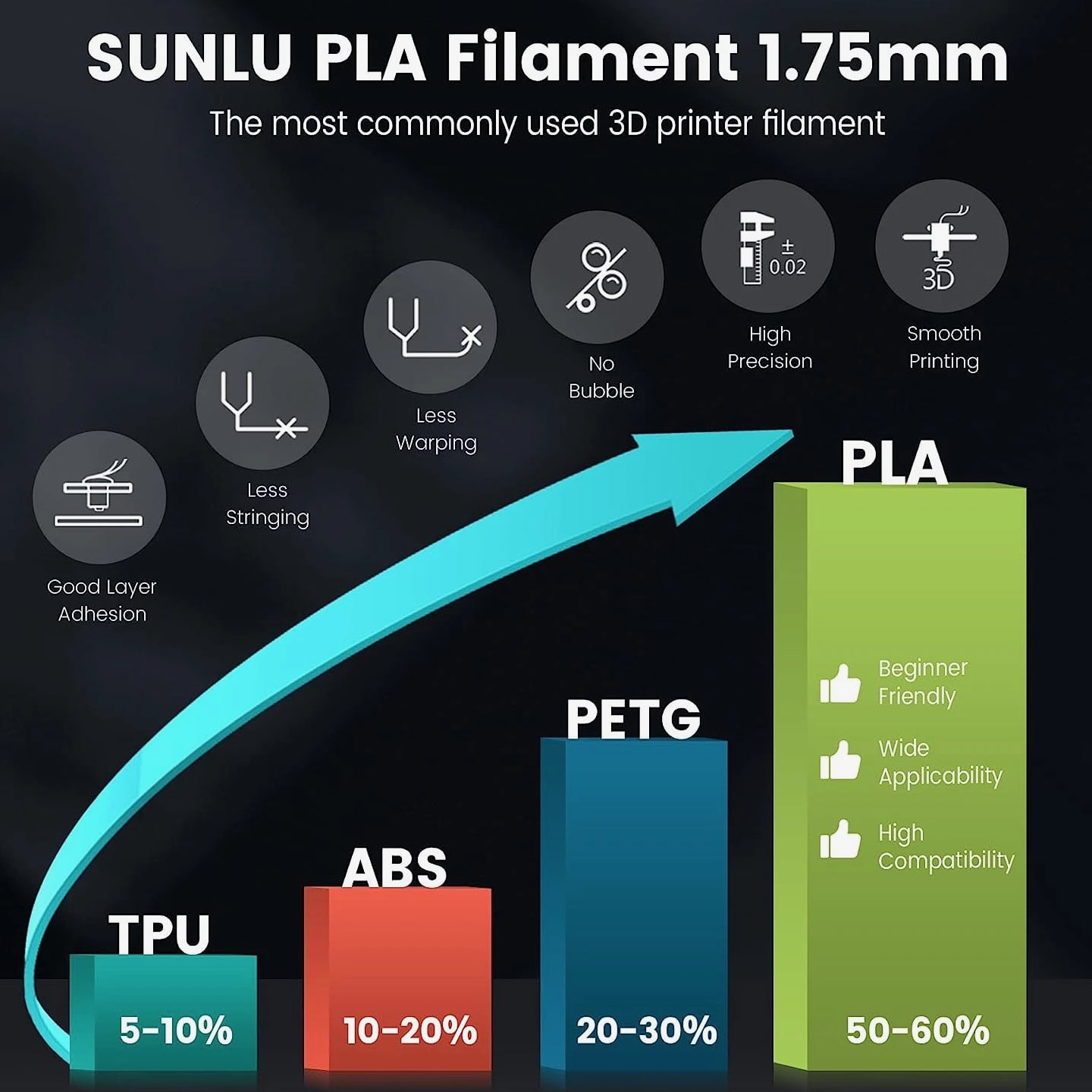 ①【SUNLU PLA 3D Printer Filament】PLA material is the perfect choice for 3D printing enthusiasts! SUNLU PLA filament is reliable, versatile, and easy to use. No clogs, bubbles, or tangles, its excellent layer adhesion ensures high-quality prints every time. Ideal for beginners and experienced users. ②【Neatly Wound 3D Filament Spool】SUNLU's self-developed neat winding device ensures that the filament is easy to use, with a 100% neat rate that reduces the risk of tangles and jams, and provides a smoother and more efficient 3D printing experience. ③【PLA Filament 1.75 mm】SUNLU 3D printer filament dimensional Accuracy +/- 0.02mm. SUNLU filament has wide compatibility due to the small diameter error, making it suitable for almost all 1.75mm FDM 3D printers. ④【Filament Spool Dimensions】Spool Diameter: 8.00", Spool Width: 2.50", Spool Hub Hole Diameter: 2.20". The size of the SUNLU filament spool is suitable for hanging on most FDM 3D printers. ⑤【PLA Recommend Settings】To achieve the best printing results with SUNLU PLA filament, we recommend printing at a nozzle temperature of 200-230°C, a bed temperature of 50-65°C, and a printing speed of 50-100mm/s. ⑥【SUNLU Main 3D Products】SUNLU offers a wide range of high-quality 3D printing products, including 3D printer filament, filament dryer, FDM 3D printer, 3D pen, 3D pen filament, 3D printer resin, LCD 3D printer, resin curing box, and other accessories, providing you with everything you need for a successful 3D printing experience. Product description SUNLU 3D Printer Filament The video showcases the product in use. The video guides you through product setup. The video compares multiple products. The video shows the product being unpacked. pla filament 1.75mm PLA Filament 1.75mm 1 Neatly Wound Spool 2 Good Layer Adhesion 3 High Precision Printing 4 Smooth Print Surface 5 Ultra-Pure Raw Materials 1 SUNLU PLA Filament 2 High Compatibility 3 3D Printing Settings 4 New Filament Spool 5 Vacuum Packaging Create Endless Po