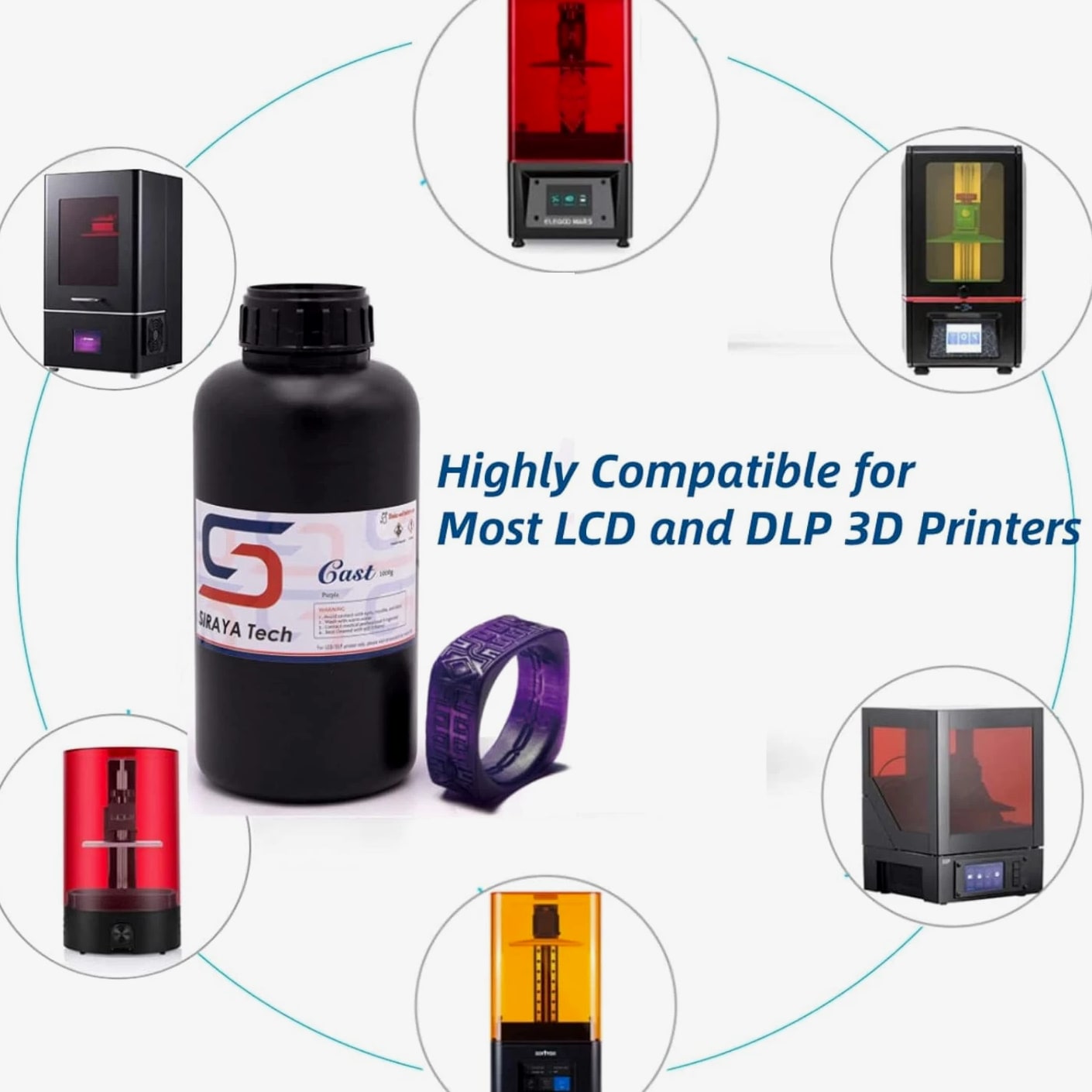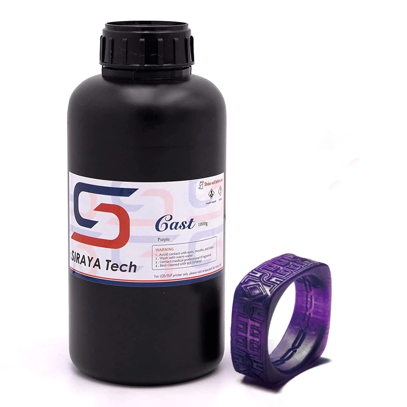Easy to Use - Our Siraya Tech Cast 3D Printer resin is easy to use, it does not require a very dry environment or special additive to print and burn well, and this castable 405nm standard photopolymer resin has good plate adhesion. Both new users and experienced users can easily print the model. Easier to Burn - This castable 3D printer resin material contains some wax, so it is easier to burn than many non-wax based casting resins. This Siraya Tech Cast rapid resin is very suitable to be used in the production of small metal parts, which can fully demonstrate the core of the part. High Resolution - Siraya Tech Cast 3D printer resin uses a unique and beautiful purple color, and the printed model has a high resolution and smooth surface. Its high resolution allows the model to be printed with precise details, which will make your model look great. Easy to Print - This Siraya Tech Cast 3D printing resin can print quickly and has high resolution, is easy to print. This Cast LCD UV-Curing resin is very easy to use and dye, and is a castable resin for jewelers and small metal parts. Wide Applications - Cast by Siraya Tech was developed as an affordable castable 3D printer resin by jewelers for making rings and pendants, by engineers for small metal functional parts and by dentists. This Siraya Tech Cast 3d printing resin can be used in most LCD and has been used in DLP 3D printers. Product description Castable 3D Printer Resin Siraya Tech Cast Purple Resin Cast by Siraya Tech was developed as an affordable castable resin for jewelers and those who want to cast small metal parts. It is easy to work with as it does not require a very dry environment or special additive to print and burn well. Purple Castable Resin Siraya Tech Cast purple resin is available in 1kg and 500g sizes. Introducing Cast, a high-resolution, easy to print castable resin by Siraya Tech. Our goal is making castable affordable so that professionals and beginners can enjoy it. Cast contains some wax, so it