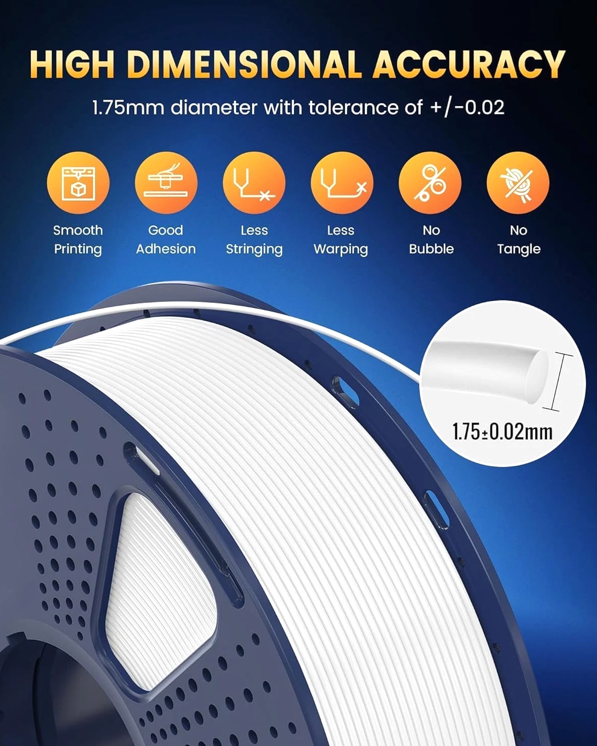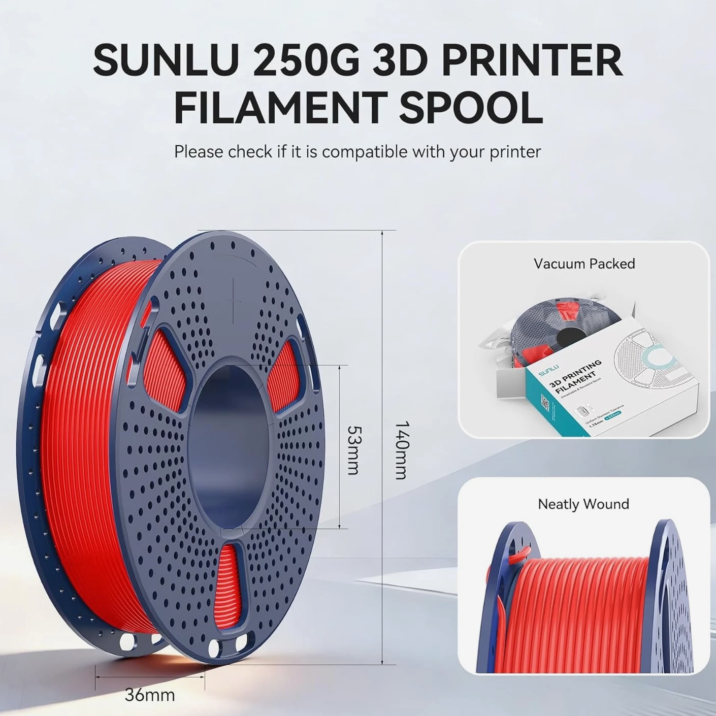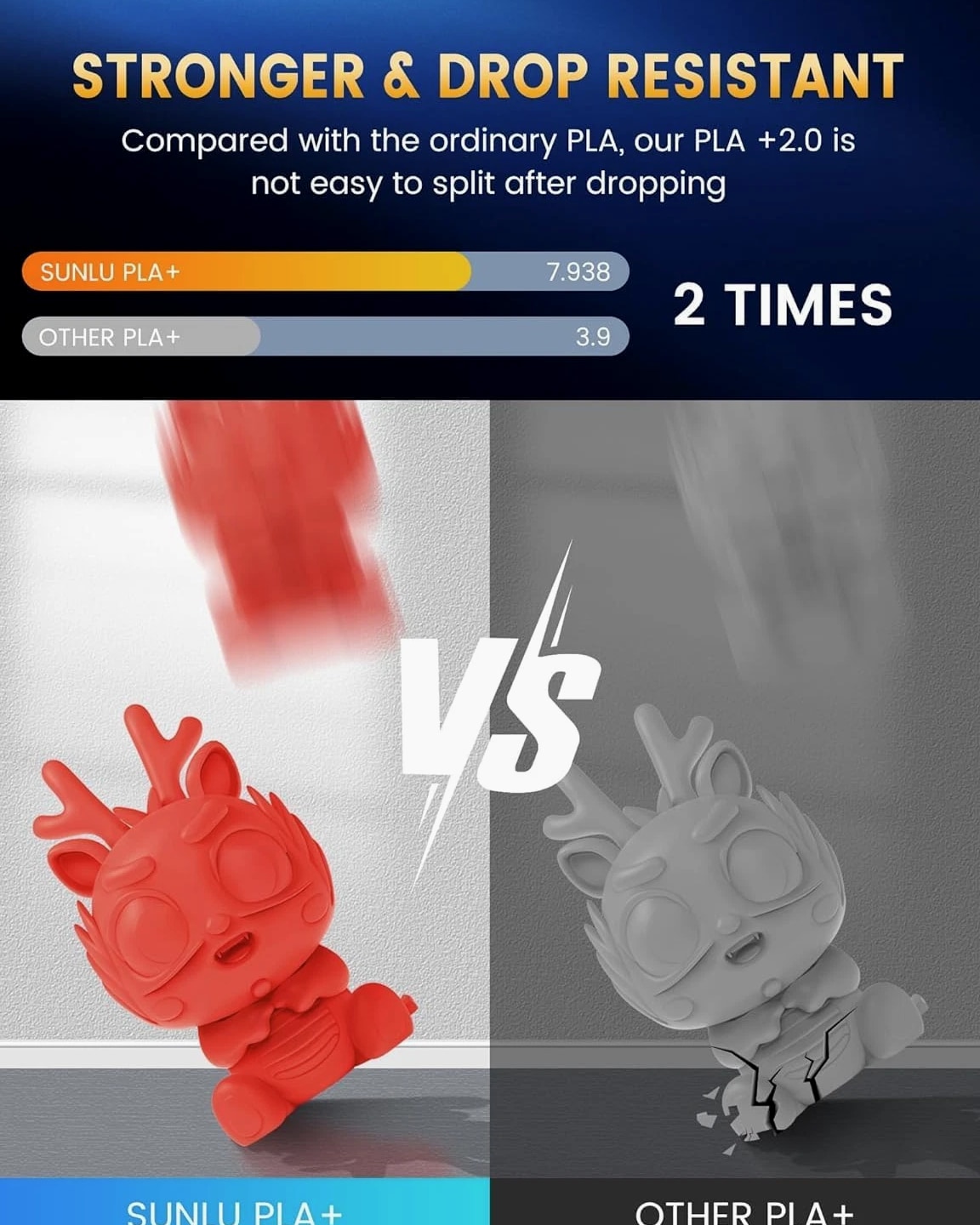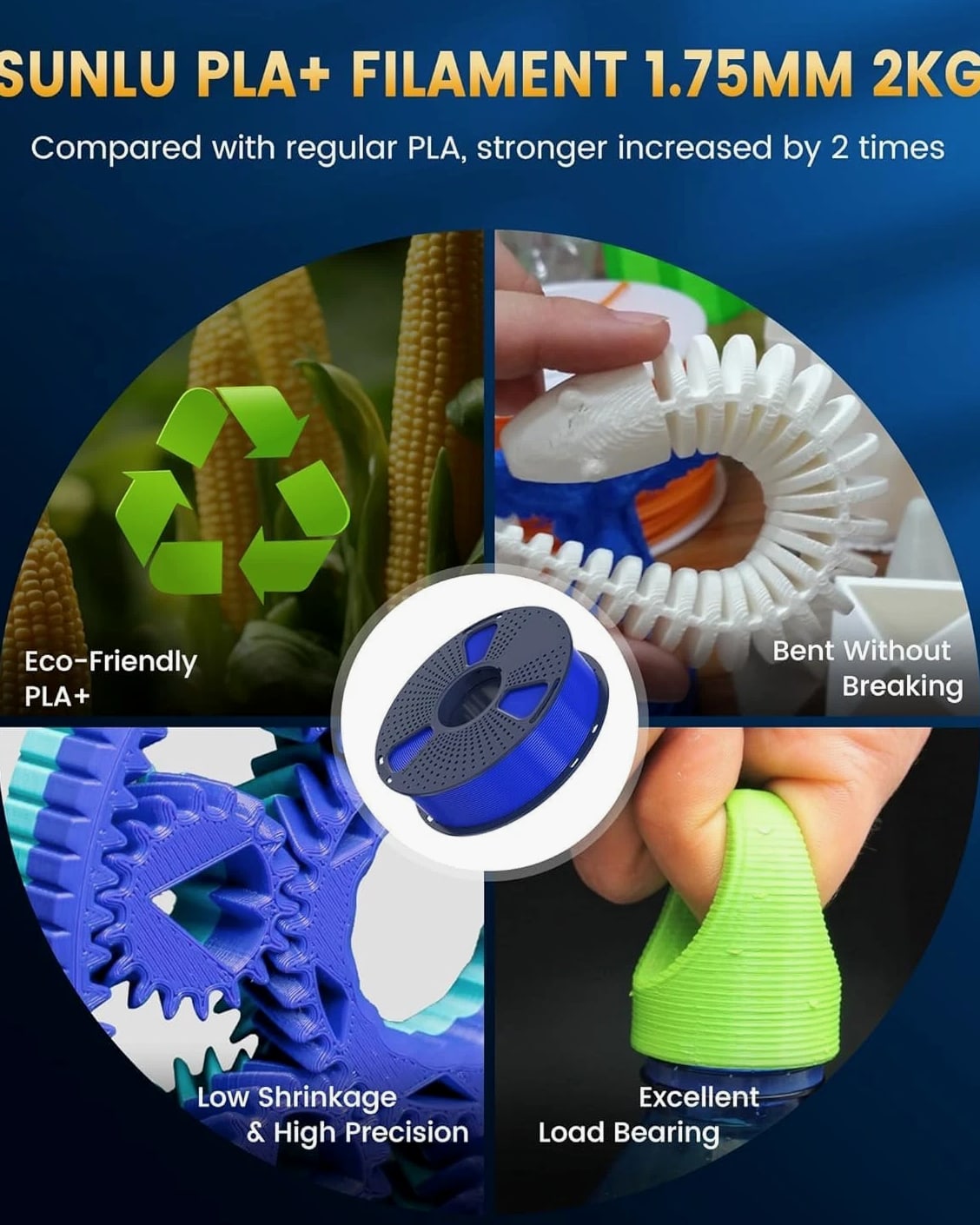 Upgraded PLA+ Filament: Compared to standard PLA+ filament, SUNLU PLA+ 2.0 is more resistant to brittleness and cracking, making your prints stronger and more durable Supports Fast Printing: The improved PLA+ filament melts quickly and flows smoothly, enabling printing speeds of up to 300mm/s. This allows you to complete projects faster without compromising on quality Easy to Use: SUNLU PLA+ 2.0 filament is reliable and user-friendly, making the printing process smooth and effortless for both beginners and experts 1.75mm PLA+ 2.0 Filament: SUNLU 3D printer filament offers a dimensional accuracy of +/- 0.02mm, making it compatible with nearly all 1.75mm FDM 3D printers Neatly Wound Filament: SUNLU introduces the first PLA filament with a neatly wound design. The consistent winding ensures there will be no tangling or clogging during the printing process Wide Application: PLA plus 2.0 3D filament has a broad range of applications, suitable for printing high-precision models, functional parts, and decorative items Recommended Settings: For optimal results with SUNLU PLA+ 2.0 filament, we recommend a nozzle temperature of 205-220°C, a bed temperature of 50-60°C, and a print speed of 100-300mm/s Vacuum Packaging: SUNLU 3D printer filaments are sealed in airtight vacuum packaging to ensure they stay moisture-free Filament Spool Dimensions: 0.25KG Spool Diameter: 140mm, Spool Width: 36mm, Spool Hub Hole Diameter: 53mm. SUNLU reusable spools reduce waste SUNLU's Main 3D Products: SUNLU offers a variety of high-quality 3D printing products, including 3D printer filament, filament dryer, 3D printer resin, resin curing box, and other accessories Specification: Dimensional Accuracy: 1.75mm+/-0.02 Nozzle Print Temperature: 205-215℃ Build Plate Temperature: 50-60℃ Print Speed: 50-300MM/s Why choose SUNLU PLA+2.0 Filament? - Made from corn starch raw material, pla plus filament is environmentally friendly - High Strength, no brittleness - Multicolor Pla Plus 3d printer filament - High Toughness