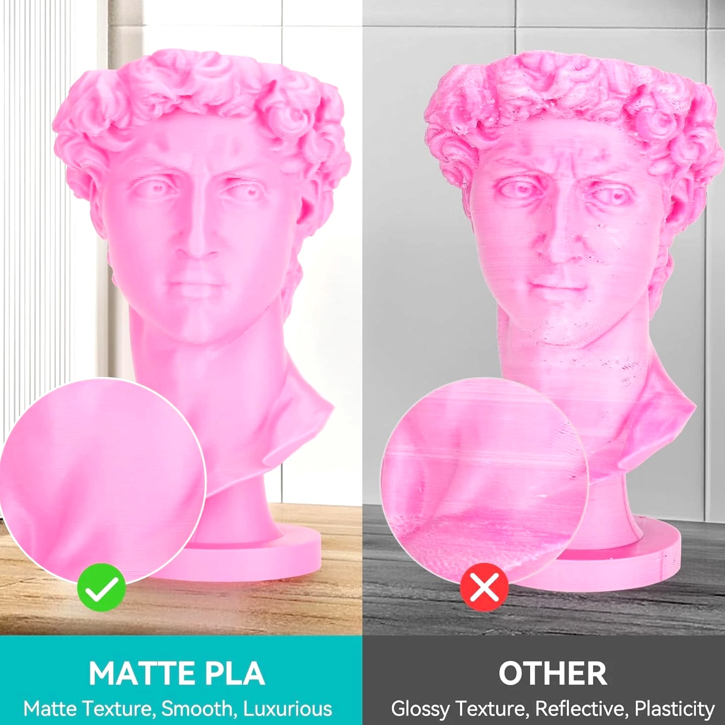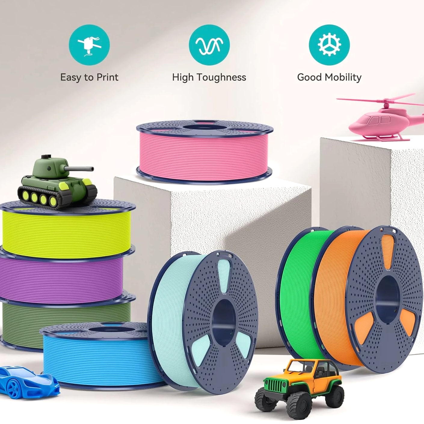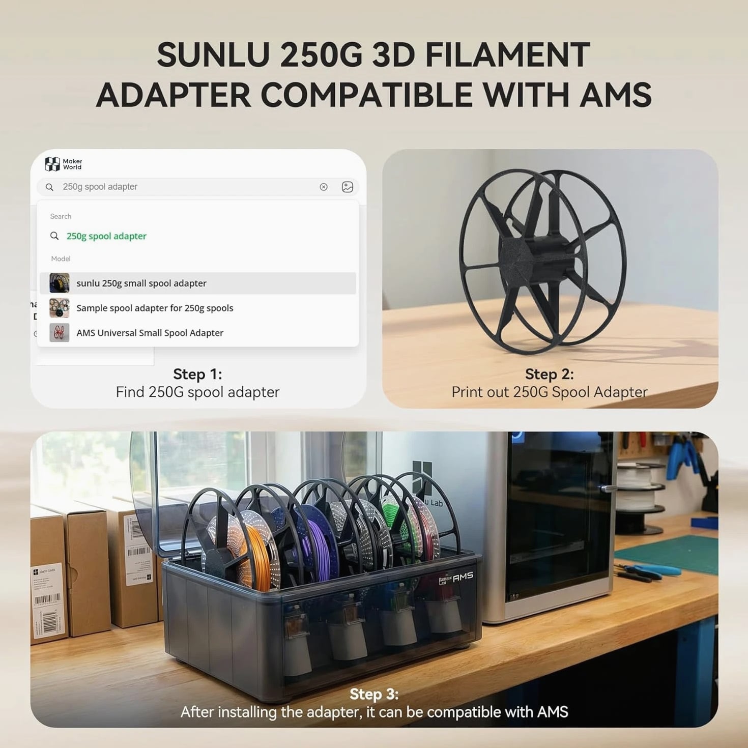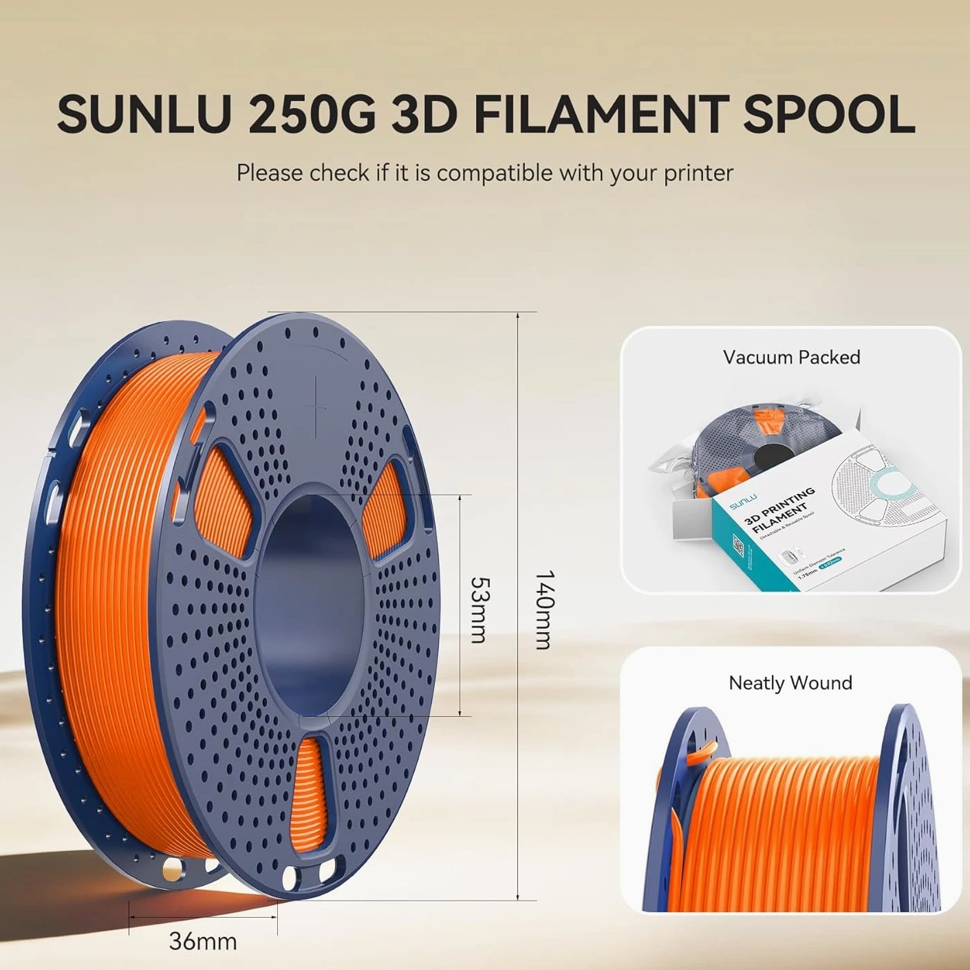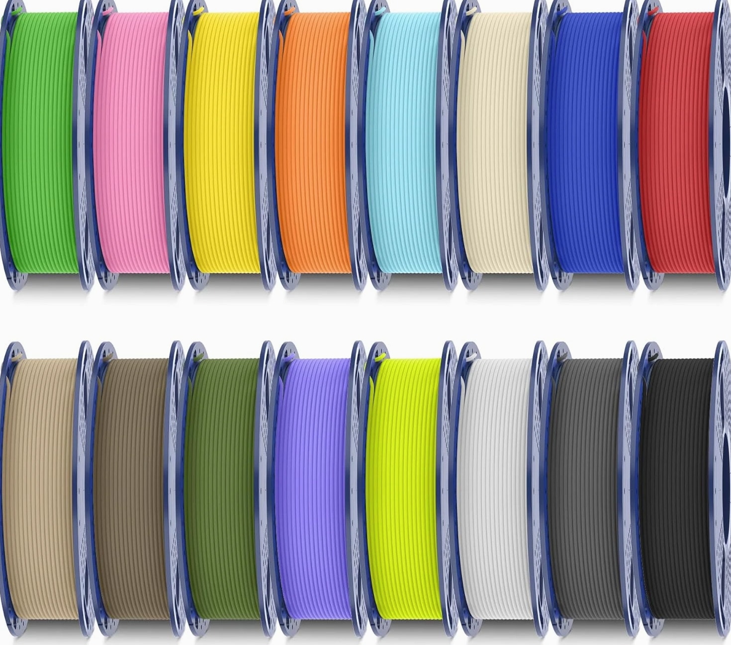 【16 Rolls of 250g PLA Filament】- Matte Finish. Colors: Black, Roasted Chestnut Black, White, Bone White, Grey, Blue, Light Blue, Red, Yellow, Olive Green, Green, Pink, Sunny Orange, Clay, Oak wood, Lavender Purple. 【Small Spool Diameter】- Spool Diameter: 140mm (5.5 inches), Spool Hub Hole Diameter: 53mm (2.08 inches), Spool Width: 36mm (1.4 inches). Please pay attention to the filament spool size! Verify compatibility with your 3D printer. Not compatible with AMS lite. 【Smooth Matte Finish】- SUNLU MATTE PLA produces a beautiful matte, low gloss, and smooth finish, achieving a frosted texture that conceals layer lines. 【Unlimited Creativity with 16 Vibrant Colors】- Specifically designed for makers who crave color variety. These 16 rich colors are perfectly compatible with multi-color printing systems (like AMS/MMU), bringing your creative models to life without the monotony of a single hue. 【Ideal for Small Projects & Zero Waste】- The 250g spool is the perfect size for printing mini designer toys, delicate jewelry, or intricate figurines. It addresses the common issues of 1kg spools being underused, prone to moisture, or consuming too much storage space. 【Perfect for 3D Pens & Educational Use】- Lightweight and colorful, this set is an ideal companion for 3D pen artists and education. It stimulates artistic potential and adds a vibrant touch to educational projects and home DIY crafts. 【Recommend Settings】- We recommend printing nozzle temperature of 200-230°C, bed temperature of 50-65°C, and printing speed of 50-100mm/s. 【Low-Cost "Physical Color Palette"】- A game-changer for beginners and design studios. Conduct diverse visual tests without investing in bulk filaments. It acts as a physical swatch kit to help you discover your "signature color" while minimizing sampling costs and inventory risks.