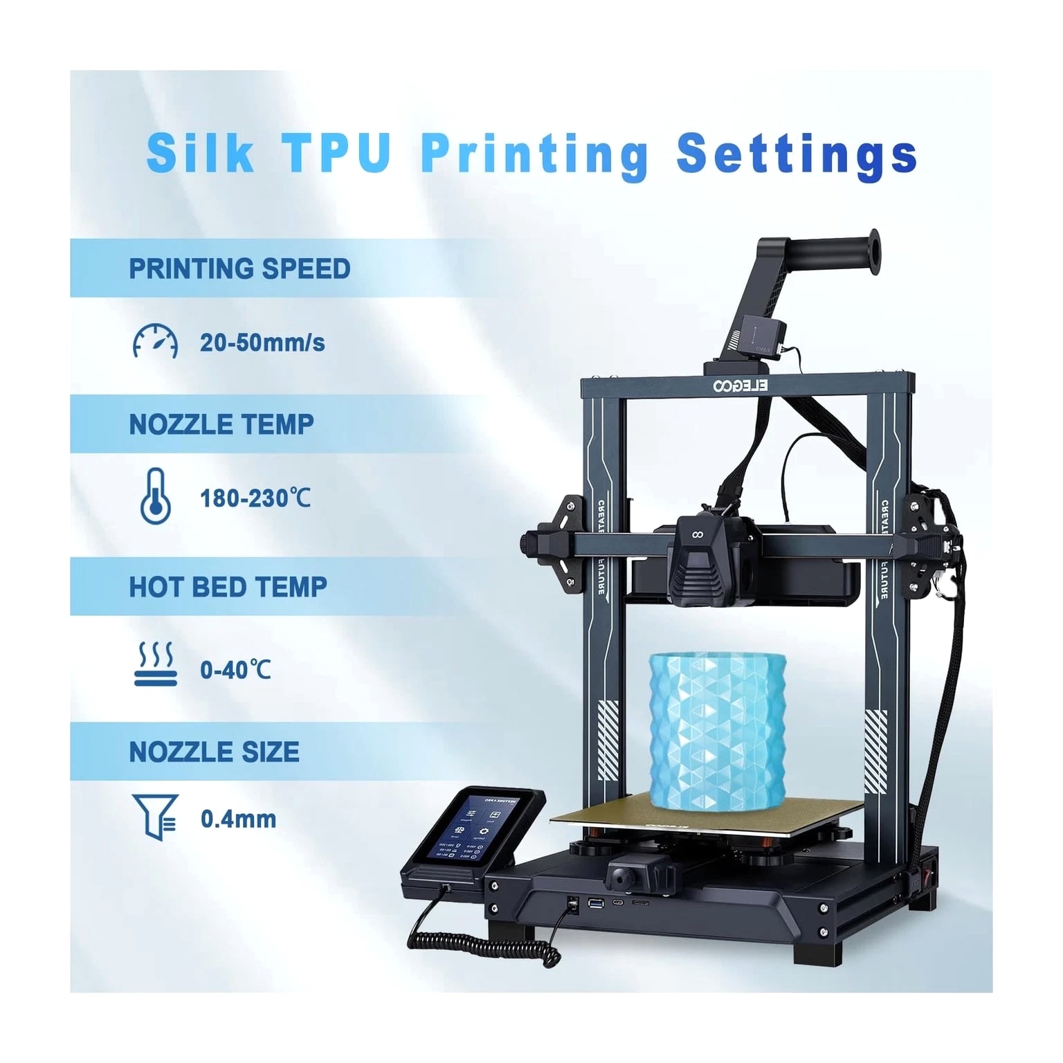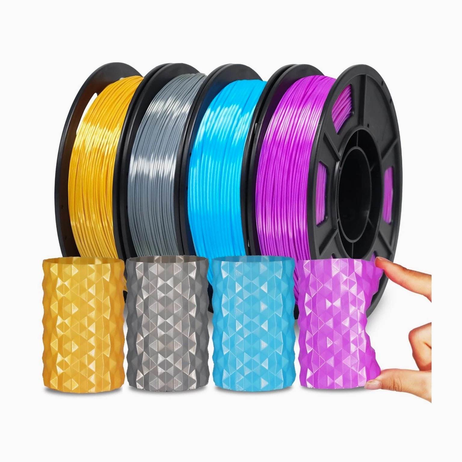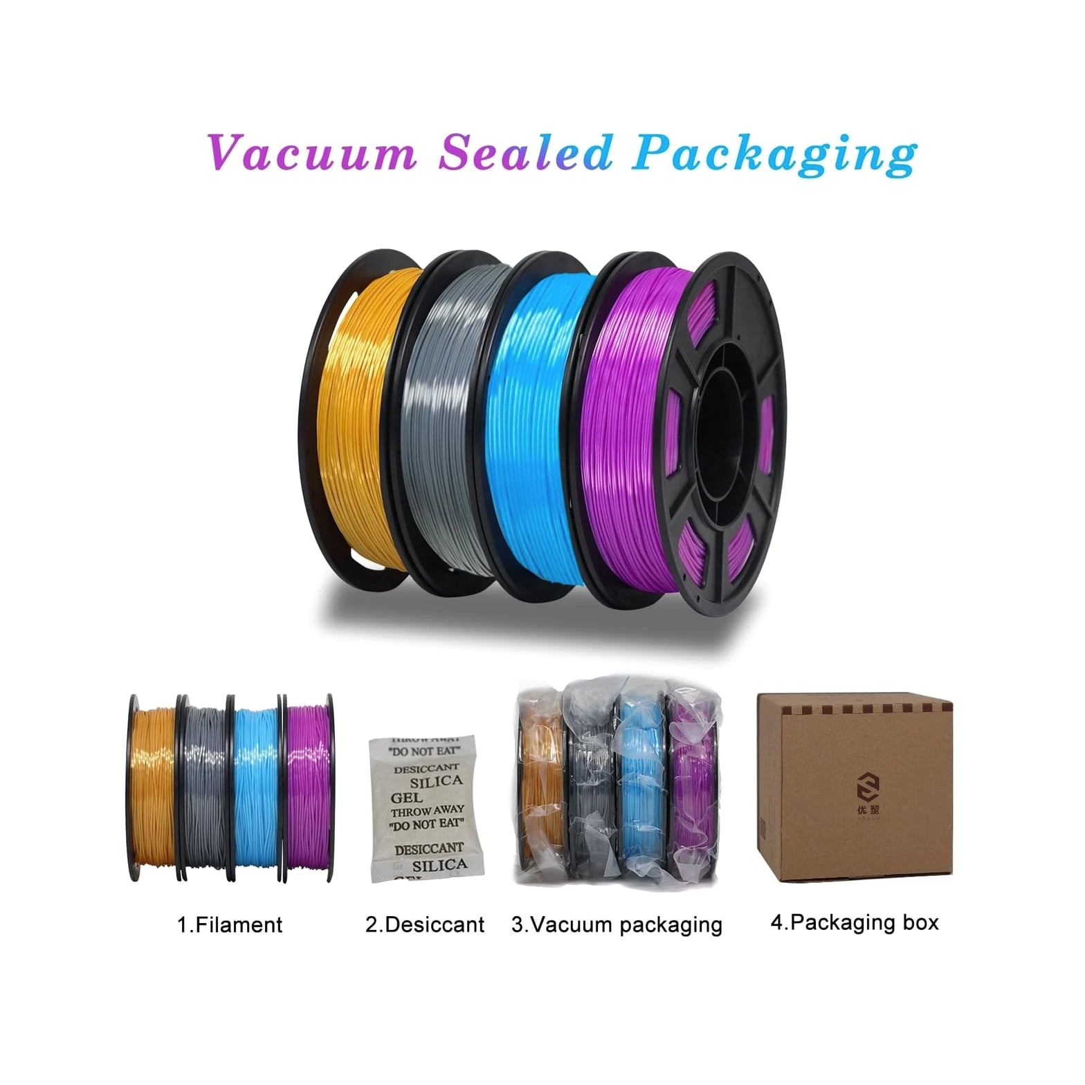 YOUSU Silk TPU Filament 1.75mm, 95A TPU 3D Printer Flexible Filament, High Hardness Resilience, Soft Adhesive Material, Elastic, 4x250g Bundle, Gold, Dark Silver, Blue, Purple Description Features: Shiny Silk TPU Filament: YOUSU Silk TPU filament features a shiny and smooth surface, with a silk effect without polishing, making your 3D printing more attractive and unique. Silk TPU filament with Shore hardness of 95A achieves an ideal balance between softness and elasticity. Suitable for flexible applications, ideal for fashion items such as handbags, coin purses, etc. Easy to Print: YOUSU Silk TPU 95A filament is fully compatible with most 1.75mm FDM 3D printers and printing pens. Optimal layer adhesion and perfectly smooth surface to reduce warping. Yousu provides 3D printing related matters and manual technical support. Wide Range of Applications: YOUSU's flexible TPU Silk filament has excellent tensile, bending and wear resistance, which prevents fragile filaments from breaking during 3D printing. Ideal for flexible applications, mobile phone cases, soles, wearable devices, bicycle/motorcycle parts, shock absorbers, sporting goods, medical equipment, car dashboards, etc. Packaging & Support: YOUSU 3D printing silk TPU filaments are vacuum-sealed and desiccant is added to protect the filaments from moisture. YOUSU provides 3D printing related matters and manual technical support. Product Details: Brand: Yousu Material: Thermoplastic Polyurethane Color: D1-silk TPU Bundle Item Weight: 1 Kilograms Item Diameter: 1.75 Millimeters Manufacturer Part Number: 1 Unit Count: 35.27 Ounce Manufacturer: YOUSU Number of Items: 1 Material Type: Thermoplastic Polyurethane Color: D1-silk TPU Bundle Item Weight: 1 Kilograms Item Diameter: 1.75 Millimeters Return Policy All items qualify for returns within 30 days of receipt. Seller is responsible for return shipping on any item that