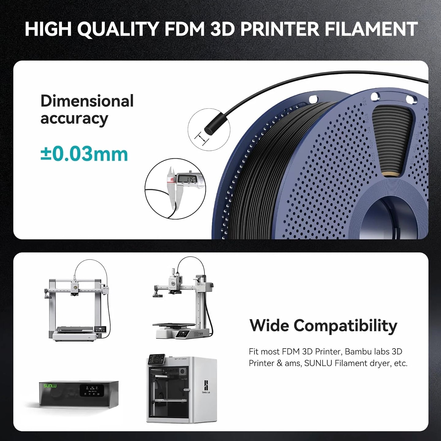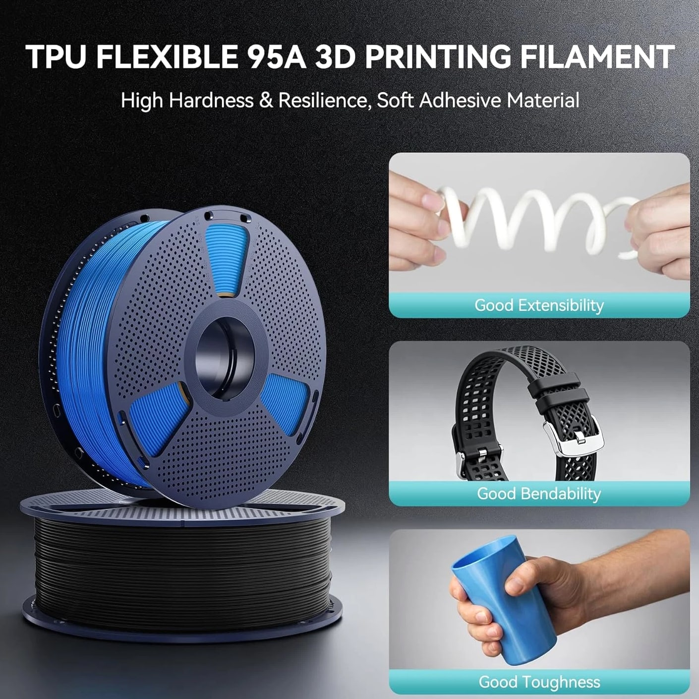 【TPU 3D Printing Filament】- TPU filament is made of flexible thermoplastic polyurethane, featuring Shore hardness of 95A, and items printed with it can easily withstand severe collisions during sports and general wear and tear. 【Excellent Printed Results】- SUNLU TPU filament 1.75mm has excellent layer adhesion, very easy to print. TPU filament is wear-resistant, oil-resistant, good elasticity, anti-aging, colorfast, bubble-free. 【TPU Recommend Settings】- We recommend printing at a nozzle temperature of 210-230°C, bed temperature of 50-60°C, printing speed of 80-120mm/s for faster, superior results. 【TPU 1.75mm Diameter】- Dimensional Accuracy +/- 0.03mm. SUNLU filament has wide compatibility due to the small diameter error, it's suitable for almost all 1.75mm FDM 3D printers. 【Unlock Your Creativity】- SUNLU TPU filament 1.75mm has wide applications including wear seals, plugs, gaskets, sheets, key ring cases, phone cases, and wearable devices/protective applications such as insoles, watch bands, protective covers, drone parts and more. Product Description SUNLU TPU 95A 3D FILAMENT 1.75MM The video showcases the product in use. The video guides you through product setup. The video compares multiple products. The video shows the product being unpacked. TPU Filament, 3D Printer Filament Flexible Merchant Video SUNLU 95A Shore Hardness TPU 3D Printer Filament Discover SUNLU TPU——Durable High-Performance Engineered with Tough TPU 95A Material Fashion Discover stylish bags made with flexible TPU and sleek black TPU for durability that travels with you. Entertainment Fun pet toys use tough TPU 95A material, like SUNLU TPU, for safe, interactive play that lasts. Outdoor Reliable outdoor gear uses high-grade 3D printer filament TPU for ergonomic, weather-ready performance. Sports Boost performance with gear from precision TPU filament 1.75mm like black TPU filament for flexible support.