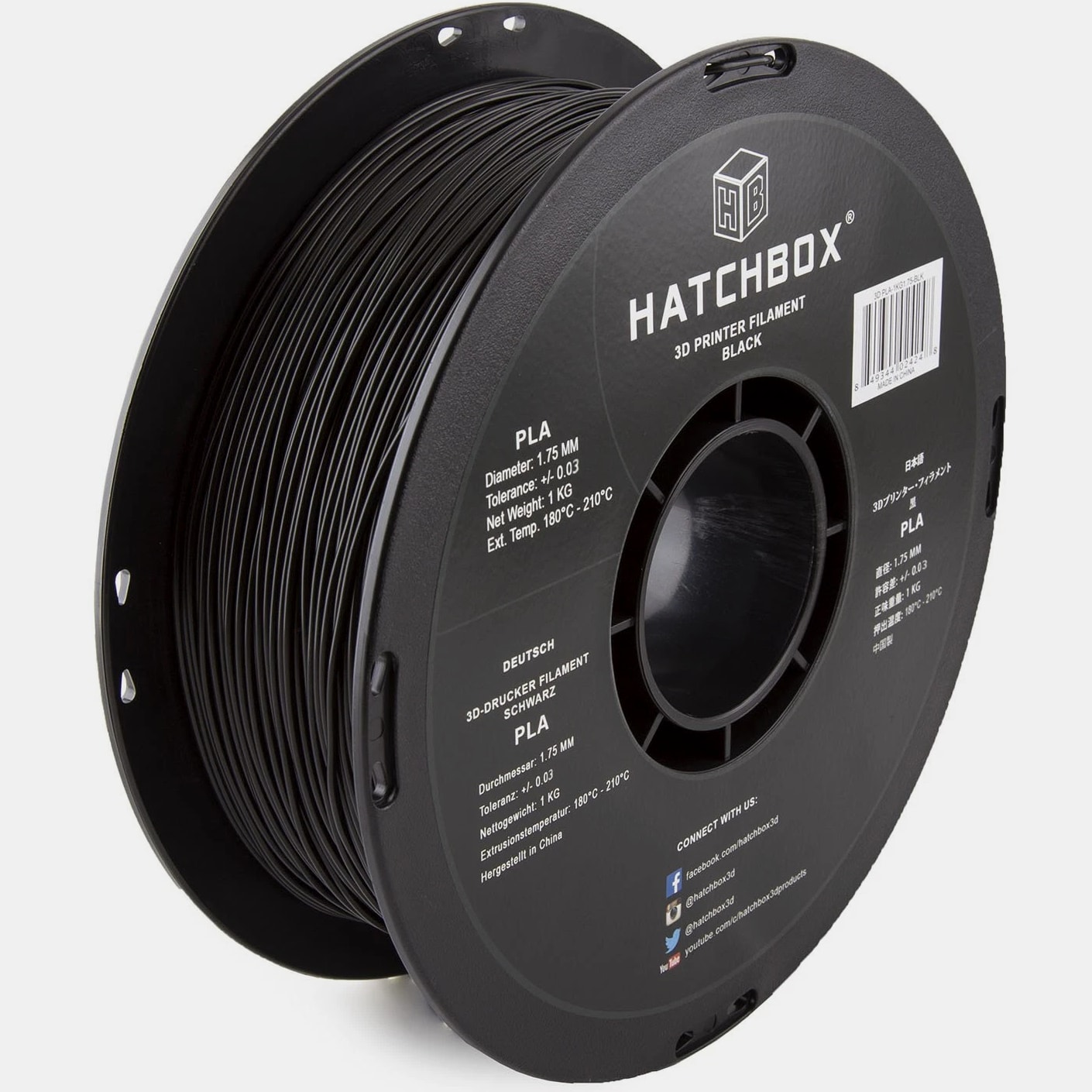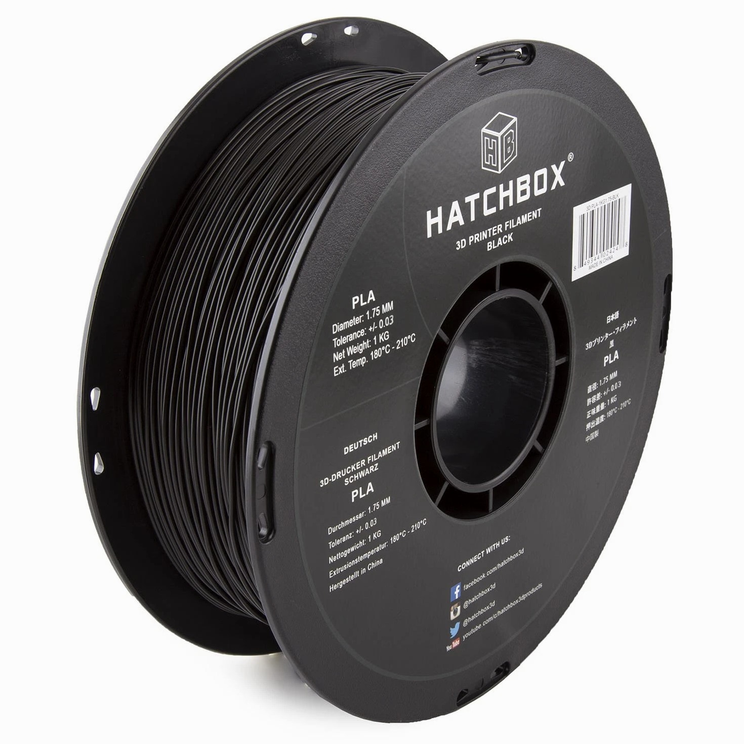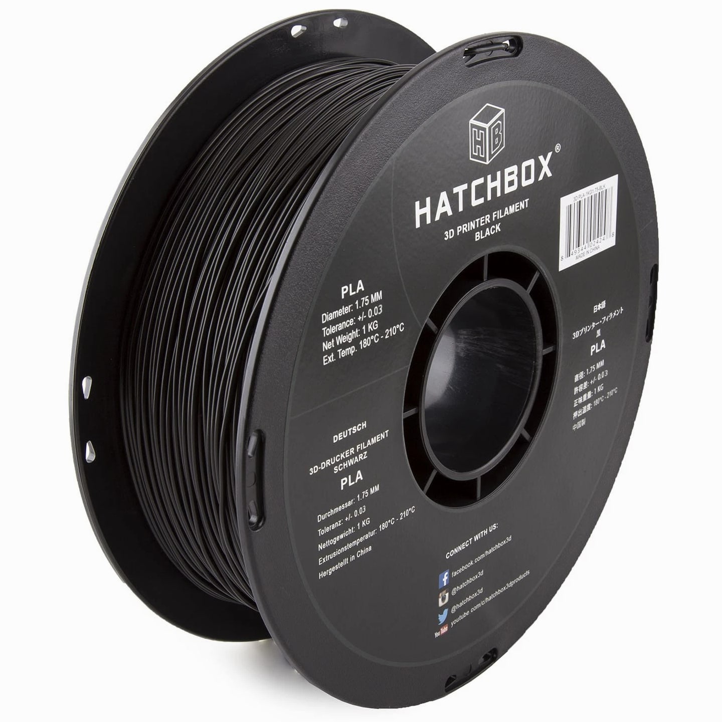 FILAMENT SPECS: SIZE: 1 kg (approximately 2.20 lbs) Spool, 1.75mm Filament Diameter (Dimensional Accuracy +/- 0.03mm), TEMPERATURE: Recommended Extrusion/Nozzle Temp 180°C - 210°C (356°F - 410°F) EASY TO USE PLA FILAMENT: Unlock your creativity with our hassle-free PLA Filament! Designed to give you the best 3D printing experience, Hatchbox PLA can conveniently be used on various mainstream printers. With improved toughness and fluidity, our PLA offers wide temperature and speed ranges to suit all of your innovative needs. BEGINNER & EXPERT FRIENDLY: Hatchbox 3D Printer Filaments are made with quality and consistency in mind, making it easy for novice users to get started with basic settings. Seasoned printers can push their designs to the limit without worrying about purity, tolerance or printing issues. TOP QUALITY 3D PRINTING FILAMENTS: Clog, bubble and tangle-free! Hatchbox PLA is formulated to offer minimal warping and little to no odor without the use of a heated bed. PLA is vacuum-sealed with desiccant to prevent moisture absorption, allowing for high-detail resolution. WHY HATCHBOX? We're proud to be known in the 3D printing community for producing the highest quality PLA on the market, with the largest selection of filaments and colors at an unbeatable price. From art and design, to prototypes and models, Hatchbox is trusted to deliver excellence in 3D printing technology. Product Description HATCHBOX PLA Black Polylactic acid is the gold standard for most thermoplastic printing applications. Formulated with plant-based materials and polymers, this non-toxic, low-odor material does not require the use of a heated bed. Features & Benefits Tech Spec Each package of PLA Black contains a 1kg (~2.20 lbs) spool at 1.75mm filament diameter with a dimensional accuracy of +/- 0.03mm. We recommend printing at a nozzle temperature of 180°C - 210°C (356°F - 410°F). Multi-Use Make more than just models with 3D printing! Design and bring to life your inventions and creations