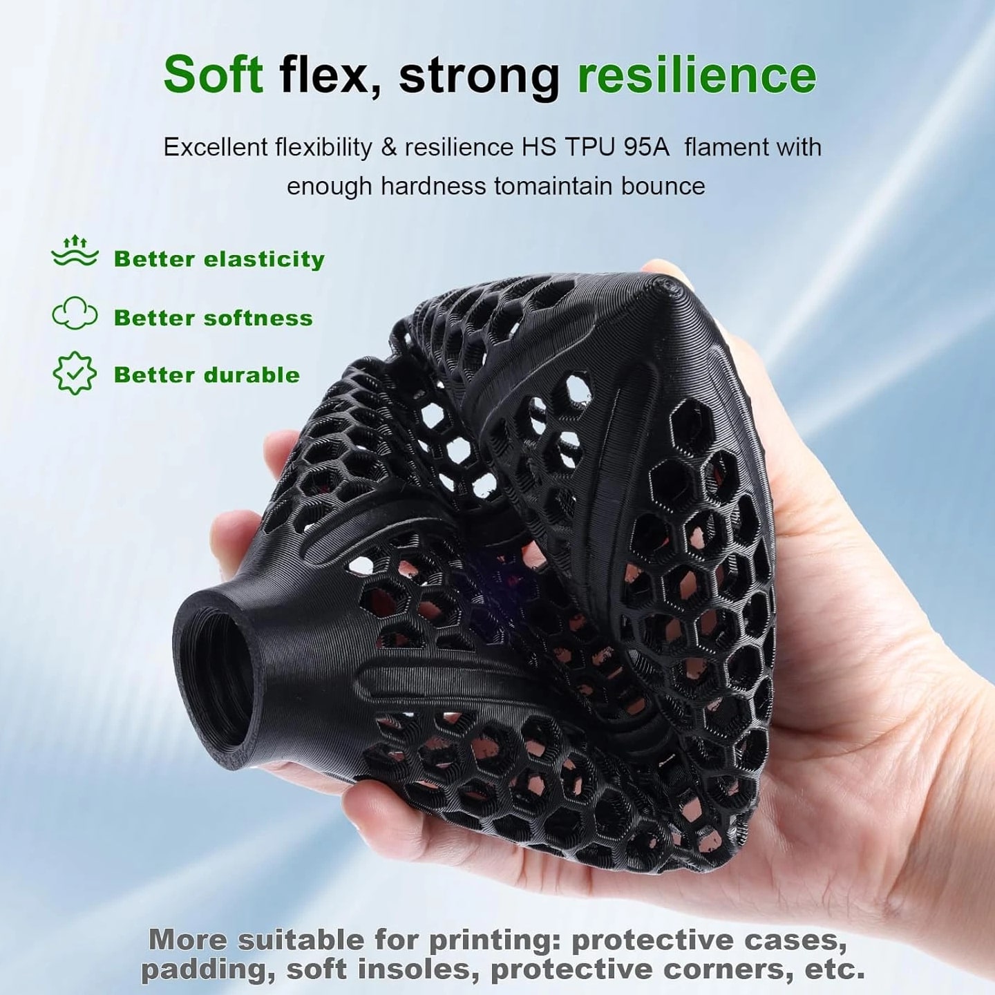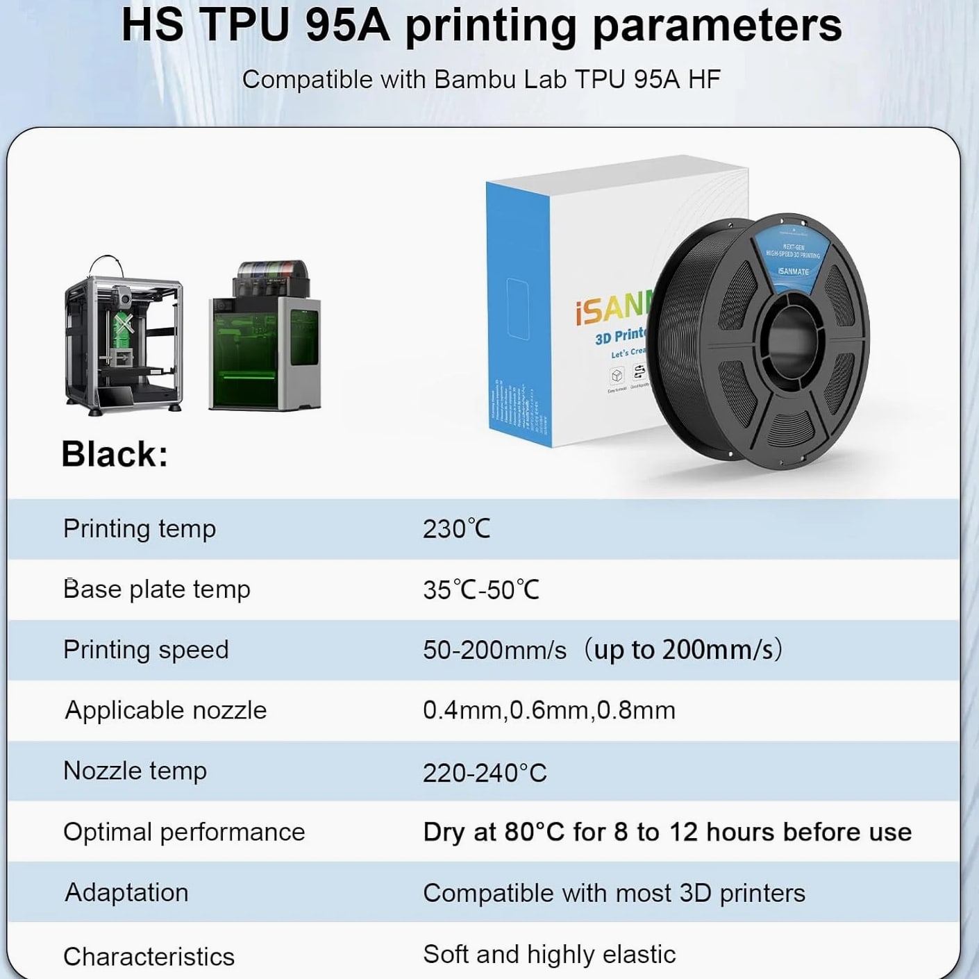 High-quality black TPU filament with excellent flexibility and elasticity, perfect for 3D printing projects requiring durability and impact resistance. HS TPU filament available in HF TPU 95A and TPU 85A, soft flex and strong resilience with hardness options to suit various applications. Our HS TPU 95A filament is compatible with Bambu Lab TPU 95A HF. It works with H2, X1, P1/P2, A1, and other printers without requiring special adjustments for basic printing needs. High-speed TPU printing capability allows faster print speeds (up to 200mm/s) without sacrificing quality. Vacuum packaging with desiccant bag keeps TPU filament dry and easy to use with minimal warping. TPU filament must be dry before printing. Flexible TPU filament with multiple color options to fit your needs, perfect for printing flexible parts such as phone cases, toys, gaskets, and other functional components. Flexible 3D printer filament with good layer adhesion and strength, suitable for both beginners and professional users. HF TPU 95A filament works perfectly with most 1.75mm FDM 3D printers. Each TPU filament 1kg spool is carefully inspected before shipment to ensure good quality. Product Description HS TPU Printer Filament About iSANMATE: Our obsession with quality has led us to develop a variety of industry materials - covering all 3D printing consumables from everyday PLA, TPU, PETG, ABS, PA, to high-performance ones. We have devoted all the art we have mastered to the production of filament. HF TPU Filament 95A About HS TPU 95A Printing Settings: Drying: 80℃ for 8-12 hours before use Printing Temp: 230℃ (recommended 230℃) Bed Temp: 35-50℃ (recommended 35℃) Print Speed: ≤200mm/s (50-200mm/s optimal) Nozzle Size: 0.4mm (recommended), 0.6mm, 0.8mm Filament Dimensional Accuracy: 1.75mm +/- 0.03mm Important Notice: When using TPU filament, pay attention to nozzle compatibility. Neither 0.2mm nozzles nor high-flow nozzles are suitable. Additionally, 85A TPU is incompatible with 0.4mm nozzles. Additionally, avoid using hot ends pre
