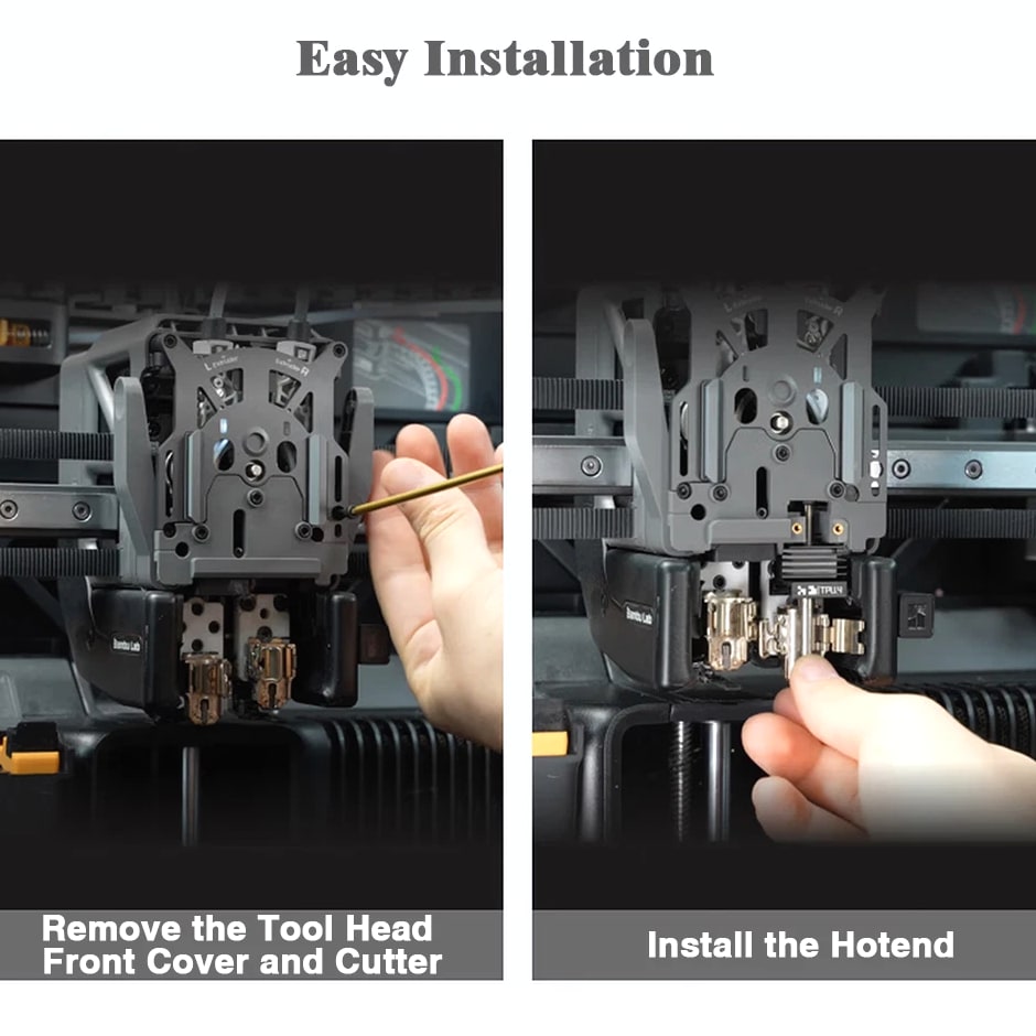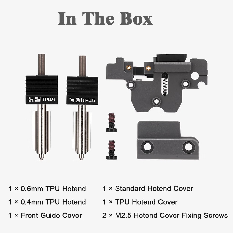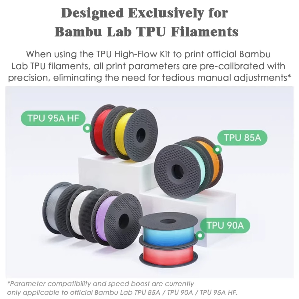 π§ͺ Bambu Lab H2D TPU High-Flow Kit Enhanced Flexible Filament Printing β 0.4mm & 0.6mm Hotends β Compatible Products Bambu Lab H2D (Exclusively) Not compatible with P1, X1, or A1 series printers. π¦ In The Box 1 Γ 0.6mm TPU Hotend 1 Γ 0.4mm TPU Hotend 1 Γ Front Guide Cover 1 Γ Standard Hotend Cover 1 Γ TPU Hotend Cover 2 Γ M2.5 Hotend Cover Fixing Screws Note: Printer not included. π Product Overview The Bambu Lab H2D TPU High-Flow Kit is a specialized upgrade designed to unlock the full potential of flexible filaments on your H2D printer. Unlike standard hotends, this kit features dedicated components with optimized internal geometry to drastically increase volumetric flow rate for TPU, TPE, and other flexible materials. It includes two hotends (0.4mm & 0.6mm) and a required TPU-specific hotend cover to ensure reliable, clog-free printing. β¨ Key Features π High-Flow TPU Optimization Dedicated Geometry: The TPU hotends feature a unique internal structure that reduces back-pressure and increases flow rate. Two Nozzle Sizes: Includes 0.4mm for fine details and 0.6mm for faster prints. π‘οΈ Required Protective Cover The kit includes a TPU Hotend Cover that must be used with the TPU hotend. This cover is structurally different from the standard cover to ensure proper filament guidance and thermal performance. π Right-Nozzle Restriction The TPU hotend is engineered exclusively for the RIGHT nozzle of the H2D. Installing it on the left nozzle will interfere with the lifting mechanism. β οΈ Limitations & Precautions βοΈ Technical Specifications π‘ Usage Tips Right-Side Installation: Always install the TPU hotend on the right nozzle of your H2D. Cover Match: Ensure you use the TPU-specific cover included in this kit; do not mix with the standard hotend cover. Manual Handling: Since the cutter is disabled, you will need to manually trim the filament after printing. Filament Check: Double-check that your filament roll is a soft, flexible TPU before loading.