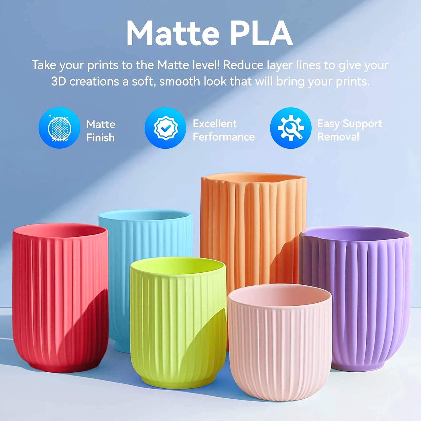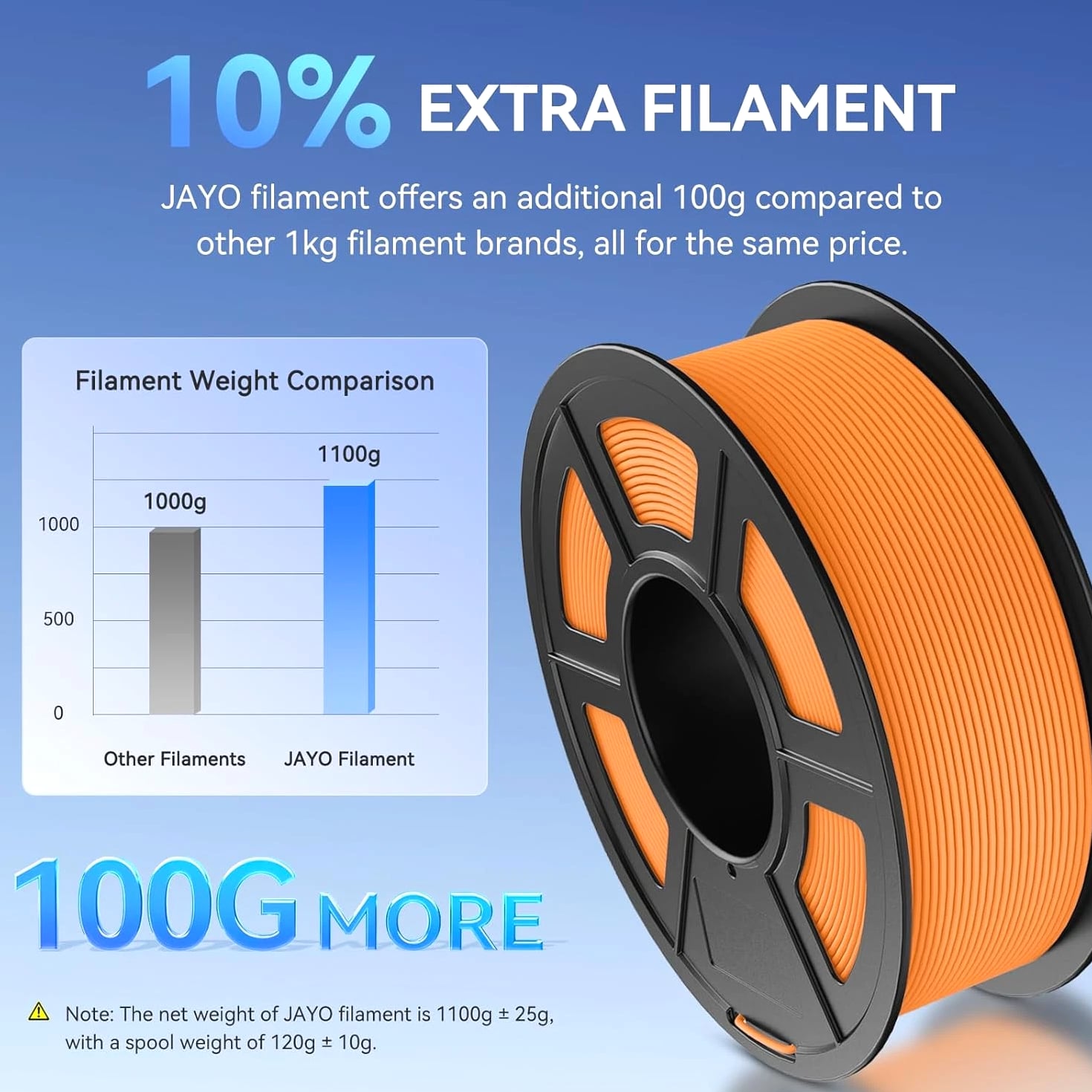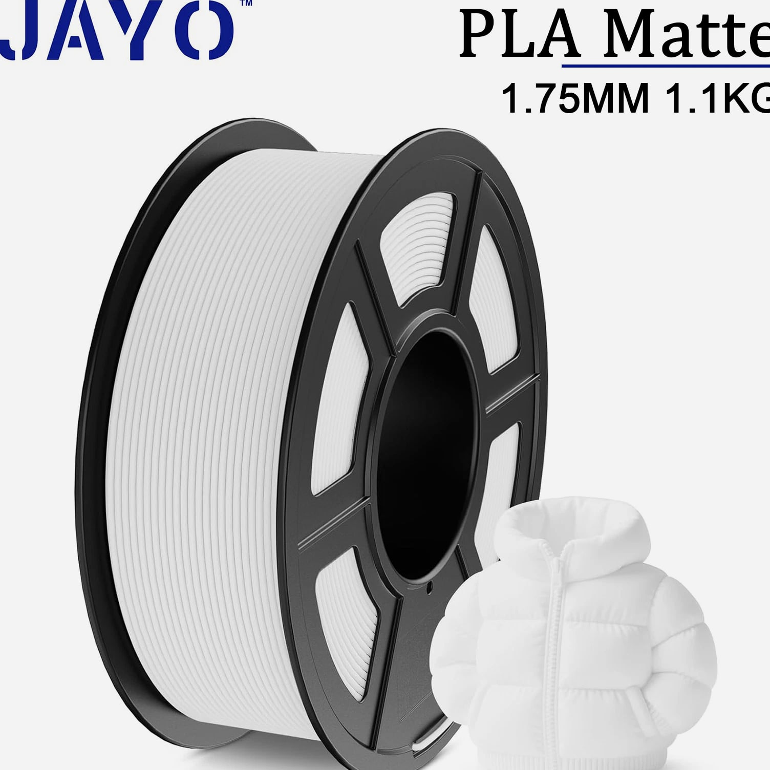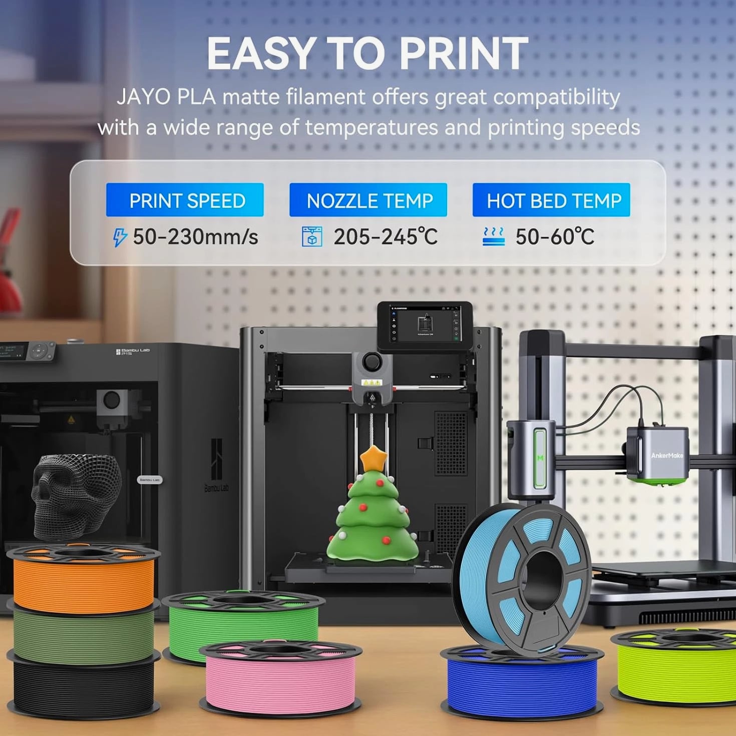 Matte PLA Filament MATTE FINISH: MATTE PLA produces a matte, low-gloss finish, creating a frosted texture that hides layer lines. Ideal for creations that require a sophisticated and flawless appearance. EASY TO PRINT: Matte PLA offers superior drapability and supports more complex designs. Rafts, edges, and tree supports are easily removed. MORE FILAMENT, MORE VALUE: JAYO matte pla filament offers 100 grams more than other brands and allows up to 10% more prints per roll, providing a cost-effective solution for your 3D printing projects. NO CLOGS, NO BUBBLES: Our pla matte filament has a +/- 0.02mm tolerance for smooth feeding and extrusion, preventing clogging. Each roll is dried for 24 hours and vacuum sealed for best results. TROUBLE-FREE WINDING: Precisely wound to prevent tangles and breakage, with included filament clips for safe, organized storage. Recommended nozzle temperature: 205°C - 245°C
