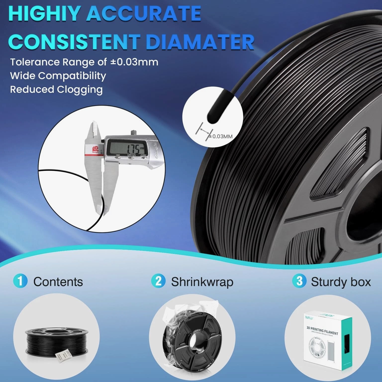 Flexible 95A TPU Filament 1.75mm Recommend Settings Nozzle/Extrusion temperature: 195-205℃; Bed/Platform temperature of 50-60℃; Printing speed: 20-40mm/s; These settings are for 0.4mm nozzle, it may be different with different diameters nozzle. 3 Steps Checking: Why is the Filament Not Sticking to the build bed? Temperature Checking - Please check the temperature (bed and nozzle) settings before printing and set it suitable; Building Bed Checking - Please check if the bed is level, make sure the nozzle doesn't too far or too close to the bed; Speed Checking - Please check if the printing speed of the first layer is too fast. Notes Please insert the filament into the side holes after use to avoid tangles; Please store the 3D printer filament in a sealed bag or box after using it. 【TPU for Rapid Printing】- Fast Speed TPU Filament can print 3 times faster than ordinary TPU filaments, strikes the ideal balance between softness and resilience. Perfect for flexible applications, robotics, and fashion projects. 【TPU 3D Printing Filament】- TPU filament is made of flexible thermoplastic polyurethane, featuring Shore hardness of 95A, and items printed with it can easily withstand severe collisions during sports and wear and tear in daily use. 【Excellent Layer Adhesion】- Setting the standard for impeccable layer adhesion and delivering impressive results. TPU features optimal layer bonding and a flawlessly smooth finish 【Superior Printed Results】- TPU filament 1.75mm has excellent layer adhesion, very easy to print. TPU filament is wear-resistant, oil-resistant, good elasticity, anti-aging, color, no bubble. 【TPU Recommend Settings】- We recommend printing at a nozzle temperature of 210-230°C, bed temperature of 50-60°C, printing speed of 80-120mm/s, faster and better. 【TPU 1.75mm Diameter】- Dimensional Accuracy +/- 0.03mm. filament has wide compatibility due to the small diameter error, it's suitable for almost all 1.75mm FDM 3D printers. 【Multiple Colors Available】- TPU filament of