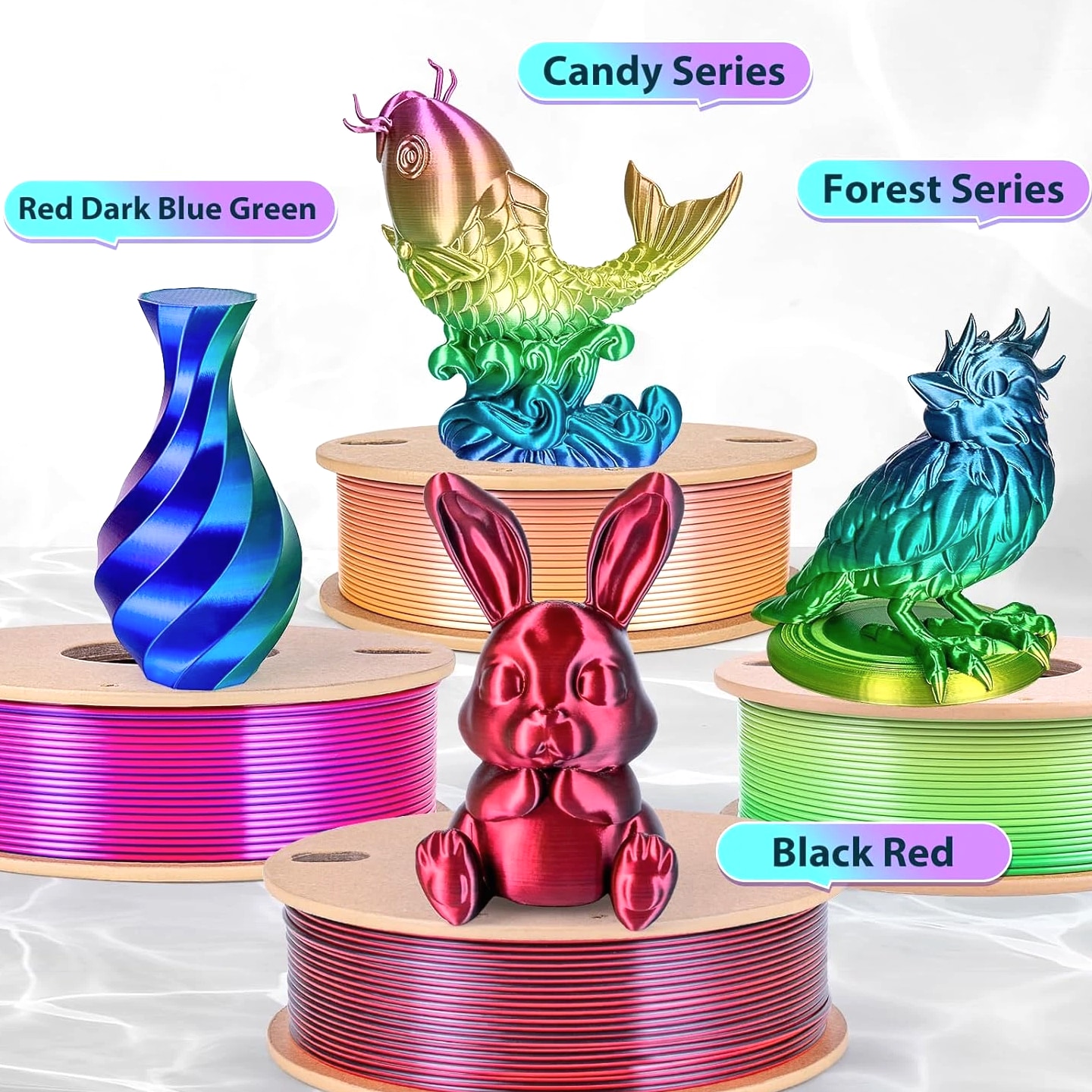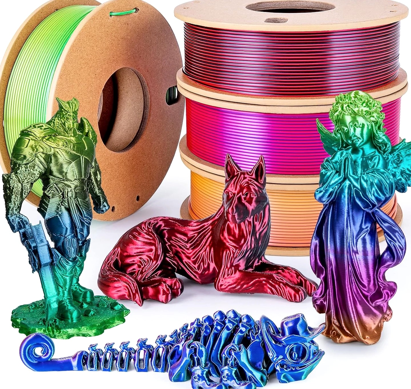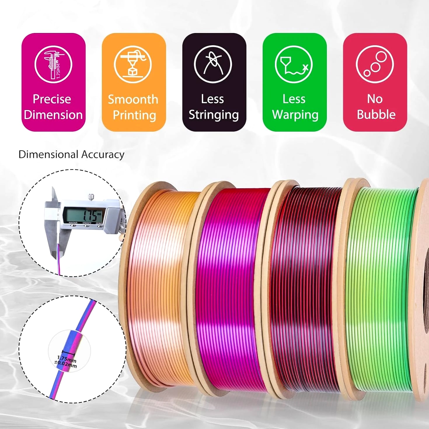 Silk Rainbow PLA Filament 1.75mm Silk PLA 3D Printer Filament Shiny Fast Color Changing Gradient Filament 3D Printing Filament Compatible with Most FDM Printers, 250G X 4 Gradient Multiple Spools, 4Pack Description Unit Count 35.274 Ounce Item Diameter 1.75 Millimeters Number of Items 4 Color Candy+forest+universe+red Blue Green+black Red Material Polylactic Acid Material Type Polylactic Acid Item Weight 3.3 Pounds Additional Features Color-changing gradient, multiple spools Size 250g 250G X 4 COLORS PACK: Comes with 4 different colors (candy gradient series, forest gradient series, red dark blue green, black red), you can create your 3d world with this silk multicolor PLA filament pack. Each color weighs 250g, providing a total of 1kg. NEATLY ARRANGED & SMOOTH PRINTING: 3Dgenius 3d printer filament 1.75mm PLA are neatly arranged by full mechanical winding. The 1.75mm pla filament bundle has less tangle and it's easy to use. With the neatly arranged technology, the pla filament can avoid possible thread pulling, twisting or line breaking, it will make your printing smoother. HIGH DIMENSIONAL ACCURACY: 3Dgenius 3d printing filament bundle adopts advanced CCD diameter measuring and self-adaptive control system, which guarantees the diameter accuracy of 1.75mm PLA filament +/- 0.03 mm. The minimum dimensional tolerance ±0.03mm will make the fusion between the layers very good to obtain an even better bridging result. HUMANISED DESIGN & ECO-FRIENDLY: The PLA filament bundle comes with length and weight scale on the spool, which is easy for you to monitor. The 1.75mm PLA filament is made from starch raw materials derived from renewable plant resources. No odor, no pollution and non-toxic during the printing. NO CLOGGING & NO BUBBLE: 3Dgenius 3d printer filament PLA features 100% vacuumed package. The PLA filament pack completely dried for 24 hours before packaging and then vacuum sealed with desiccants to effectively protect the filament from moisture, no stringing and bubble-free.