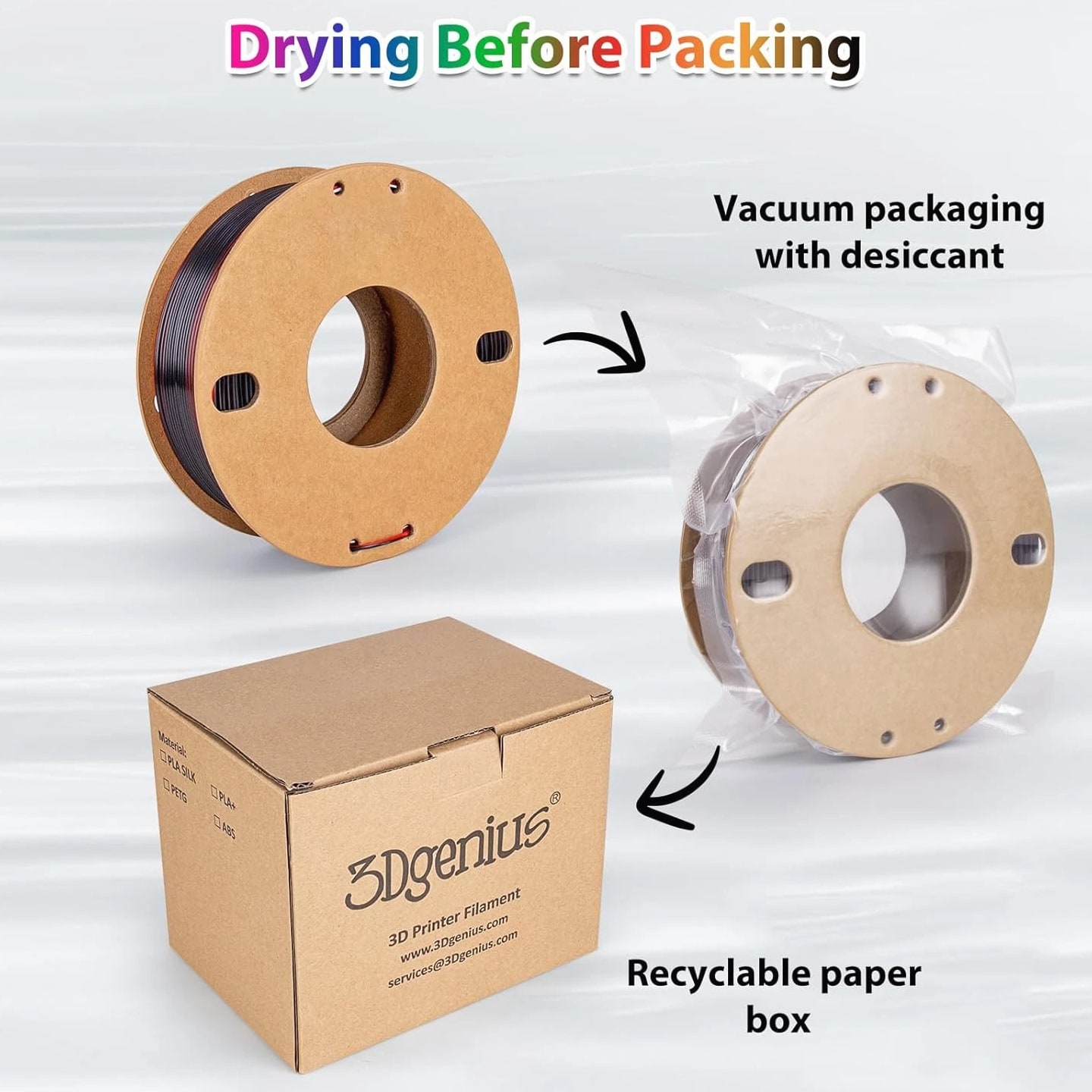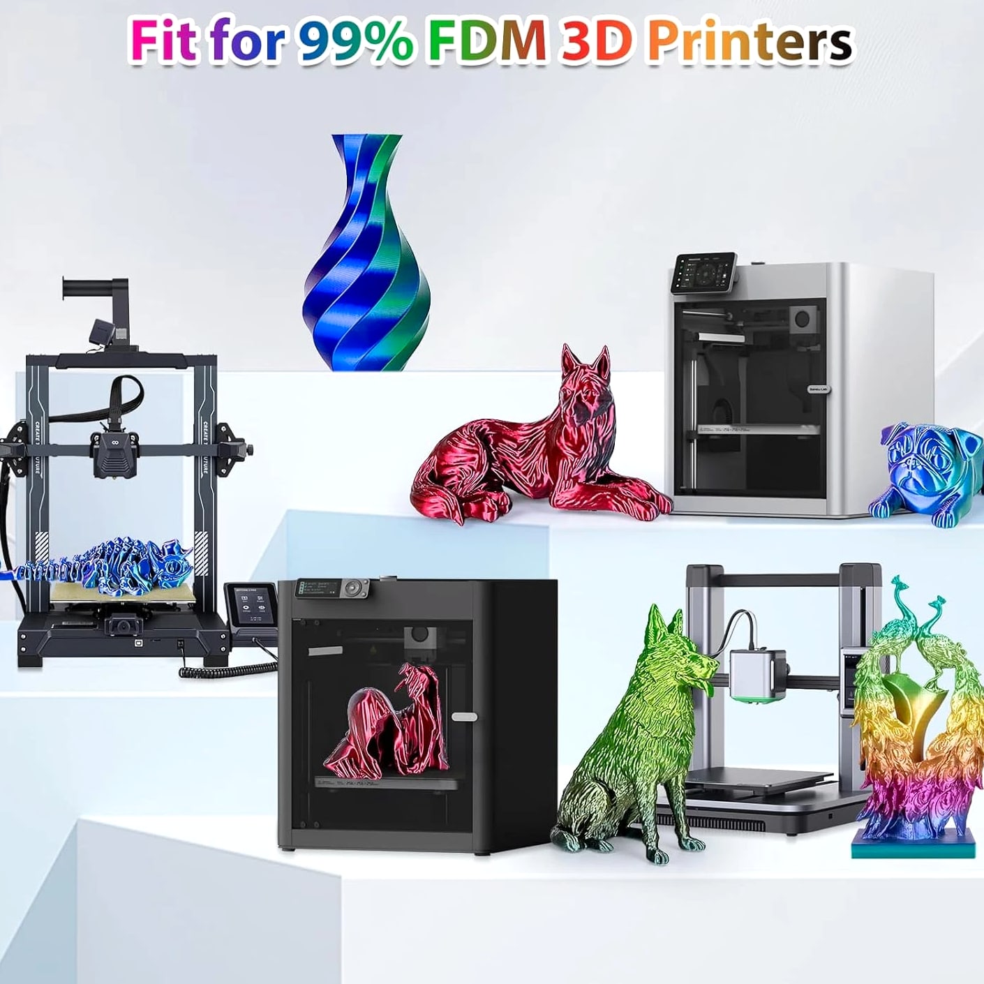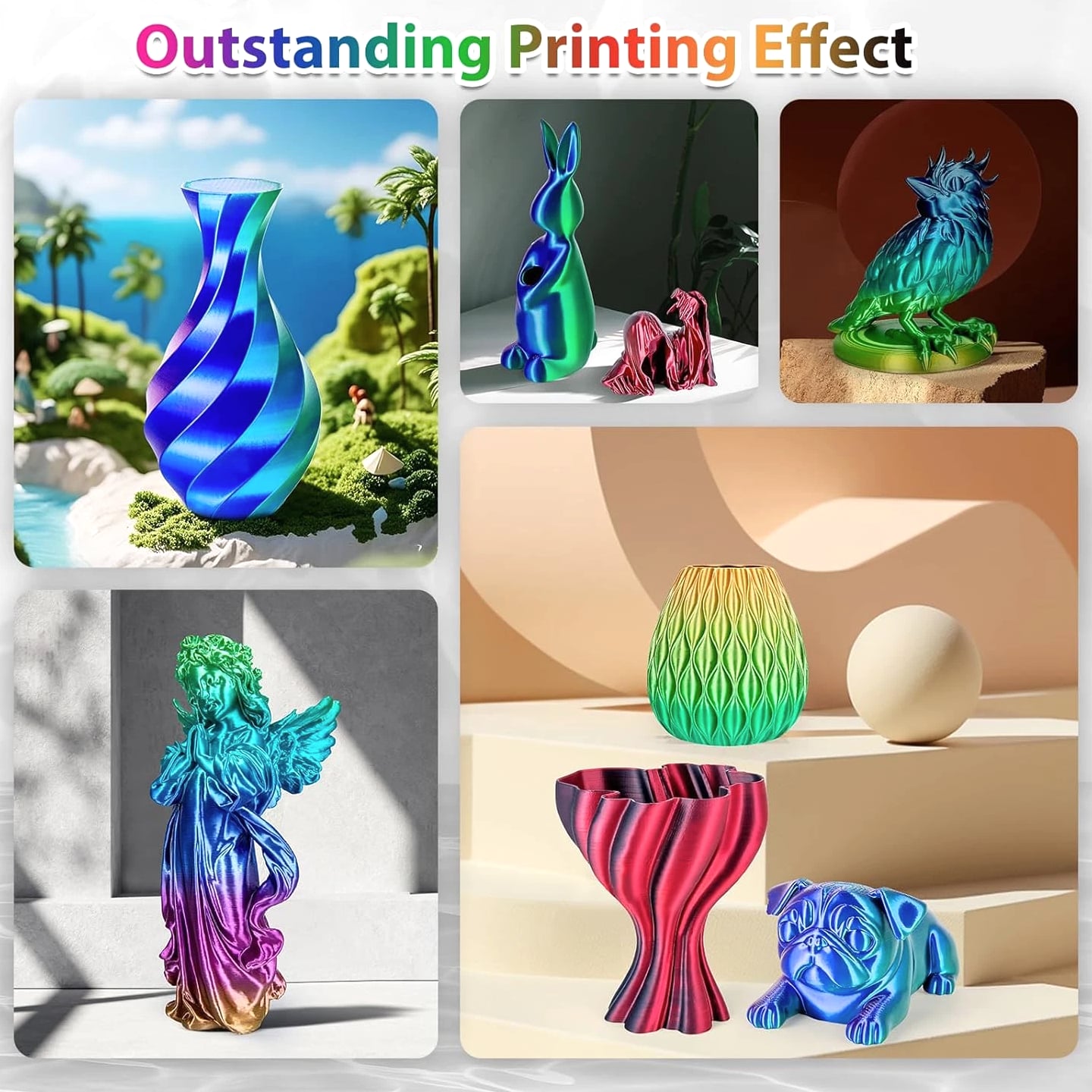 Silk Rainbow PLA Filament 1.75mm Silk PLA 3D Printer Filament Shiny Fast Color Changing Gradient Filament 3D Printing Filament Compatible with Most FDM Printers, 250G X 4 Gradient Multiple Spools, 4Pack Description Unit Count 35.274 Ounce Item Diameter 1.75 Millimeters Number of Items 4 Color Candy+forest+universe+red Blue Green+black Red Material Polylactic Acid Material Type Polylactic Acid Item Weight 3.3 Pounds Additional Features Color-changing gradient, multiple spools Size 250g 250G X 4 COLORS PACK: Comes with 4 different colors (candy gradient series, forest gradient series, red dark blue green, black red), you can create your 3d world with this silk multicolor PLA filament pack. Each color weighs 250g, providing a total of 1kg. NEATLY ARRANGED & SMOOTH PRINTING: 3Dgenius 3d printer filament 1.75mm PLA are neatly arranged by full mechanical winding. The 1.75mm pla filament bundle has less tangle and it's easy to use. With the neatly arranged technology, the pla filament can avoid possible thread pulling, twisting or line breaking, it will make your printing smoother. HIGH DIMENSIONAL ACCURACY: 3Dgenius 3d printing filament bundle adopts advanced CCD diameter measuring and self-adaptive control system, which guarantees the diameter accuracy of 1.75mm PLA filament +/- 0.03 mm. The minimum dimensional tolerance ±0.03mm will make the fusion between the layers very good to obtain an even better bridging result. HUMANISED DESIGN & ECO-FRIENDLY: The PLA filament bundle comes with length and weight scale on the spool, which is easy for you to monitor. The 1.75mm PLA filament is made from starch raw materials derived from renewable plant resources. No odor, no pollution and non-toxic during the printing. NO CLOGGING & NO BUBBLE: 3Dgenius 3d printer filament PLA features 100% vacuumed package. The PLA filament pack completely dried for 24 hours before packaging and then vacuum sealed with desiccants to effectively protect the filament from moisture, no stringing and bubble-free.
