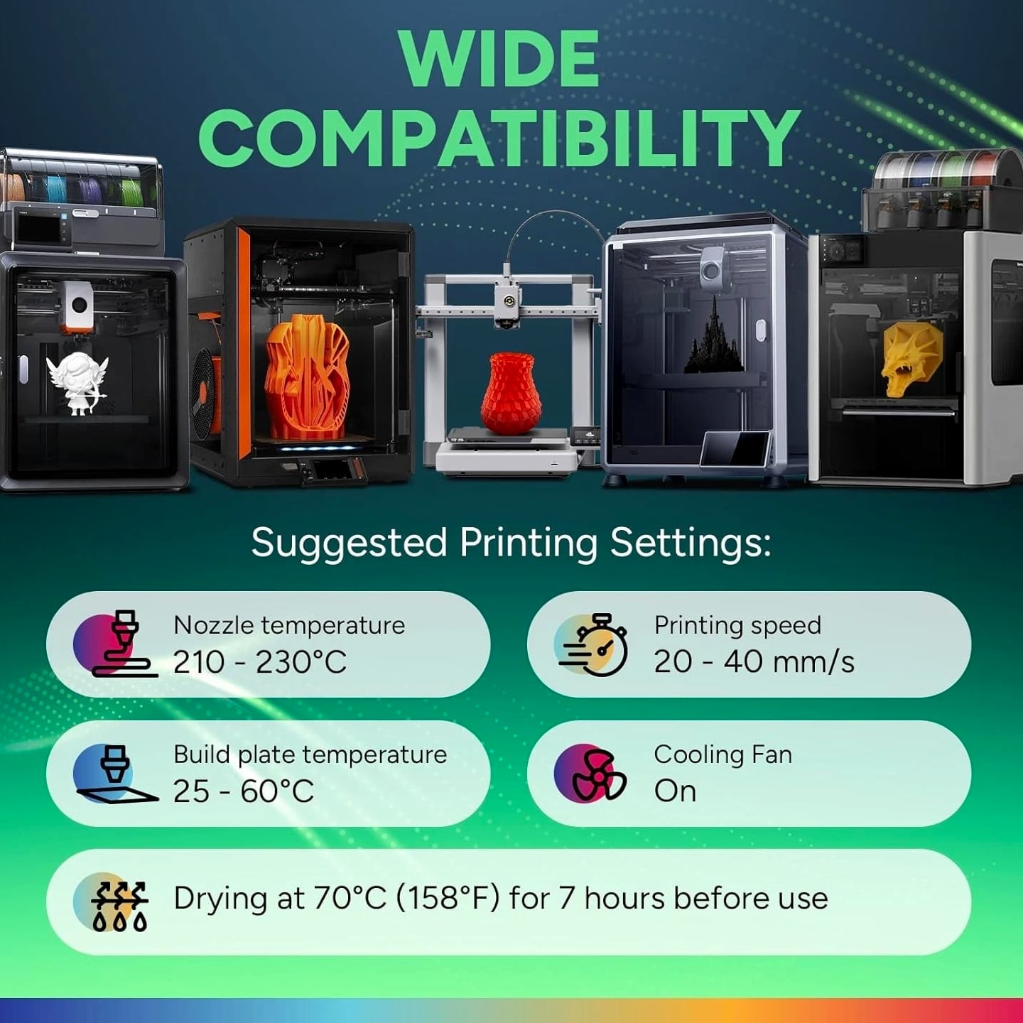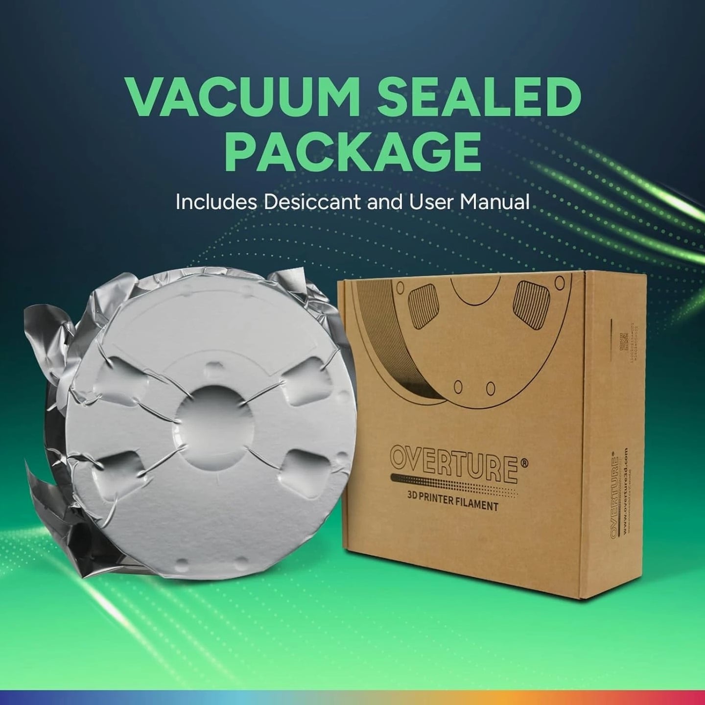 SEALED OVERTURE TPU Filament 1.75mm Flexible Roll, 95A Soft 3D Printer Filament, 1kg Spool (2.2 lbs), Fits Most FDM Printer (TPU Black) About this item 【High-Quality TPU Material】 Engineered for unparalleled flexibility and durability. Featuring Shore hardness of 95A, Overture TPU strikes the ideal balance between softness and resilience. Perfect for flexible applications, robotics, and fashion projects 【Excellent Layer Adhesion】 Setting the standard for impeccable layer adhesion and delivering impressive results. Overture TPU features optimal layer bonding and a flawlessly smooth finish 【Clog-Free & Bubble-Free】 Designed and manufactured with our patented clog-free formula to guarantee a smooth and seamless printing experience. All spools undergo thorough drying for 24 hours before packaging and are vacuum-sealed in resealable foil packaging. To maintain optimal performance, store TPU filament in sealed storage with desiccants (silica gel) or dry for >8 hours at 65˚C 【Broad Compatibility and Color Options】 Overture filaments seamlessly integrates with most consumer and industrial 3D printers. Explore your creative side with our extensive selection of vibrant colors, ensuring a spectrum of possibilities for your unique creations