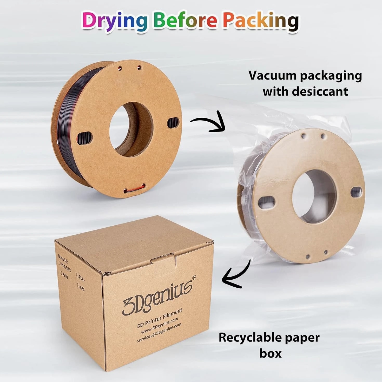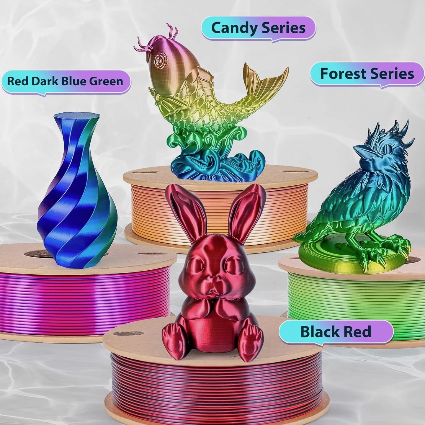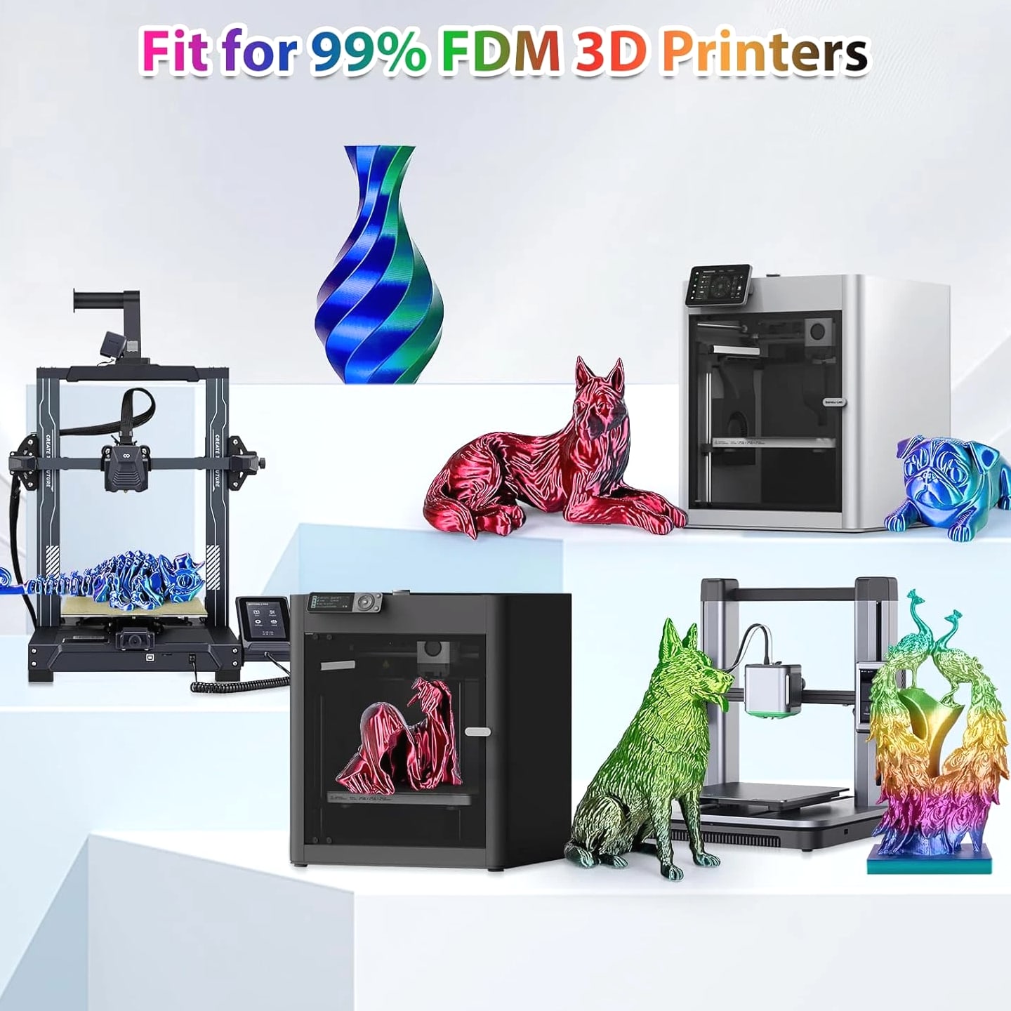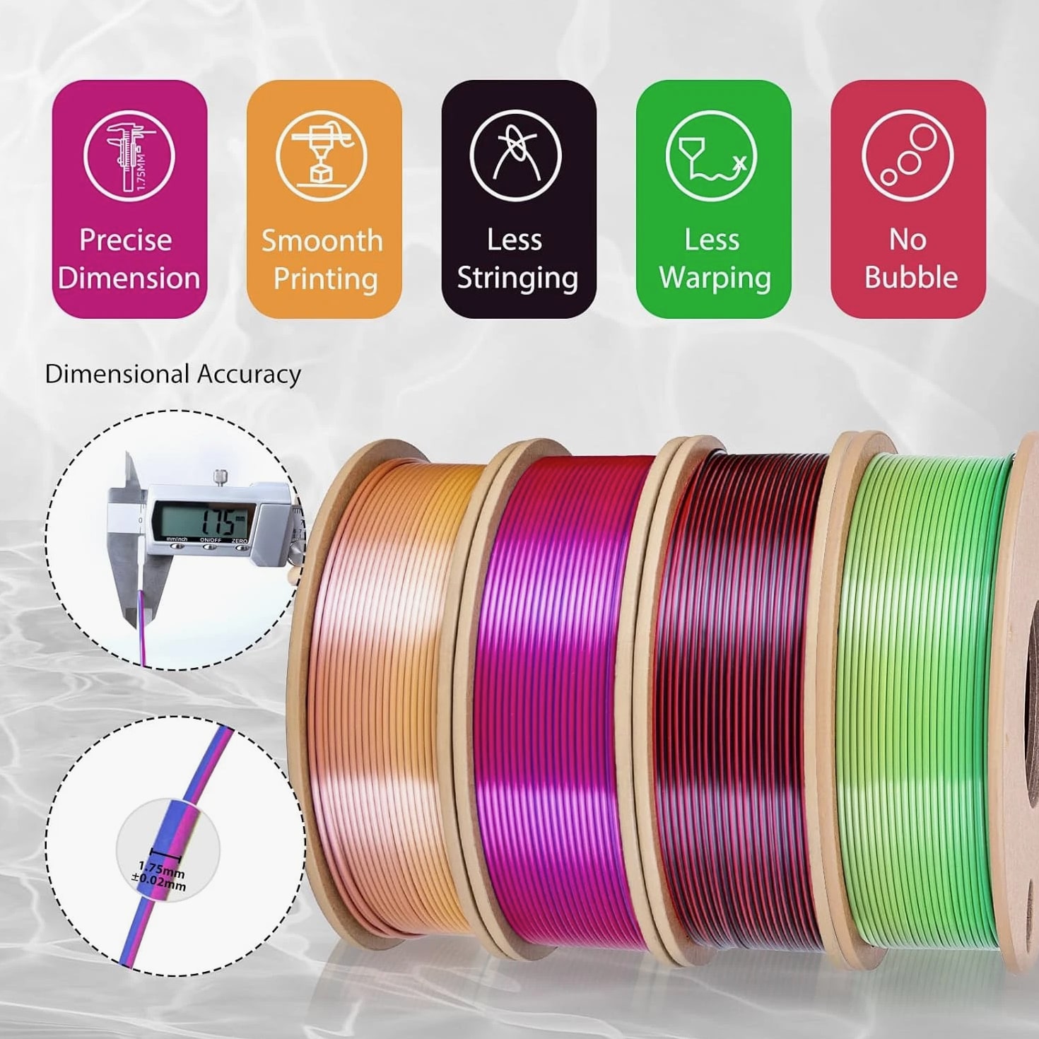 Silk Rainbow PLA Filament 1.75mm Silk PLA 3D Printer Filament Shiny Fast Color Changing Gradient Filament 3D Printing Filament Fit Most FDM Printers, 250G X 4 Gradient Multiple Spools, 4 Pack Description Material Polylactic Acid Color Candy+forest+universe+red Blue Green+black Red Item Diameter 1.75 Millimeters Item Weight 3.3 Pounds Size 250g 250G X 4 COLORS PACK - Comes with 4 different colors (candy gradient series, forest gradient series, red dark blue green, black red), you can create your 3d world with this silk multicolor PLA filament pack. Each color weighs 250g, providing a total of 1kg. NEATLY ARRANGED & SMOOTH PRINTING - 3Dgenius 3d printer filament 1.75mm PLA are neatly arranged by full mechanical winding. The 1.75mm pla filament bundle has less tangle and it's easy to use. With the neatly arranged technology, the pla filament can avoid possible thread pulling, twisting or line breaking, making your printing smoother. HIGH DIMENSIONAL ACCURACY - 3Dgenius 3d printing filament bundle adopts advanced CCD diameter measuring and self-adaptive control system, which guarantees the diameter accuracy of 1.75mm PLA filament +/- 0.03 mm. The minimum dimensional tolerance ±0.03mm will make the fusion between the layers very good to obtain an even better bridging result. HUMANISED DESIGN & ECO-FRIENDLY - The PLA filament bundle comes with length and weight scale on the spool, which is easy for you to monitor. The 1.75mm PLA filament is made from starch raw materials derived from renewable plant resources. No odor, no pollution and non-toxic during the printing. NO CLOGGING & NO BUBBLE - 3Dgenius 3d printer filament PLA features 100% vacuumed package. The PLA filament pack completely dried for 24 hours before packaging and then vacuum sealed with desiccants to effectively protect the filament from moisture, no stringing and bubble-free. 3Dgenius PLA filame WIDE COMPATIBILITY & PRINTING TIPS - 3Dgenius 1.75mm 3d printer Filament PLA is compatible perfectly with most FD